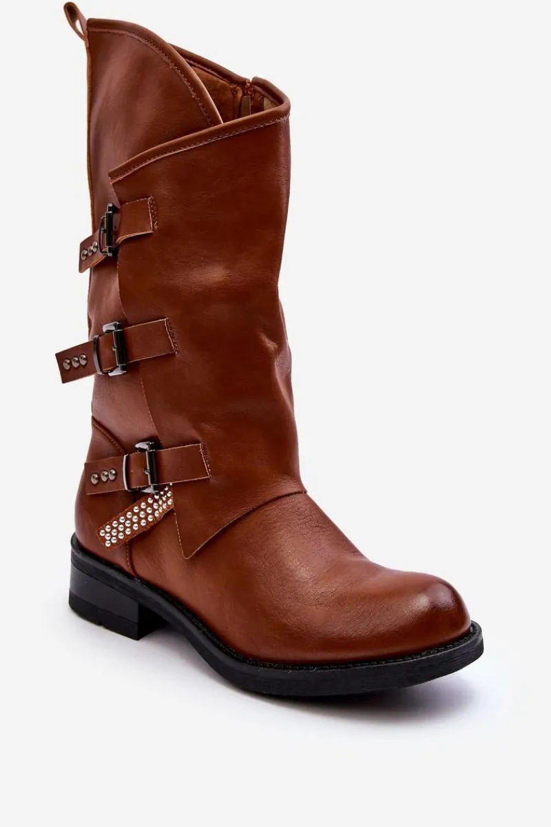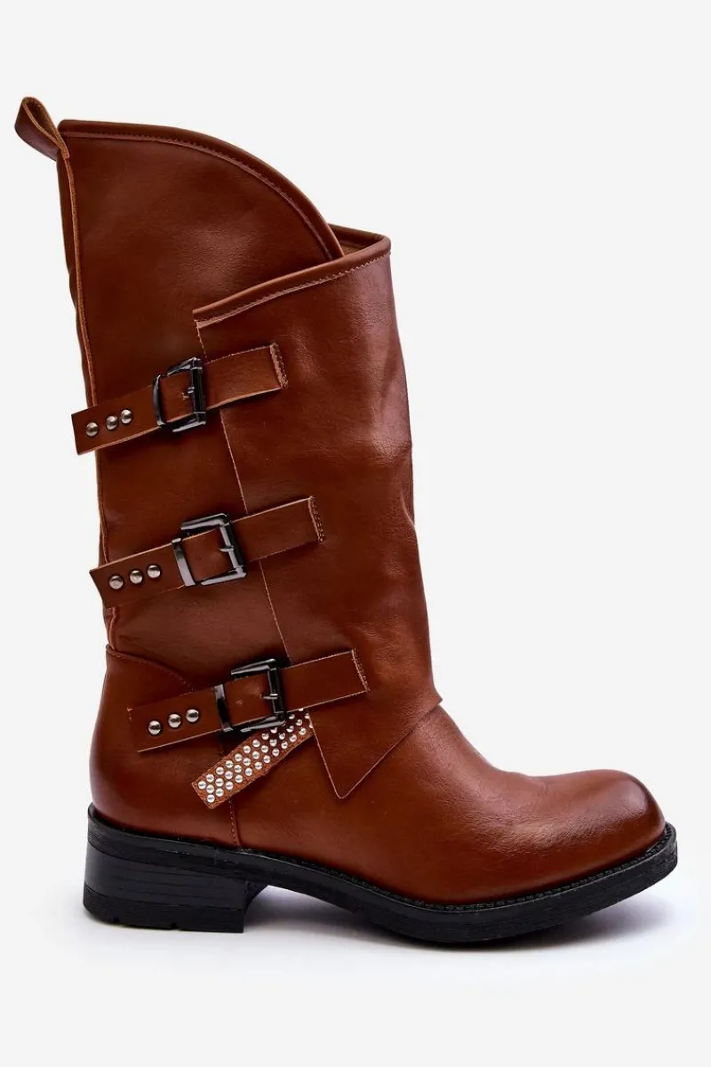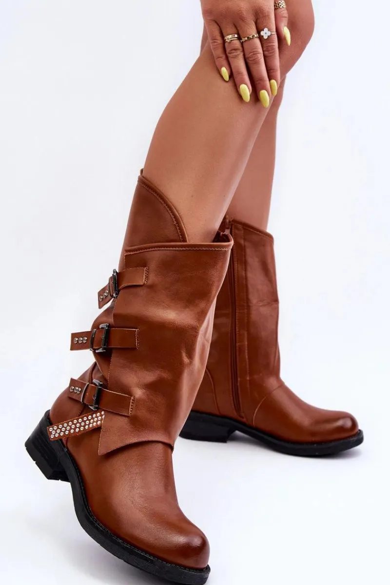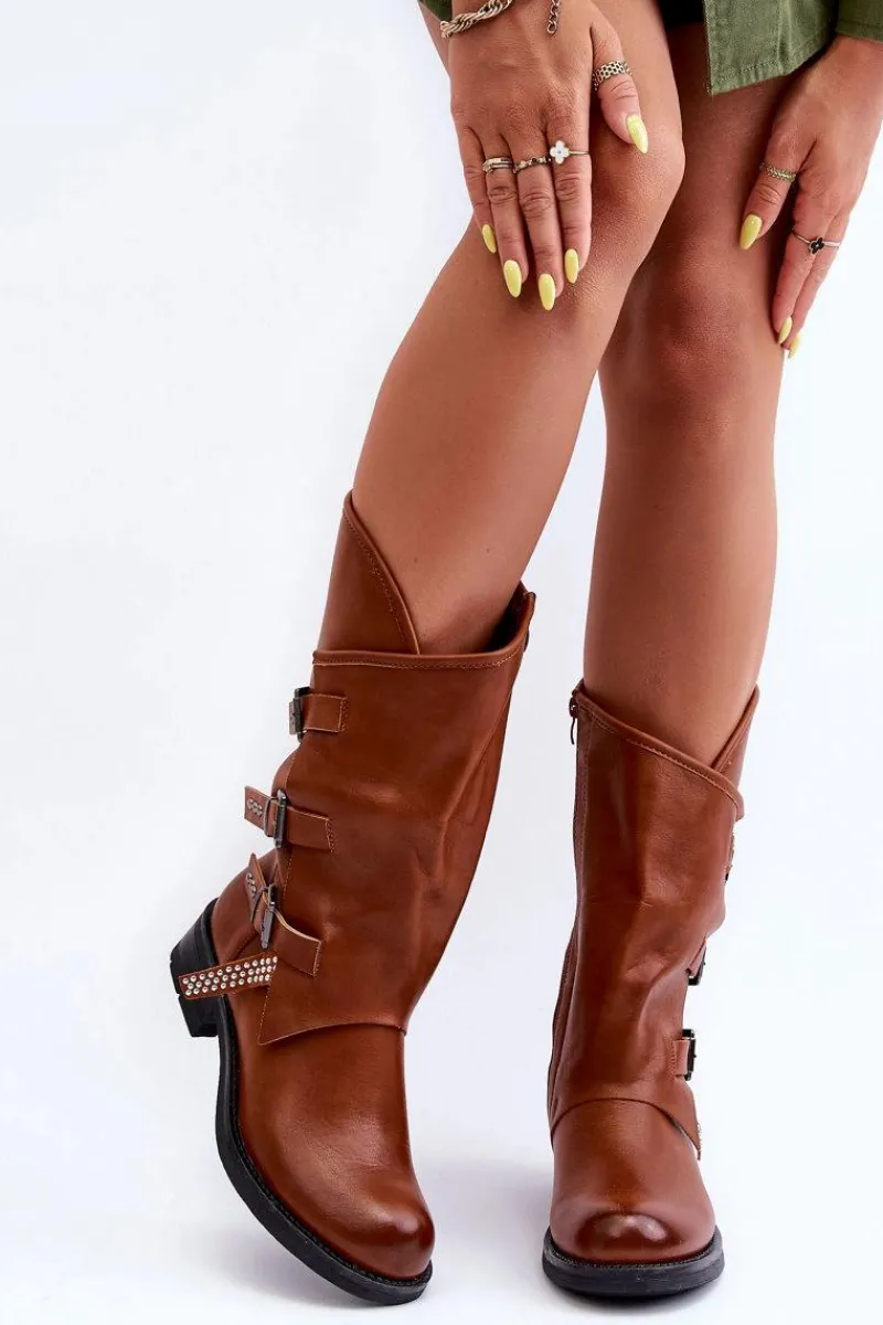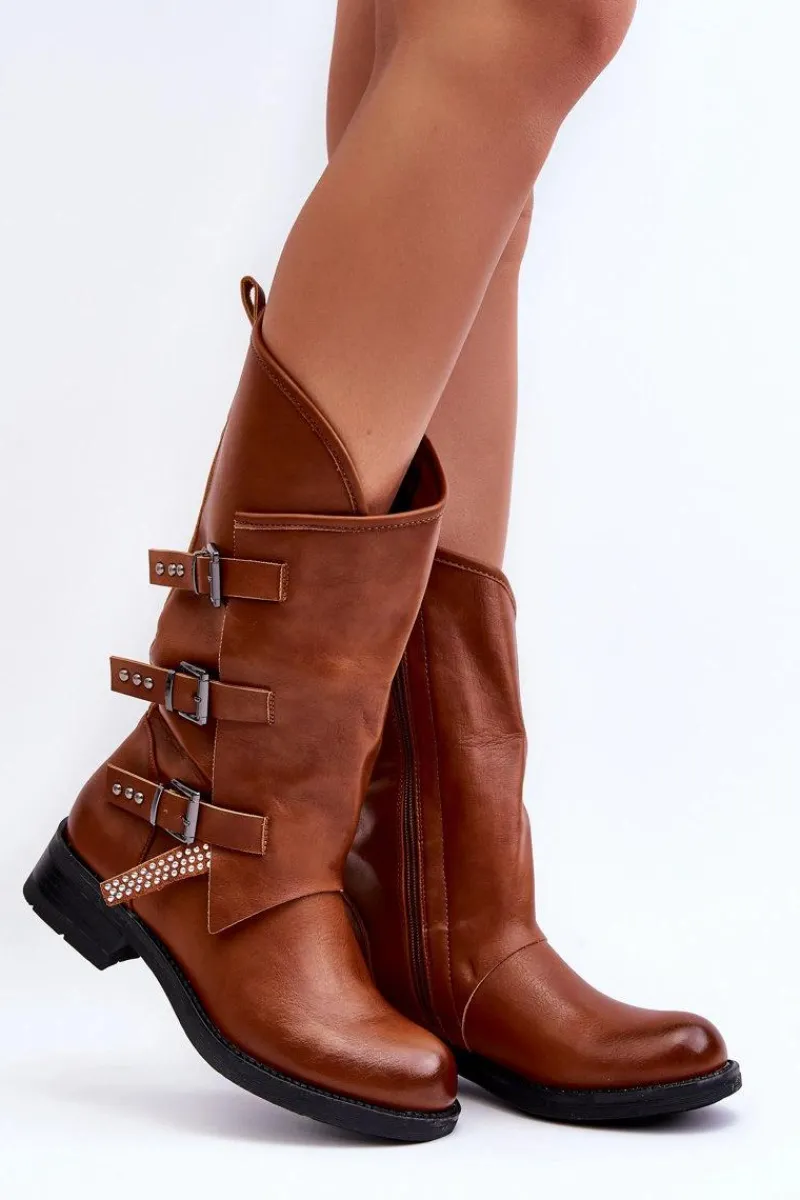 Klasyczne kozaki damskie wykonane z eko skóry. Osadzone na płaskim obcasie. Fason do połowy łydki zapinany na zamek. Miękka, materiałowa wkładka zapewni komfortowe użytkowanie. Na nieregularnej cholewce znajdują się ozdobne paski ze sprzączką. Przy wyborze rozmiaru prosimy kierować tabelą rozmiarów.