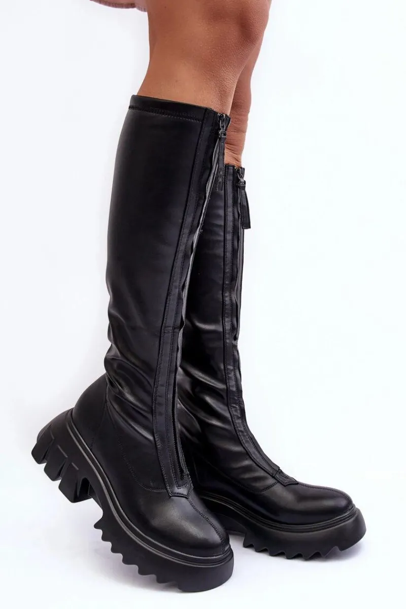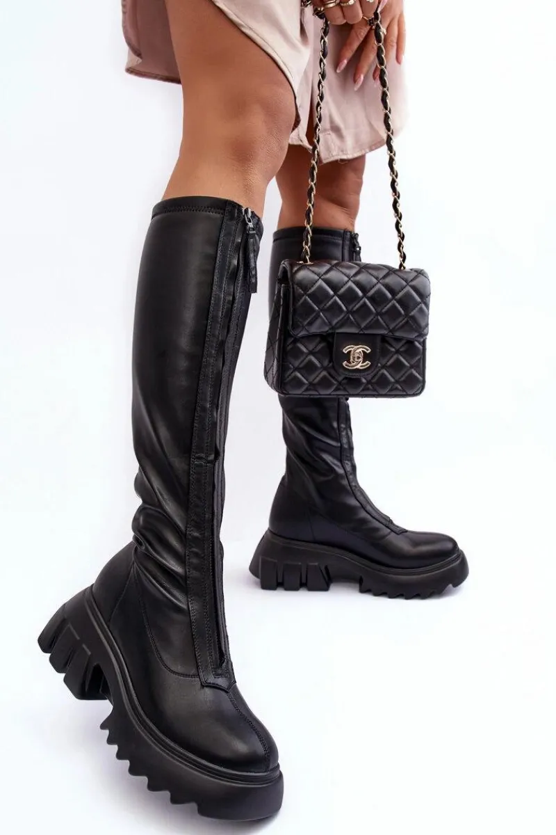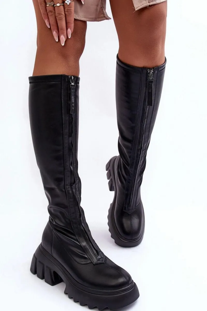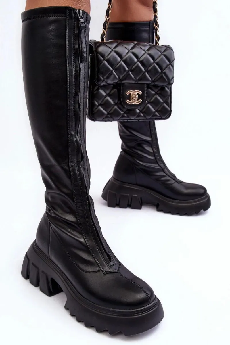 Modne, damskie kozaki do kolana. Wykonane z eko skóry. Osadzone na masywnej platformie i płaskim obcasie. Model zapinany na suwak, który znajduje się na całej długości cholewki z przodu. Zapiętek jest usztywniany, noski zaokrąglone. Środek ocieplony kocem obuwniczym. Przy wyborze rozmiaru prosimy kierować tabelą rozmiarów.