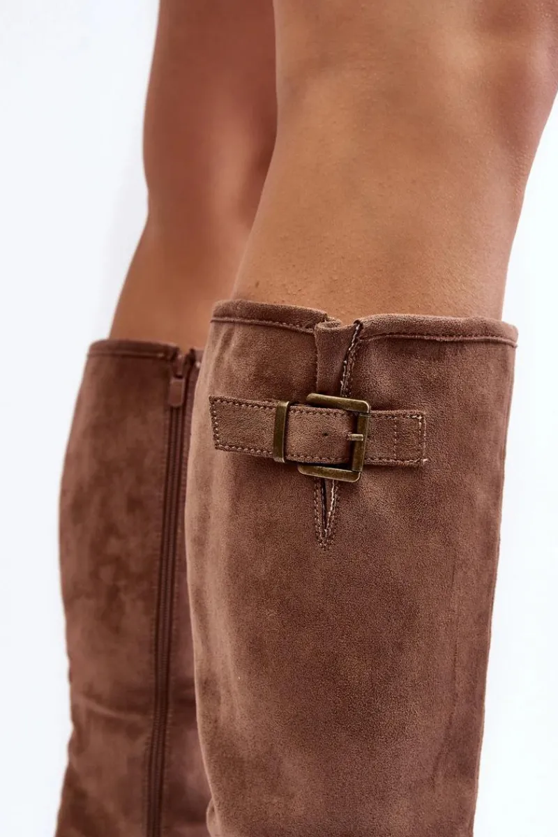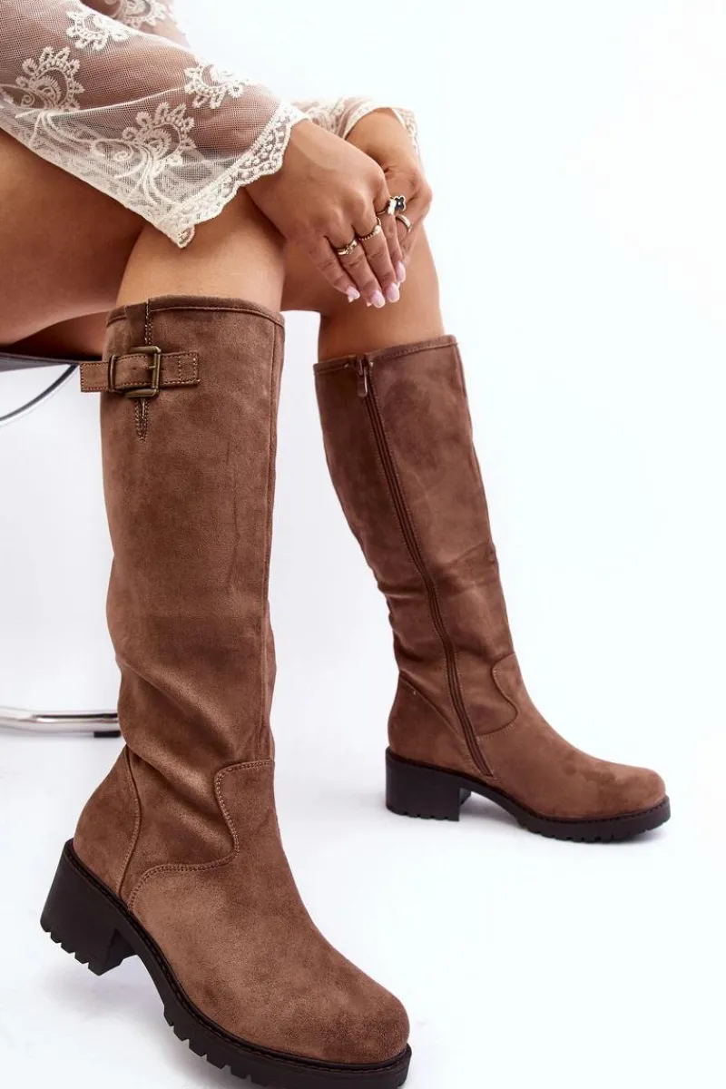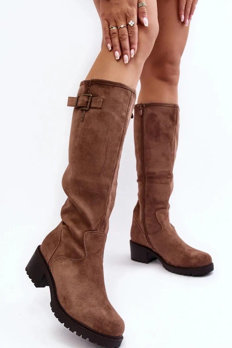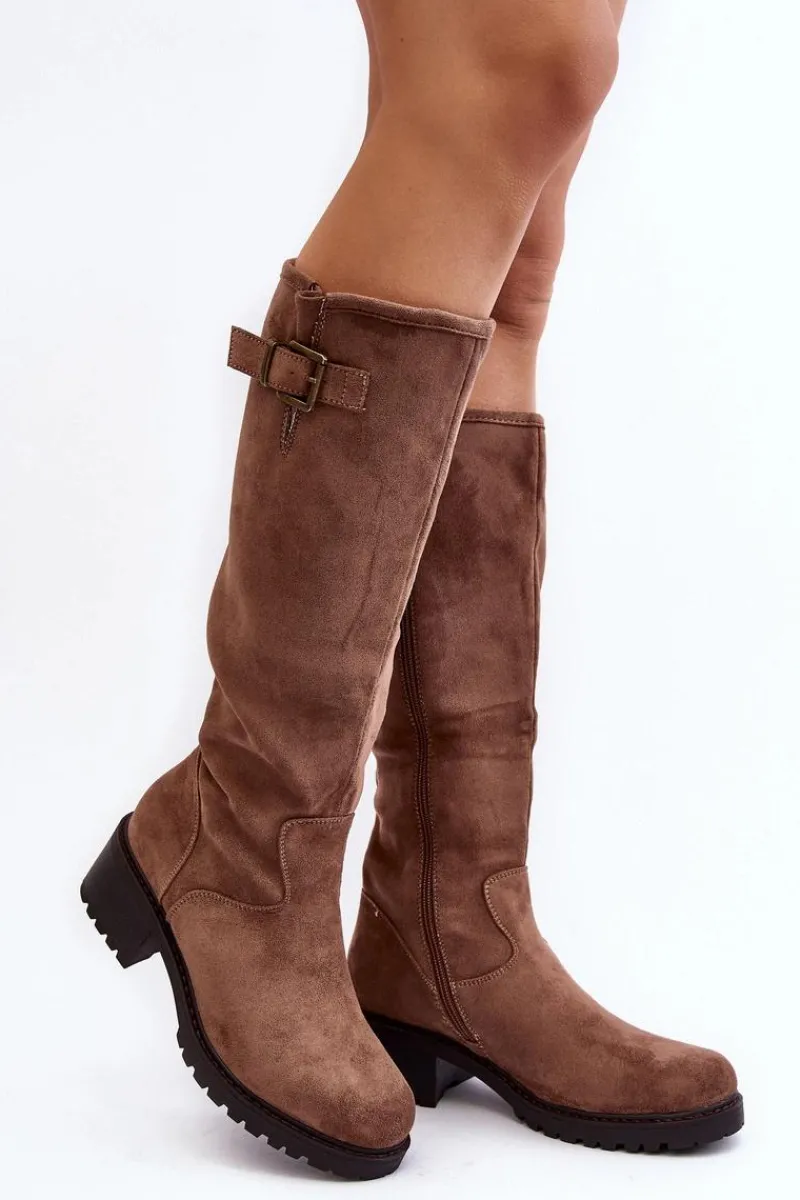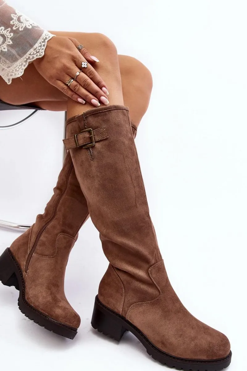 Klasyczne kozaki damskie na płaskim, stabilnym obcasie. Wykonane z eko zamszu. Cholewka przed kolano ozdobiona krótkim paskiem z klamrą. Środek ocieplony kocem obuwniczym. Noski zaokrąglone. Zapiętek usztywniony. Zapinane suwakiem. Model ten wykorzystasz do wielu jesienno-zimowych stylizacji! Przy wyborze rozmiaru prosimy kierować tabelą rozmiarów.