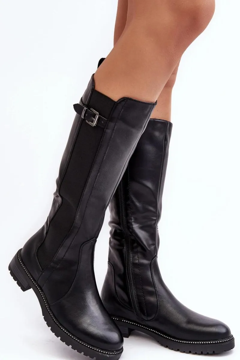 Damskie kozaki wykonane z eko skóry. Osadzone na płaskim, stabilnym obcasie. Zapinane suwakiem. Na cholewce elastyczna wstawka oraz pasek z klamrą. Noski zaokrąglone. Klasyczny fason sprawdzi się do wielu stylizacji! Środek ocieplony kocem obuwniczym. Przy wyborze rozmiaru prosimy kierować tabelą rozmiarów.