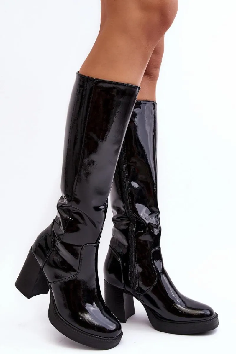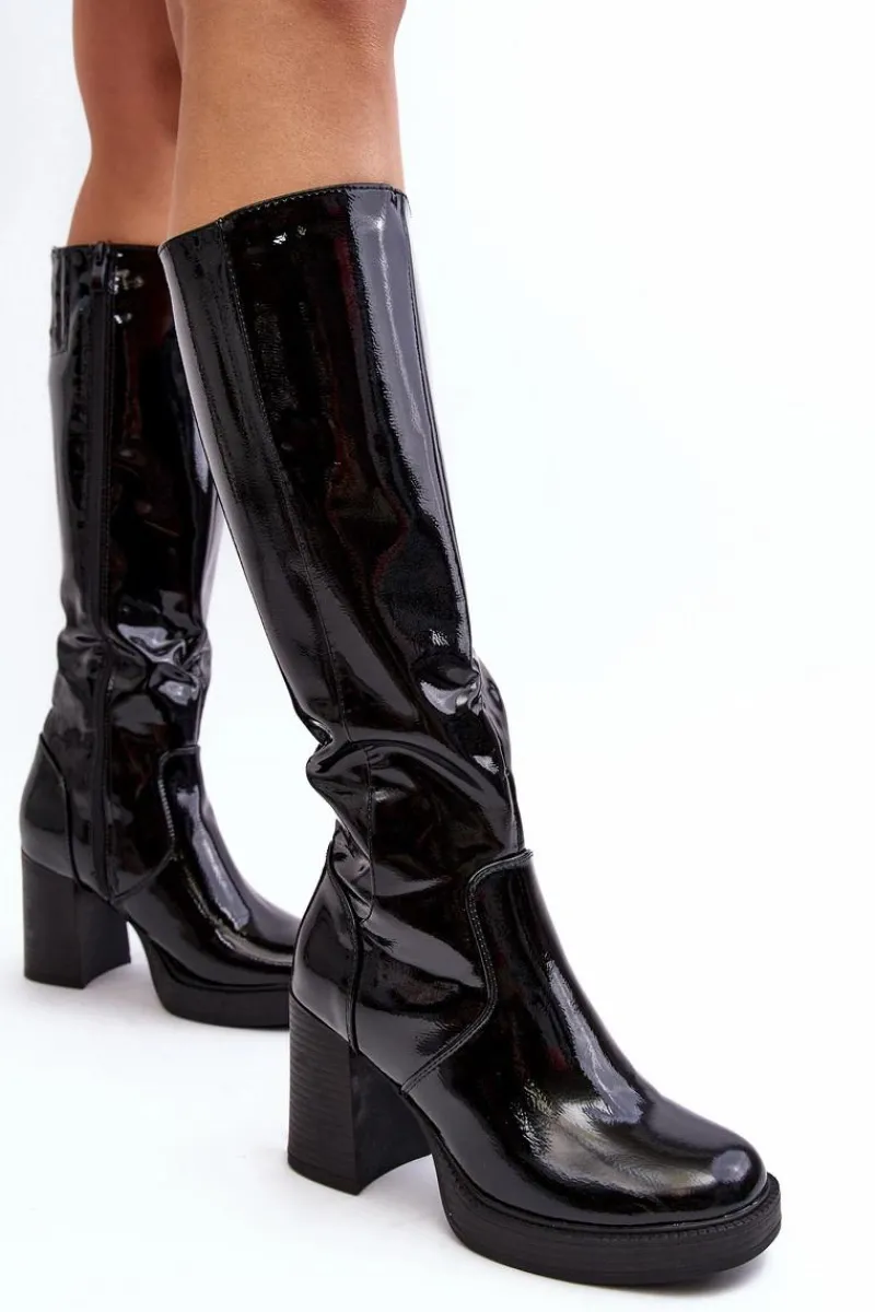 Modne kozaki damskie z cholewką do kolana. Wykonane z eko skóry. Osadzone na obcasie w postaci słupka. Zapinane na suwak z boku. Noski zaokrąglone. Usztywniony zapiętek. Eko skórzana wkładka zapewni komfort użytkowania. Idealny model zarówno do sukienek, jak i spodni! Przy wyborze rozmiaru prosimy sugerować się tabelą rozmiarów.