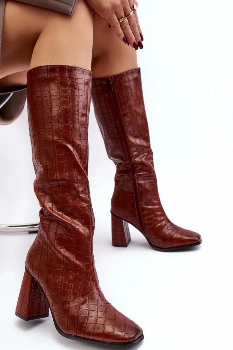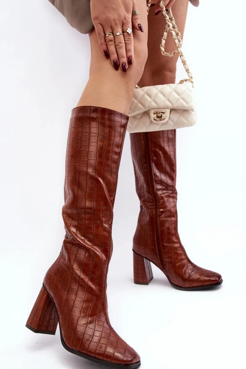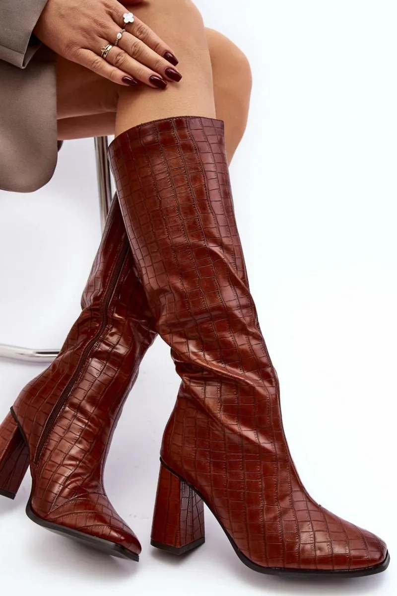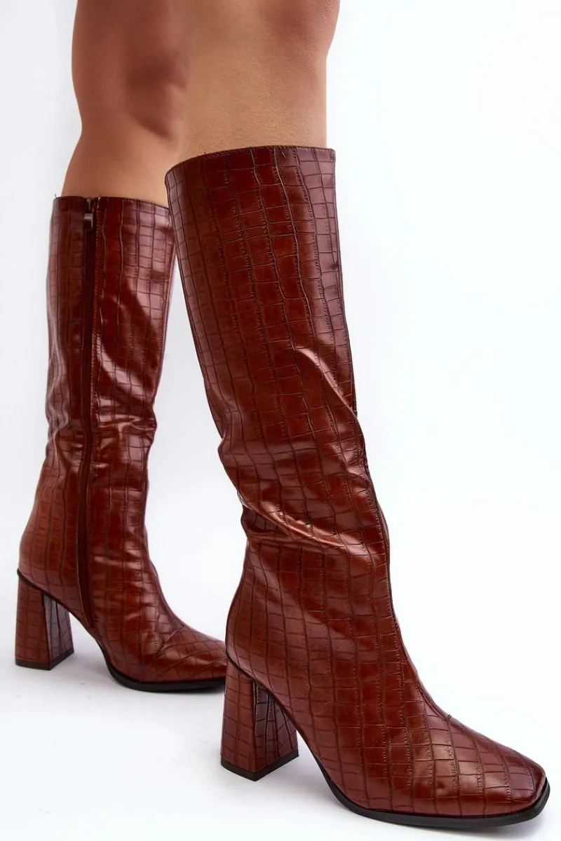 Stylowe kozaki to doskonałe uzupełnienie jesienno-zimowej garderoby. Zostały wykonane z eko skóry. Cholewka do kolana z ozdobnym tłoczeniem. Zapinane na suwak. Kwadratowe noski nadają im charakteru, a ocieplenie kocem obuwniczym sprawia, że są idealnym wyborem na chłodniejsze dni. Przy wyborze rozmiaru prosimy sugerować się tabelą rozmiarów.