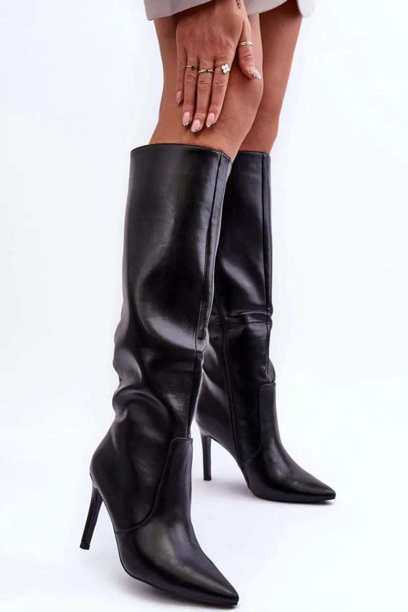 Kozaki damskie zostały wykonane z eko skóry. Posiadają na całej długości suwak ułatwiający zakładanie obuwia. Buty osadzone na obcasie w postaci szpilki. Posiadają ocieplenie w postaci koca obuwniczego. Noski w szpic optycznie wysmuklą nogi. Zapiętek w tych kozakach jest usztywniany. Model ten powinien znaleźć się w Twojej szafie! Przy wyborze rozmiaru prosimy sugerować się tabelą rozmiarów.
