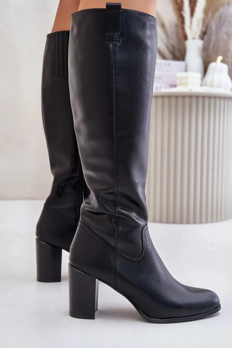 Eleganckie skórzane kozaki przed kolano to doskonała propozycja na chłodniejsze dni. Wykonane ze skóry naturalnej. Ocieplane wnętrze zapewnia ciepło i komfort. Model zapinany na zamek dla wygody zakładania. Obcas słupek dodaje stylowego podkreślenia sylwetki. Noski w migdał. Ten elegancki fason idealnie dopełni stylizacje z sukienkami i spódnicami! Przy wyborze rozmiaru prosimy sugerować się tabelą rozmiarów.