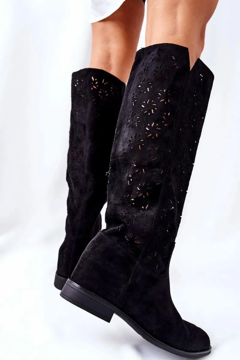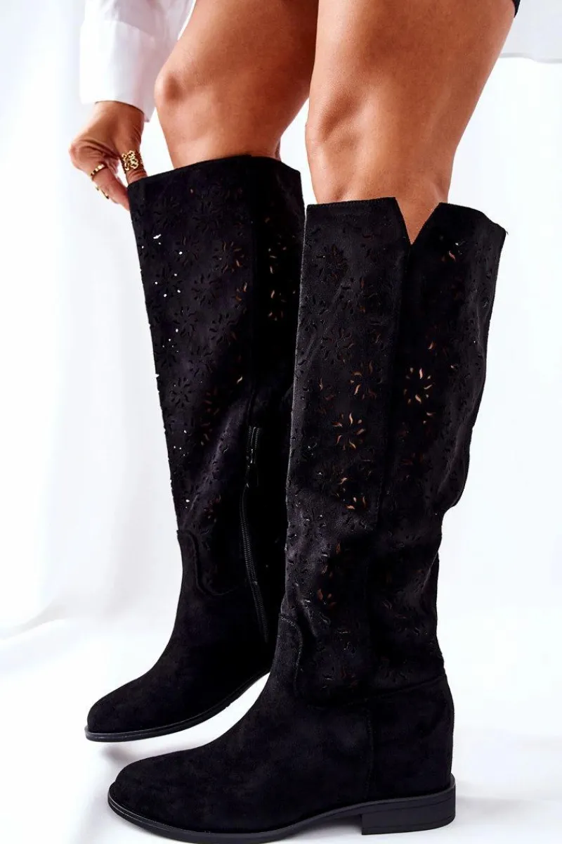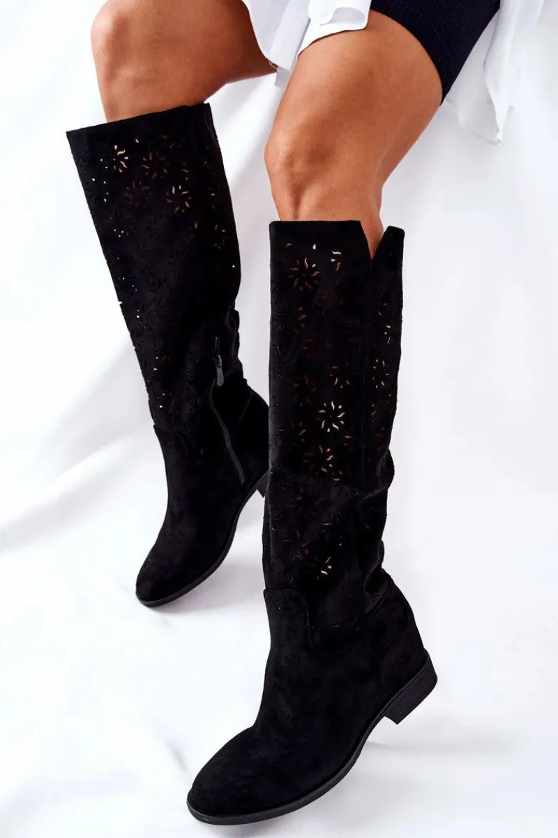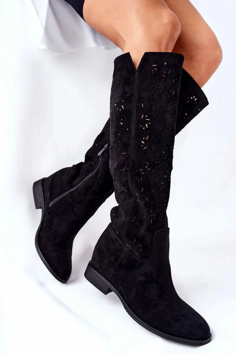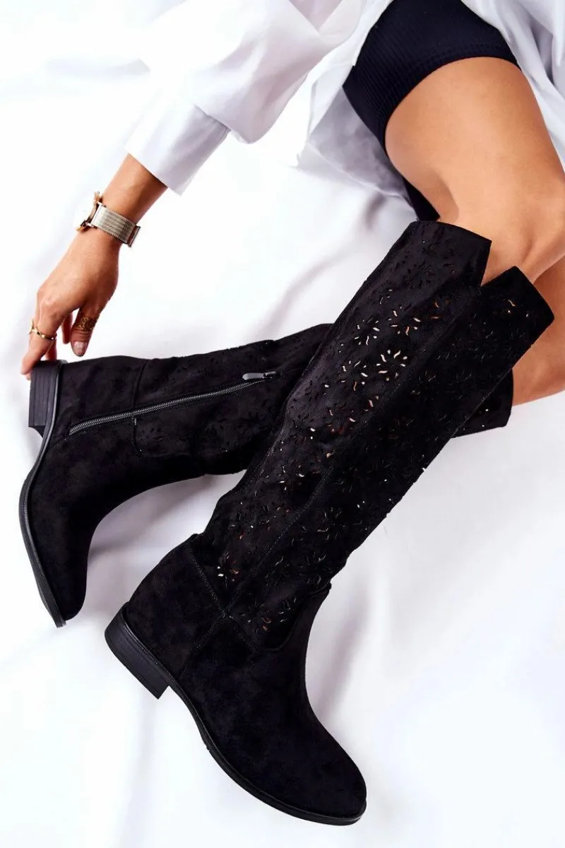 Kozaki na płaskim obcasie w ażurowy wzór dopełnią wiele Twoich stylizacji! Wykonane zostały z przyjemnego w dotyku materiału tekstylnego. Posiadają ukryty koturn. Zapinane na suwak. Świetnie będą prezentować się zarówno z sukienkami, jak i spodniami. Przy wyborze rozmiaru prosimy sugerować się tabelą rozmiarów.