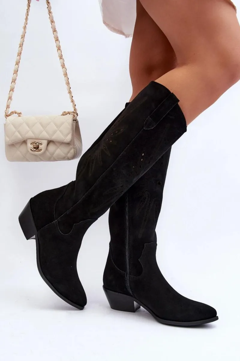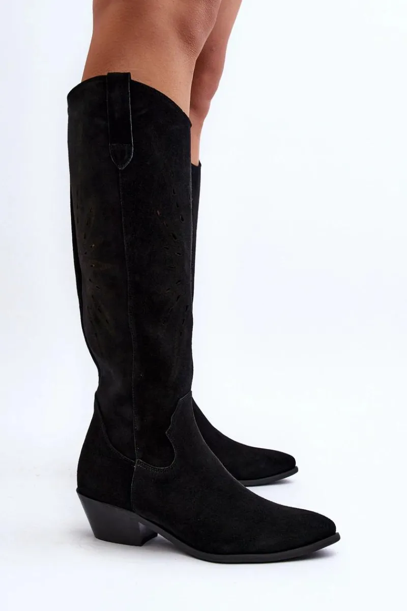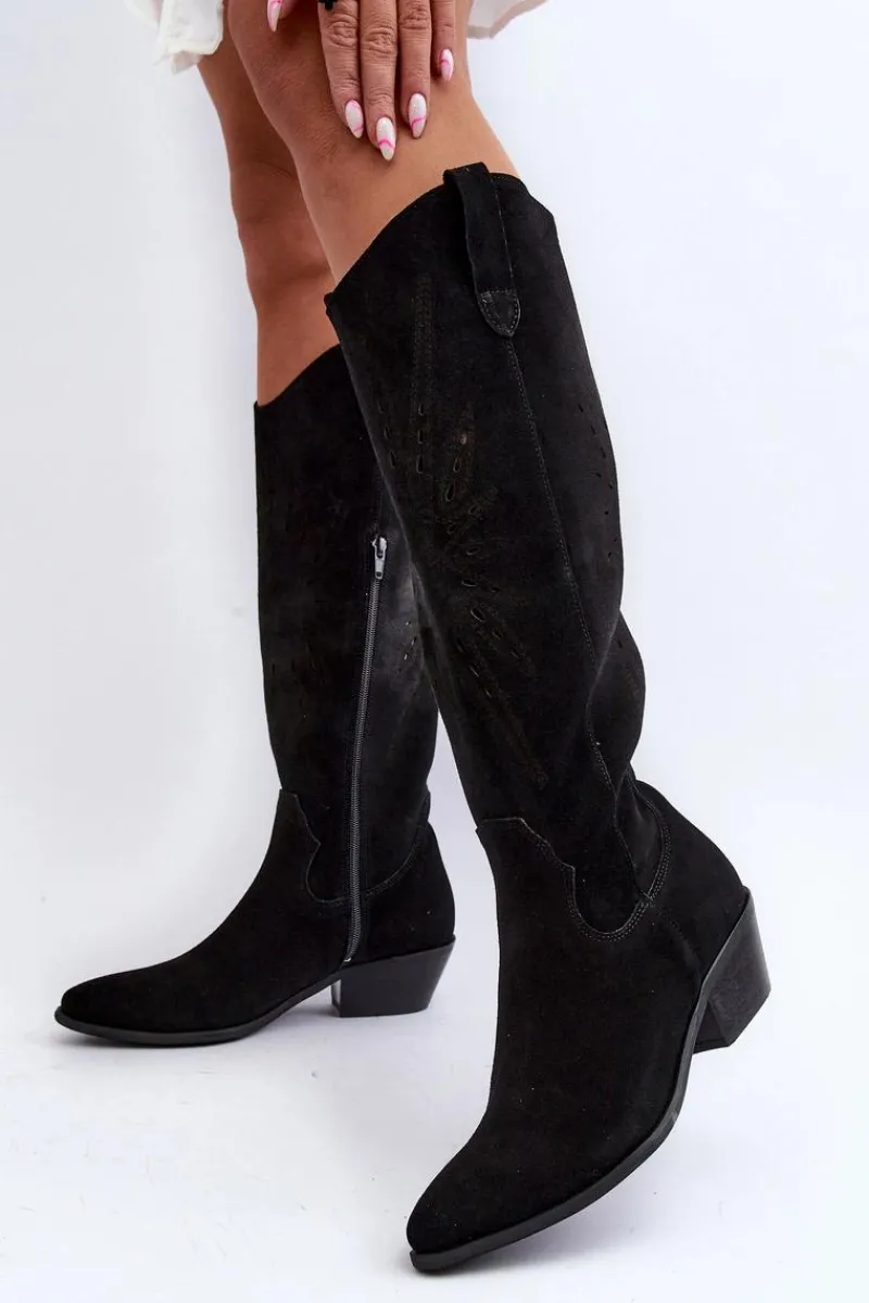 Kozaki z ażurową cholewką przed kolano. Wykonane ze skóry naturalnej. Osadzone na niskim obcasie. Model wsuwany z dodatkowym zapięciem na suwak. Noski w szpic. Lekko profilowana wkładka ze skóry naturalnej zapewni komfort podczas użytkowania. Idealne do wielu stylizacji! Koniecznie powinnaś je mieć w swojej szafie! Przy wyborze rozmiaru prosimy sugerować się tabelą rozmiarów.
