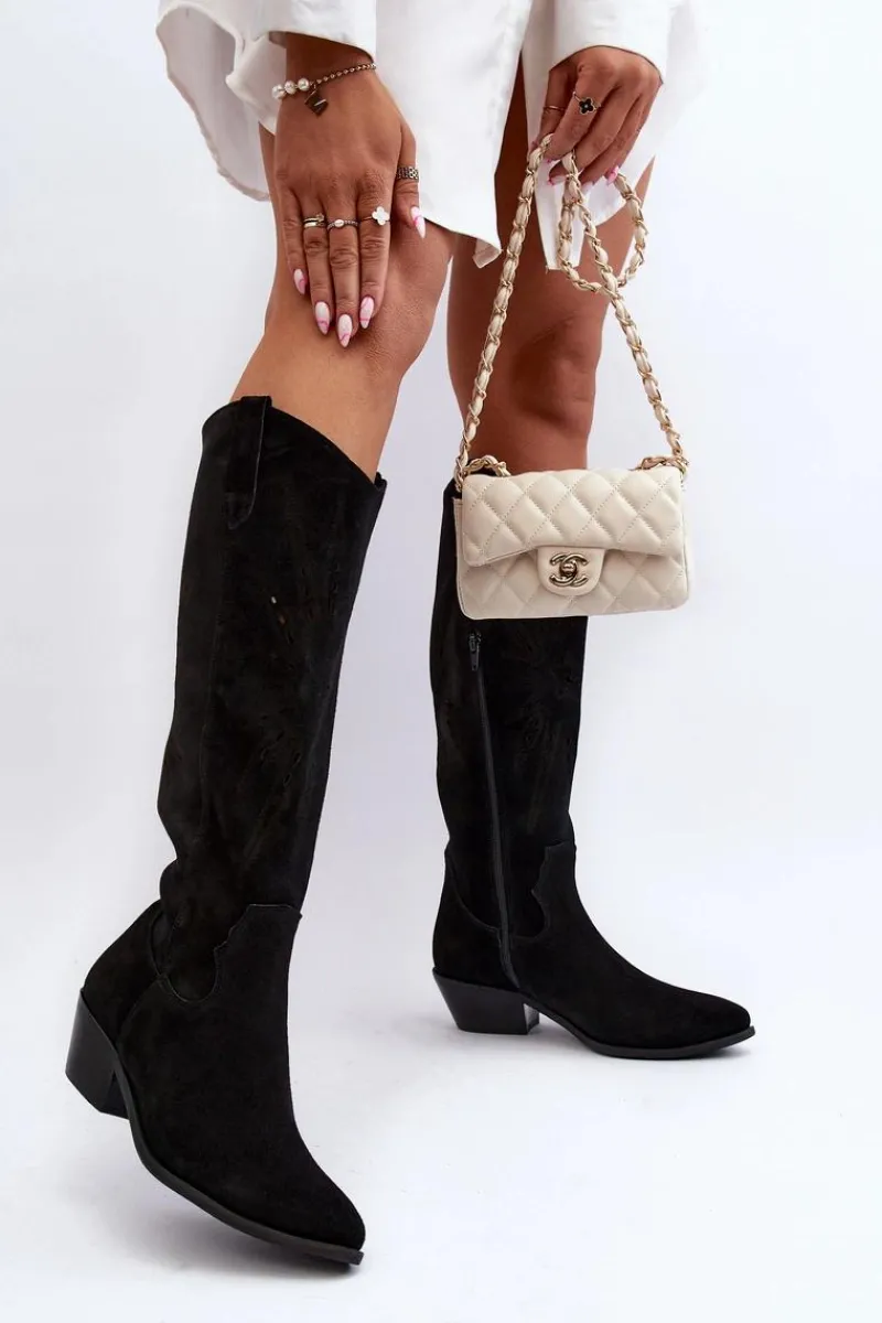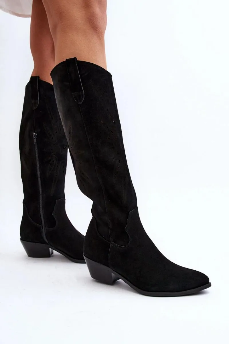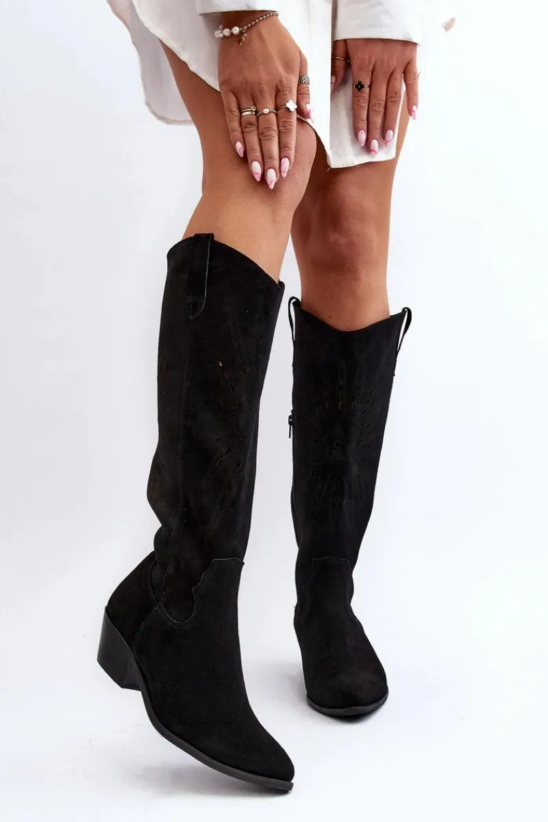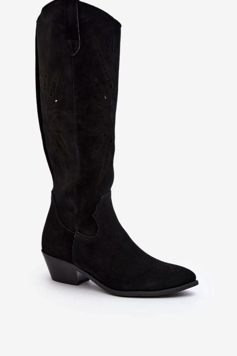 Kozaki z ażurową cholewką przed kolano. Wykonane ze skóry naturalnej. Osadzone na niskim obcasie. Model wsuwany z dodatkowym zapięciem na suwak. Noski w szpic. Lekko profilowana wkładka ze skóry naturalnej zapewni komfort podczas użytkowania. Idealne do wielu stylizacji! Koniecznie powinnaś je mieć w swojej szafie! Przy wyborze rozmiaru prosimy sugerować się tabelą rozmiarów.
