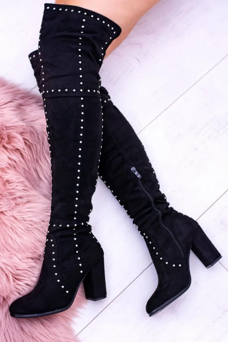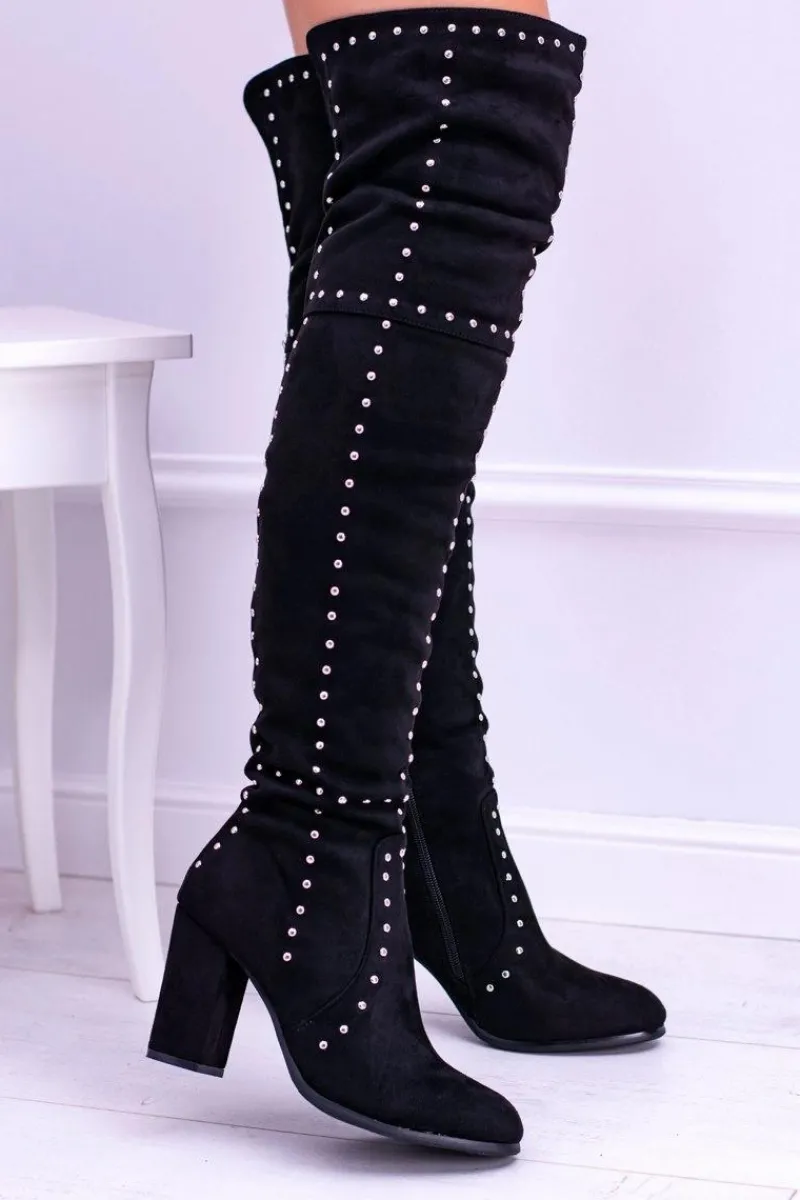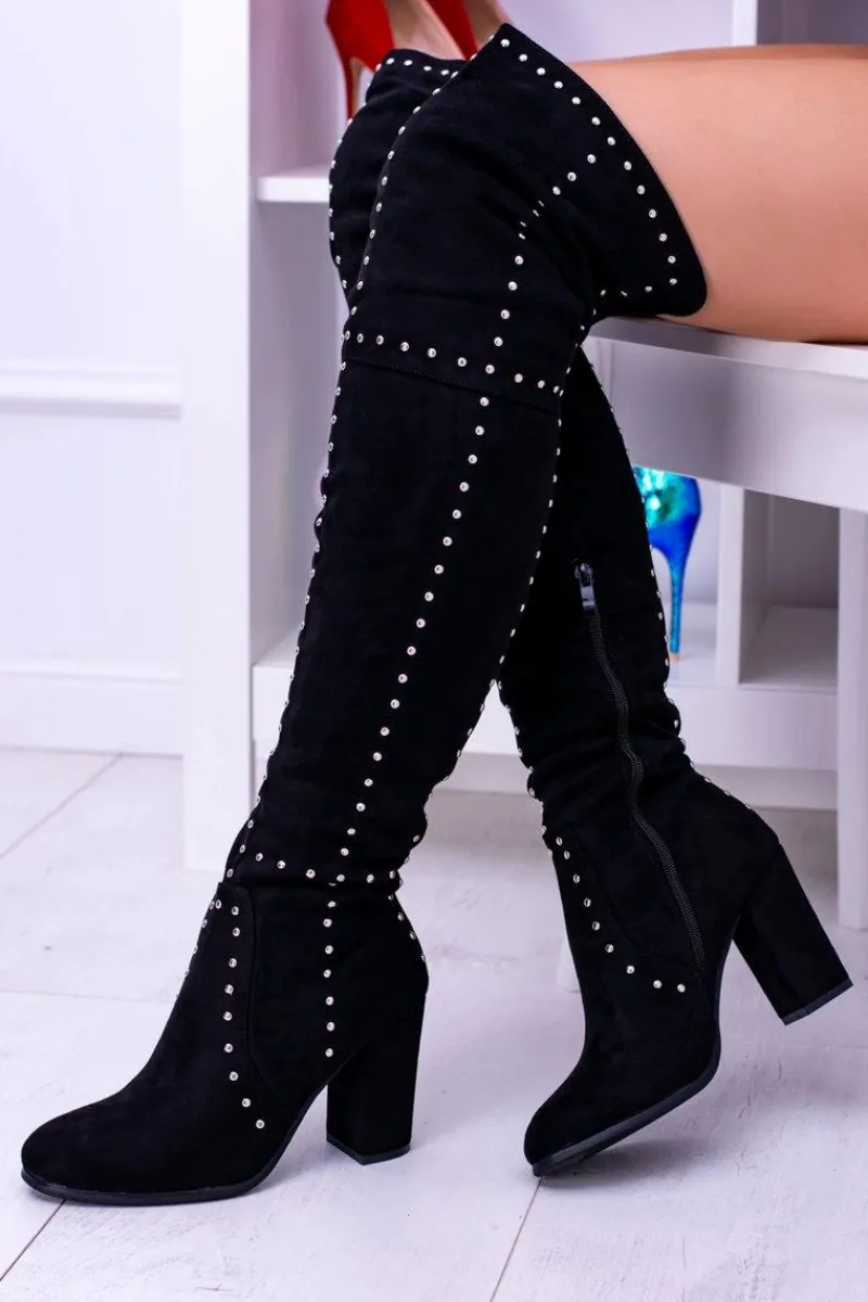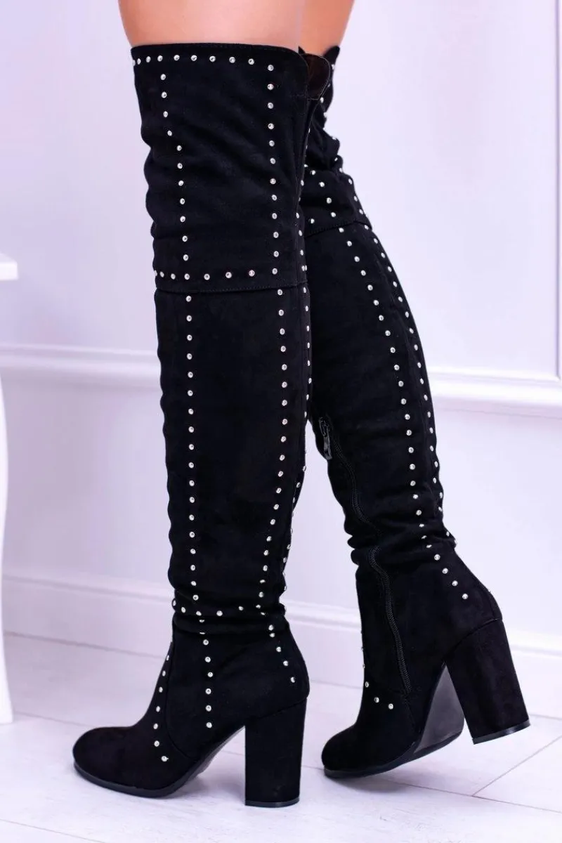 Lato nie będzie trwać wiecznie dlatego już teraz spraw sobie wyśmienite kozaki! Zamszowy materiał to hit tego sezonu! Subtelny słupek wydłuży i wysmukli Twoją sylwetkę! Dodatkiem będą ćwieki na całym bucie! Zakładanie ułatwi wszyty z boku zamek, a niesamowitego seksapilu nadaje im to, że sięgają aż powyżej kolana, dodatkowo otulając niemal całe Twoje nogi. Nie czekaj dłużej, kup teraz!