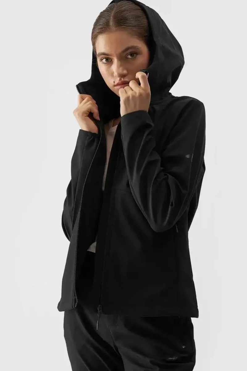 Kurtka softshell idealnie sprawdzi się podczas aktywności o niskim stopniu intensywności. Zapewni ochronę przed wiatrem oraz komfort cieplny w cieplejsze dni. Posiada dopasowany krój slim, który przylega do ciała i standardową długość sięgającą do linii bioder. Podszewka z siateczki, wspierająca oddychalność. Kurtka softshell 4F damska została wyposażona w membranę NeoDry o parametrze 5000/3000, co oznacza, że jest odporna na niewielkie opady deszczu lub śniegu, a także zapewnia optymalne odprowadzanie wilgoci podczas codziennych aktywności. Hydrofobowa powłoka impregnacyjna pokrywa zewnętrzną warstwę materiału i zabezpiecza ją przed wchłonięciem wody. Powłoka sprawia, że wilgoć skrapla się na powierzchni tkaniny lub dzianiny, po czym swobodnie po niej spływa. Specjalna konstrukcja i właściwości materiału typu softshell (windstopper) zapewniają skuteczną ochronę przed naporem wiatru. Damski softshell z kapturem jest wyposażony w zintegrowany kaptur z regulacją głębokości. Niska stójka, która dodatkowo osłoni szyję przed chłodem. Rękawy bez regulacji. Po bokach znajdują się 2 kieszenie zapinane na zamek. Kurtka typu softshell damska jest zapinana na jednokierunkowy zamek główny z wewnętrzną plisą przeciwwiatrową, która ogranicza przenikanie chłodu do wnętrza kurtki. Materiał główny: Poliester 95%, Elastan 5% Podszewka: Poliester 100%