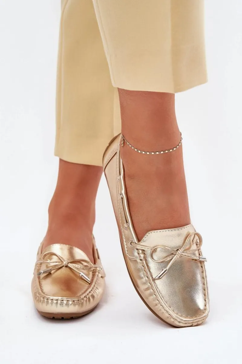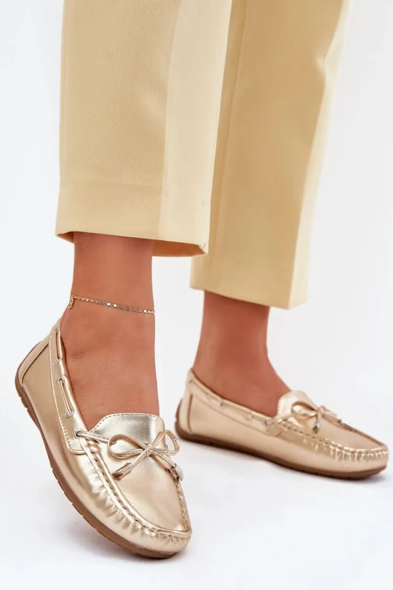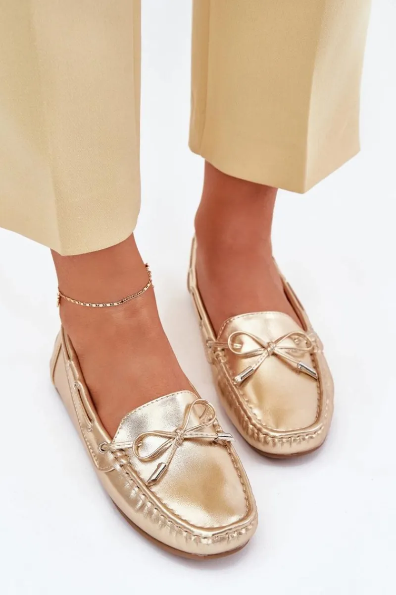 Damskie, klasyczne mokasyny zostały wykonane z eko skóry. Model ten posiada na przodzie ozdobną kokardkę oraz przeplatające się przez boki cholewki sznureczki. Mokasyny osadzono na antypoślizgowej podeszwie. Miękka wkładka z eko skóry zapewni komfort podczas użytkowania obuwia. Dodatkowo jest delikatnie perforowana. Koniecznie powinnaś je mieć w swojej kolekcji obuwia! Przy wyborze rozmiaru prosimy sugerować się tabelą rozmiarów.