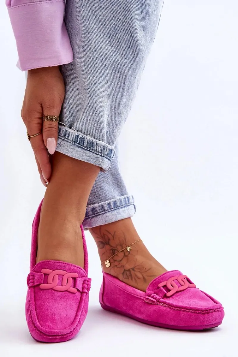 Damskie mokasyny powinny znaleźć się w każdej kobiecej szafie! Ten model został wykonany z miłego w dotyku eko zamszu. Na przodzie znajduje się ozdoba z tworzywa sztucznego. Mokasyny osadzono na antypoślizgowej podeszwie. Miękka wkładka z eko skóry zapewni komfort podczas użytkowania obuwia. Dodatkowo jest delikatnie perforowana. Przy wyborze rozmiaru prosimy sugerować się tabelą rozmiarów.
