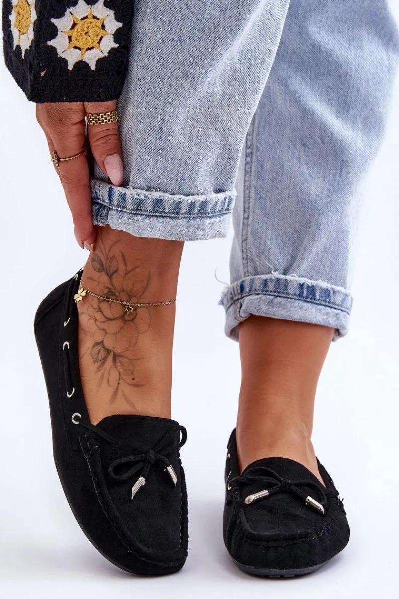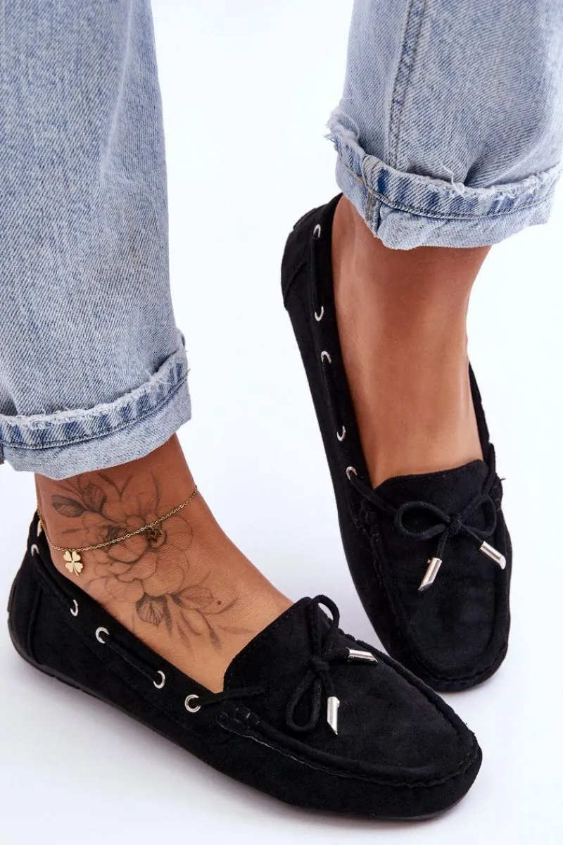 Damskie, klasyczne mokasyny zostały wykonane z eko zamszu. Model ten posiada na przodzie ozdobną kokardkę oraz przeplatające się przez boki cholewki sznureczki. Mokasyny osadzono na antypoślizgowej podeszwie. Miękka wkładka z eko skóry zapewni komfort podczas użytkowania obuwia. Dodatkowo jest delikatnie perforowana. Koniecznie powinnaś je mieć w swojej kolekcji obuwia! Przy wyborze rozmiaru prosimy sugerować się tabelą rozmiarów.