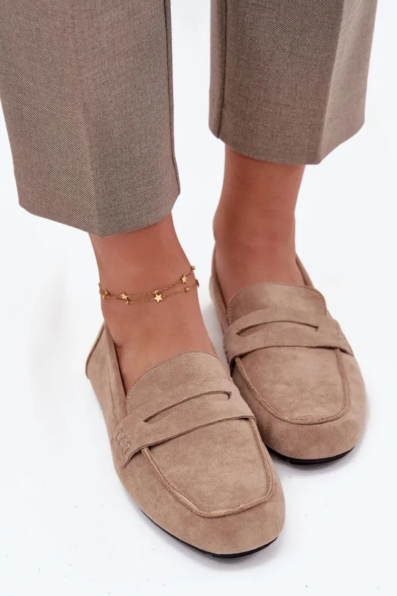 Damskie mokasyny z eko zamszu to połączenie klasyki i wygody, idealne na codzienne wyjścia. Model osadzony na płaskiej podeszwie zapewnia komfort podczas całodziennego noszenia, a zaokrąglone noski gwarantują swobodę dla palców. Charakterystyczny pasek z wycięciem z przodu dodaje subtelnego, eleganckiego akcentu, który wyróżnia buty w casualowych stylizacjach. Dzięki uniwersalnemu fasonowi mokasyny doskonale komponują się zarówno ze spodniami, spódnicami jak i sukienkami. Przy wyborze rozmiaru prosimy sugerować się tabelą rozmiarów.
