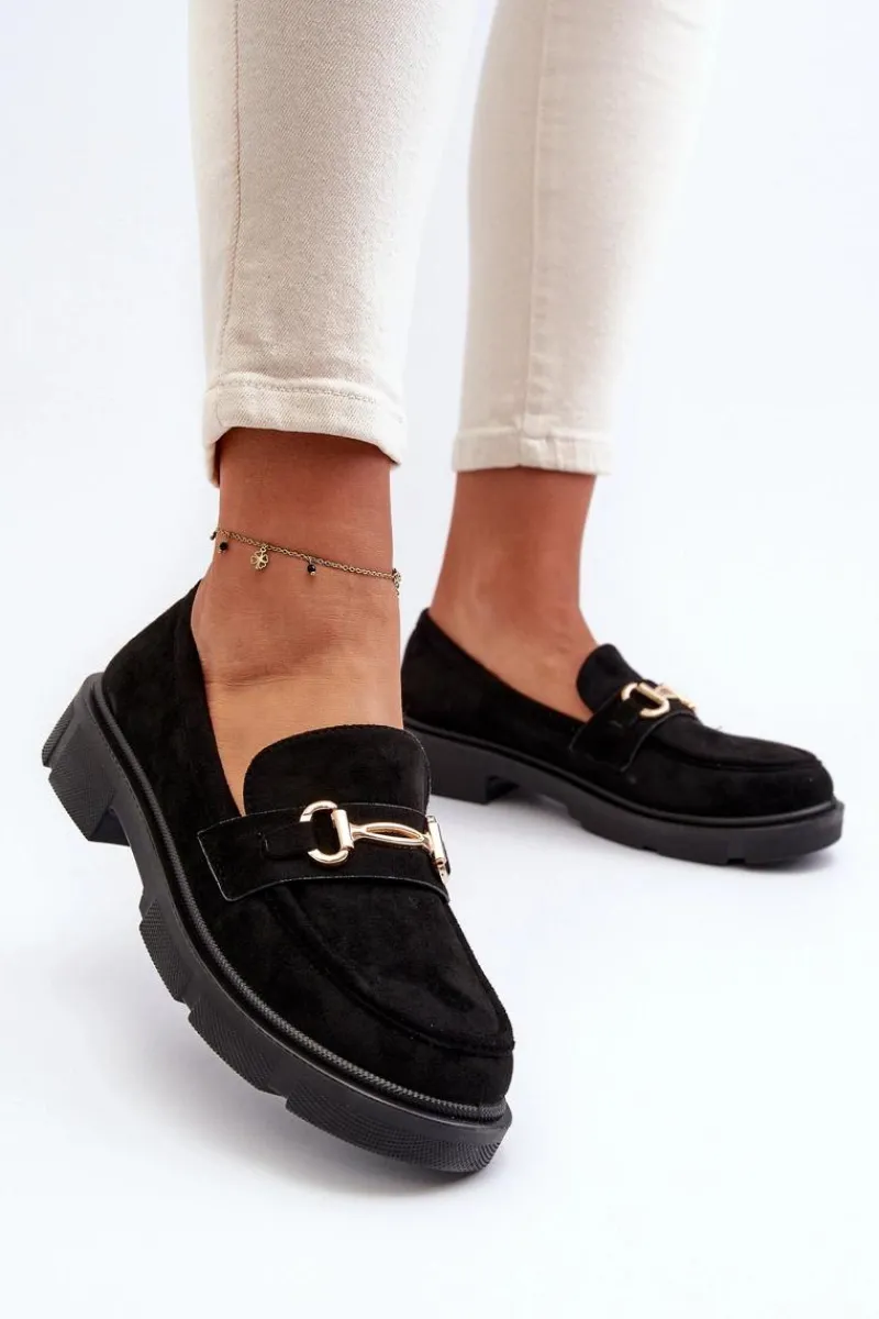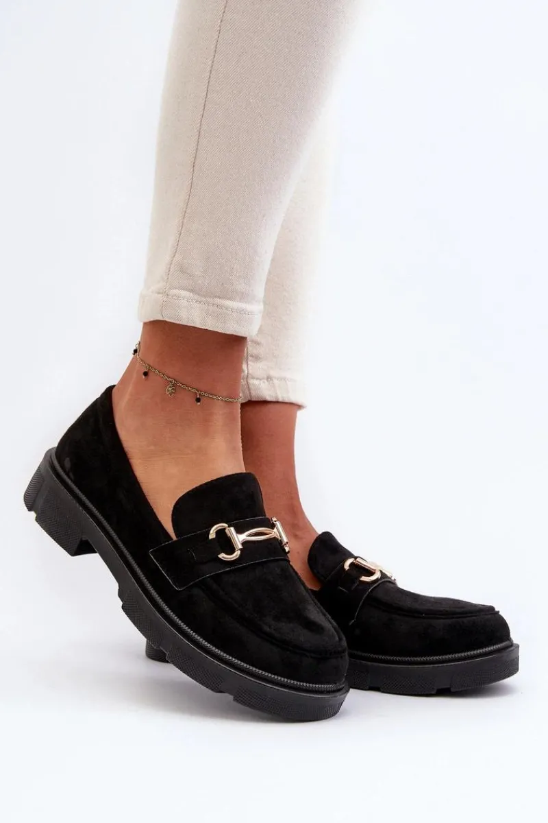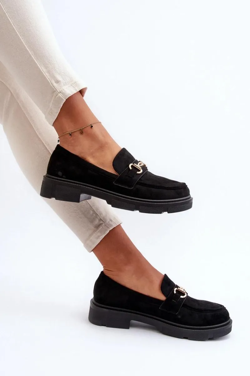 Modne damskie mokasyny wykonane z eko zamszu to absolutny must-have w Twojej garderobie! Przód ozdobiony paseczkiem ze złotą ozdobą, która dodaje im wyjątkowego uroku. Płaski obcas zapewnia wygodę noszenia przez cały dzień. Model ten będzie pasować do różnych stylizacji, dodając im elegancji! Przy wyborze rozmiaru prosimy sugerować się tabelą rozmiarów.