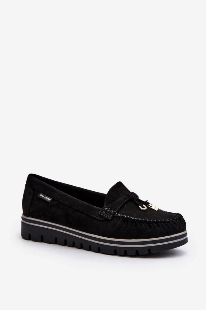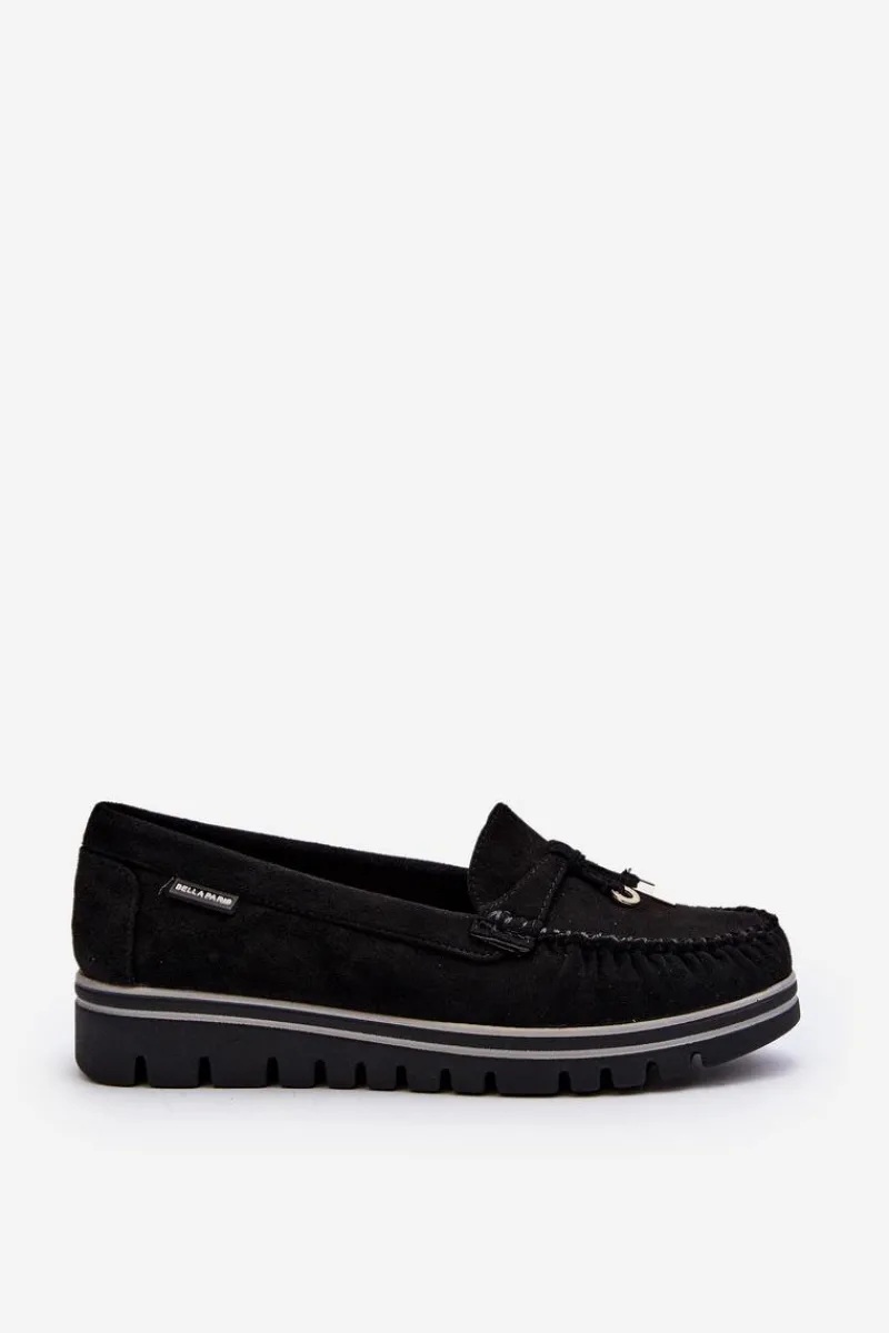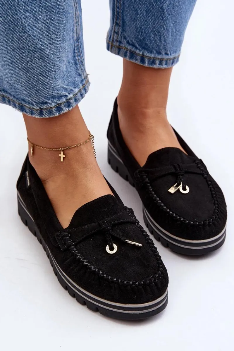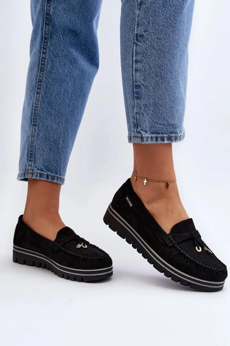 Mokasyny damskie wykonane z eko zamszu. Osadzone na platformie. Noski zaokrąglone. Model ten posiada miękką wkładkę ze skóry naturalnej, która zapewni wygodę podczas noszenia. Z przodu małe zawieszki. Klasyczny fason, który dopasujesz do wielu wiosenno-letnich stylizacji! Przy wyborze rozmiaru prosimy sugerować się tabelą rozmiarów.