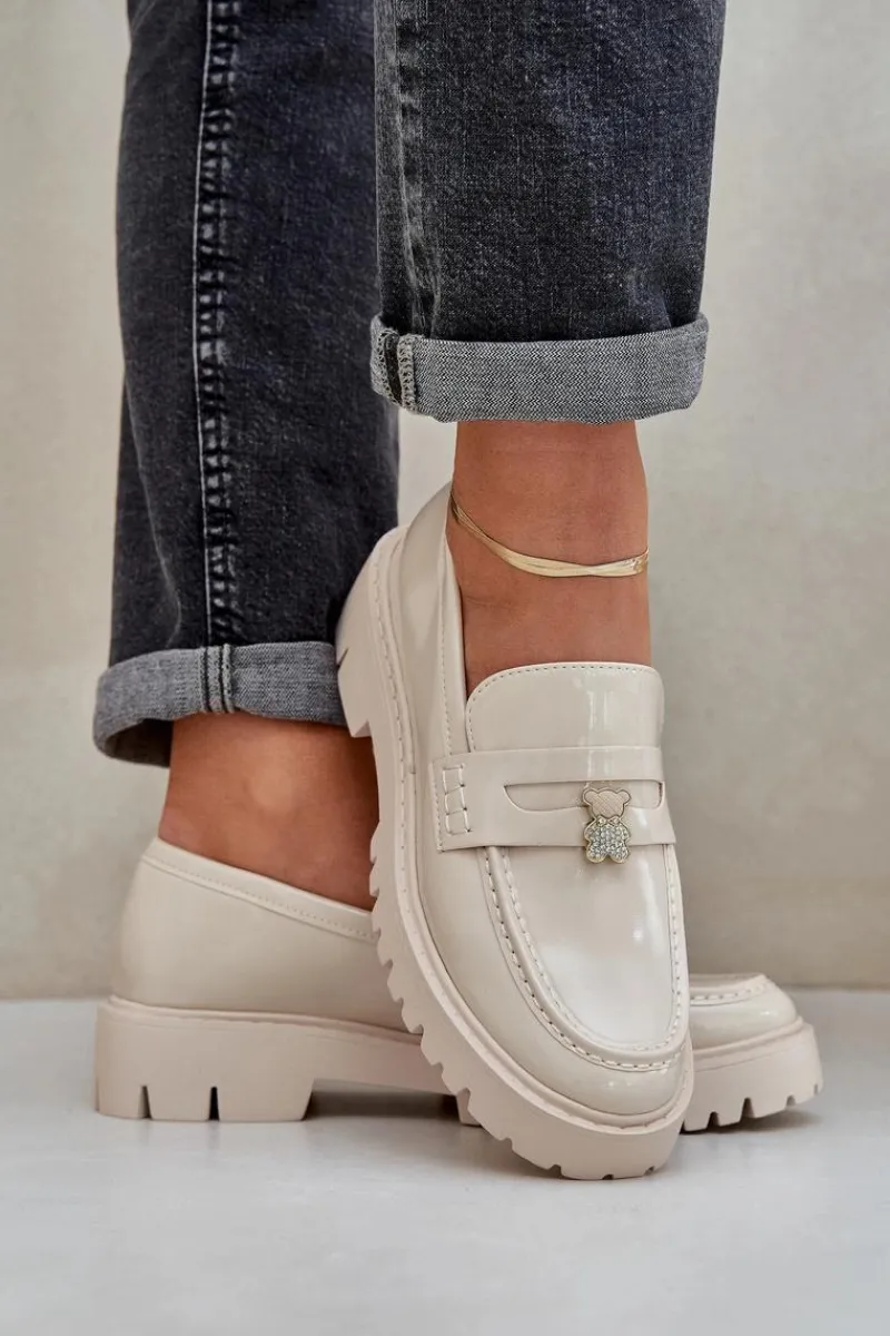 Mokasyny damskie z eko skóry to komfortowy wybór, który łączy elegancję z oryginalnym akcentem. Zaokrąglone noski zapewniają wygodę, a model wyróżnia się uroczą przypinką w kształcie misia na pasku z przodu, dodając zabawnego i unikalnego charakteru. To świetna propozycja na casualowe stylizacje, które potrzebują odrobiny delikatności i świeżości. Przy wyborze rozmiaru prosimy sugerować się tabelą rozmiarów.