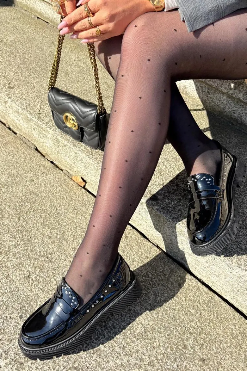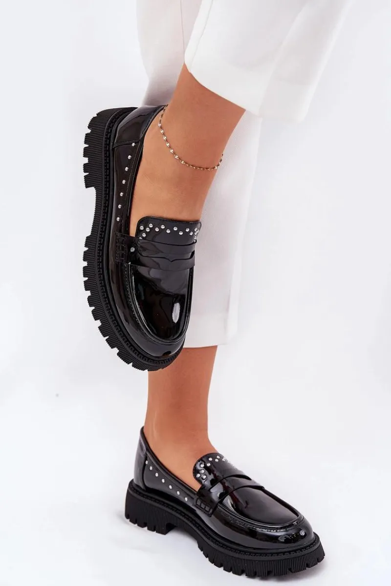 Stylowe mokasyny damskie wykonane z lakierowanej eko skóry. Osadzone na płaskim obcasie. Zaokrąglone noski dodają im subtelnej lekkości, a cholewka ozdobiona zdobieniem nadaje wyjątkowego charakteru. Te mokasyny doskonale pasują do eleganckich oraz casualowych stylizacji, wprowadzając nowoczesny akcent do każdej okazji. Idealne na co dzień, gwarantują komfort i modny wygląd przez cały dzień. Przy wyborze rozmiaru prosimy sugerować się tabelą rozmiarów.