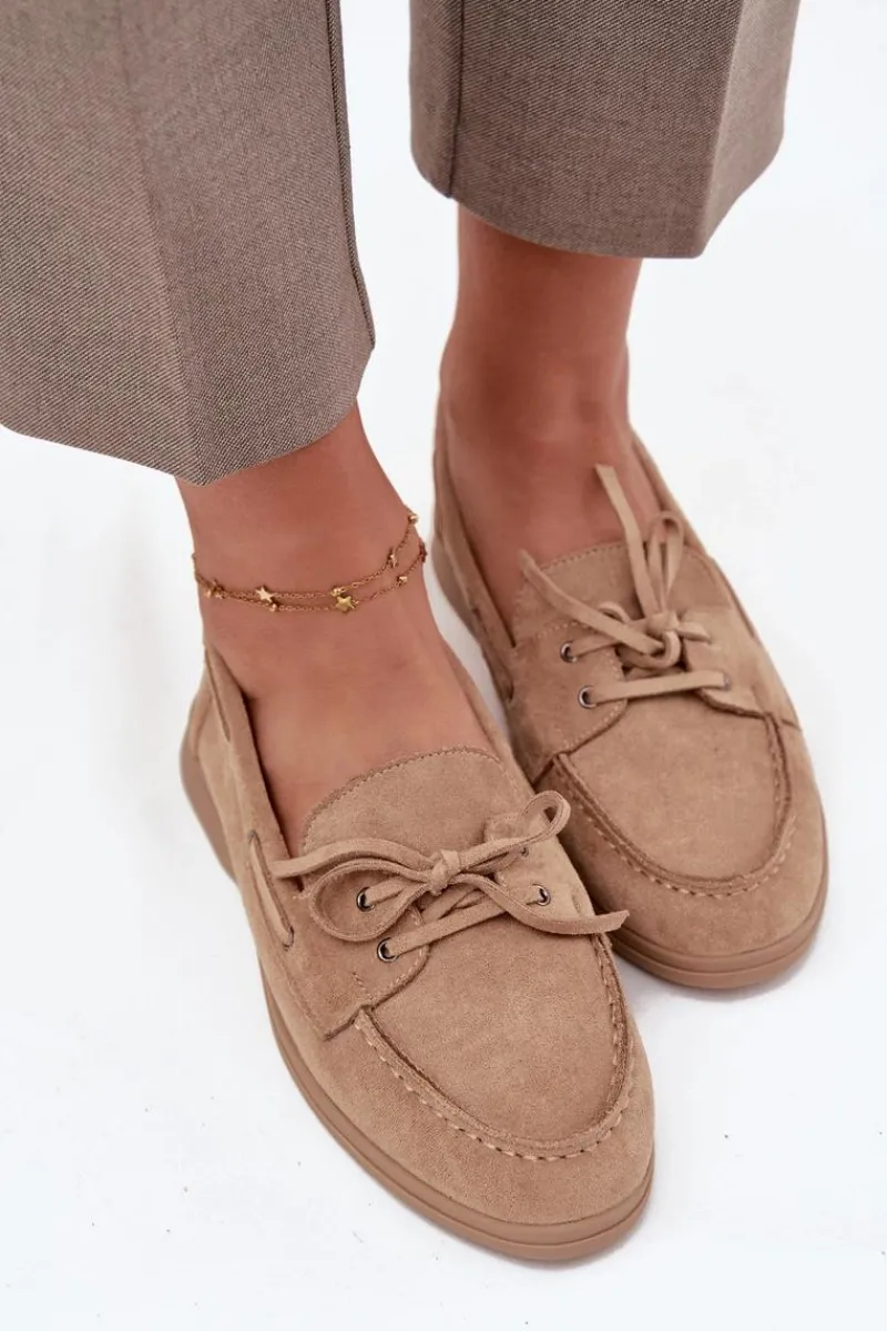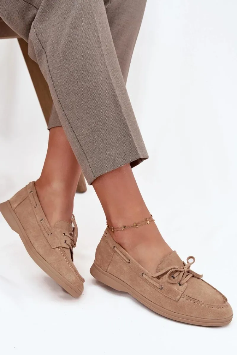 Mokasyny damskie wykonane z miękkiego eko zamszu to wygodna i stylowa propozycja na co dzień. Osadzone na płaskiej podeszwie gwarantują komfort, a zaokrąglone noski nadają im klasyczny charakter. Subtelny paseczek z przodu i wokół cholewki stanowi ciekawy detal, który podkreśla elegancki i ponadczasowy wygląd tego modelu. Doskonałe do codziennych stylizacji. Przy wyborze rozmiaru prosimy sugerować się tabelą rozmiarów.