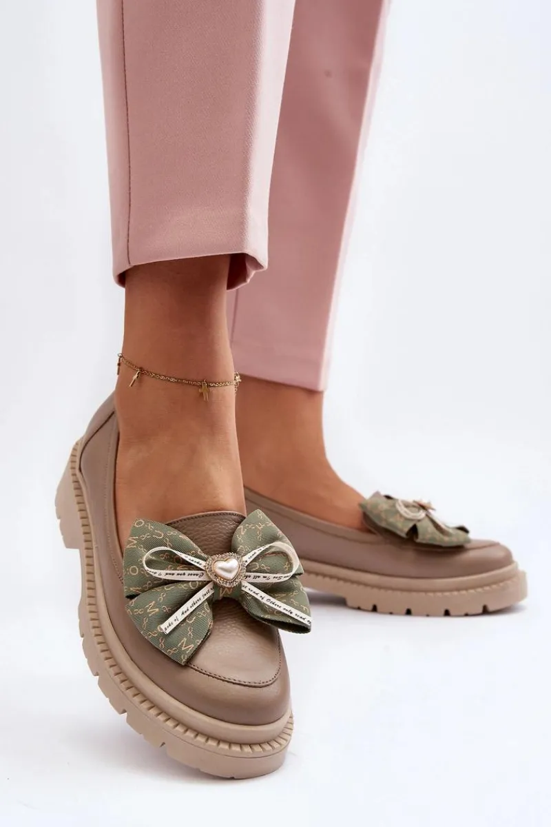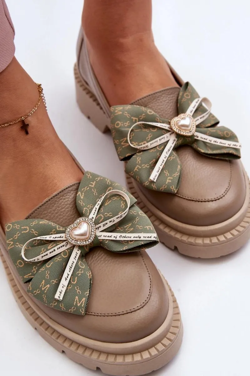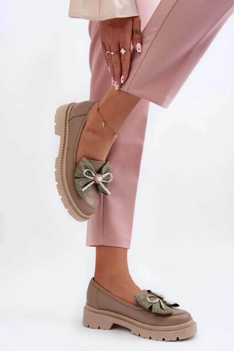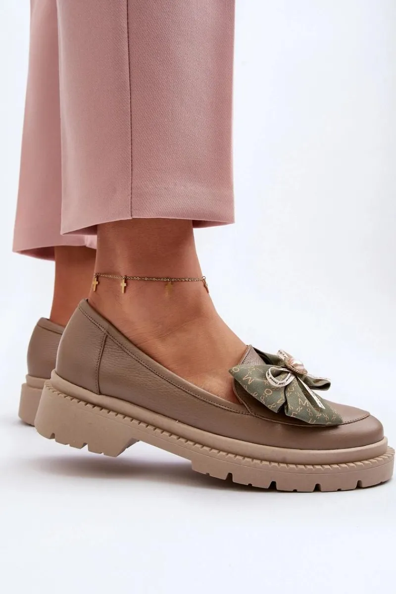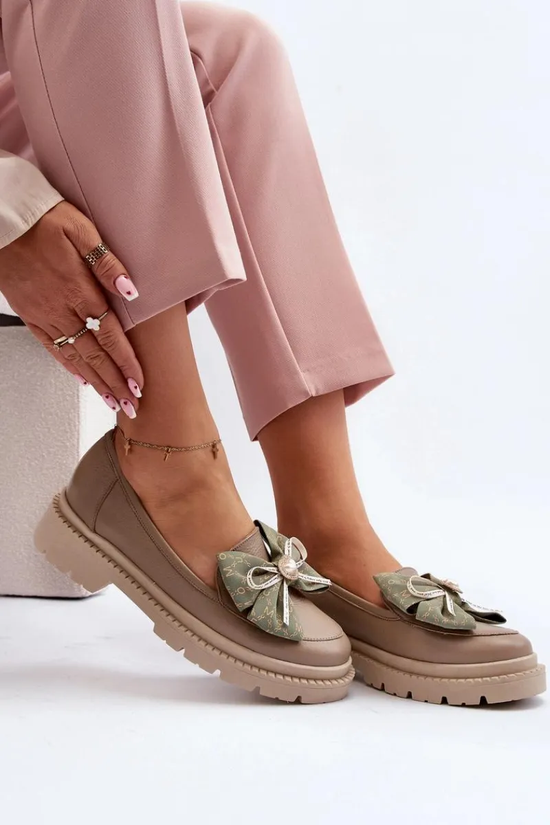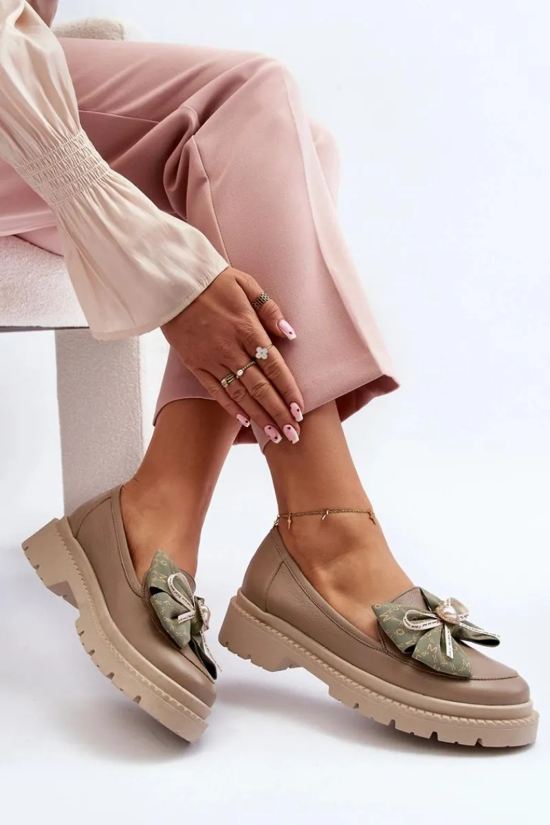 Mokasyny damskie wykonane ze skóry naturalnej. Ozdobione dużą kokardą z przodu. Osadzone na płaskim obcasie. Noski zaokrąglone. Miękka, skórzana wkładka zapewni wygodę podczas użytkowania. Ten niezwykle modny fason idealnie uzupełni wiele wiosennych stylizacji! Przy wyborze rozmiaru prosimy sugerować się tabelą rozmiarów.