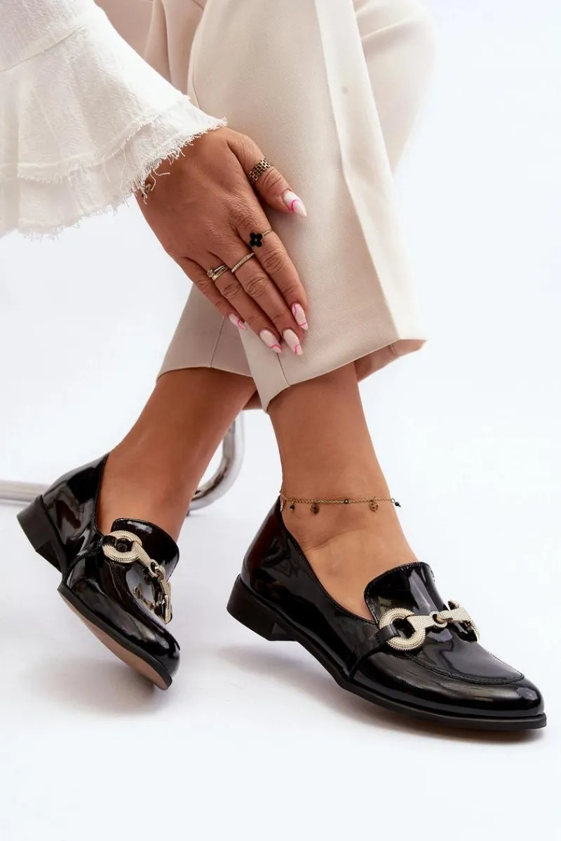 Eleganckie mokasyny damskie wykonane ze skóry naturalnej. Ten fason idealnie sprawdzi się w sezonie wiosenno-jesiennym. Noski zaokrąglone. Z przodu złota ozdoba. Usztywniony zapiętek. Wkładka ze skóry naturalnej zapewni komfort podczas noszenia. Ten model idealnie sprawdzi się zarówno w casualowych, jak i bardziej eleganckich outfitach! Przy wyborze rozmiaru prosimy sugerować się tabelą rozmiarów.