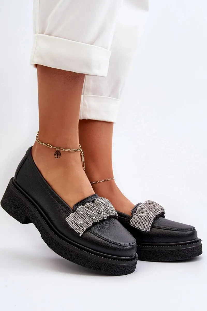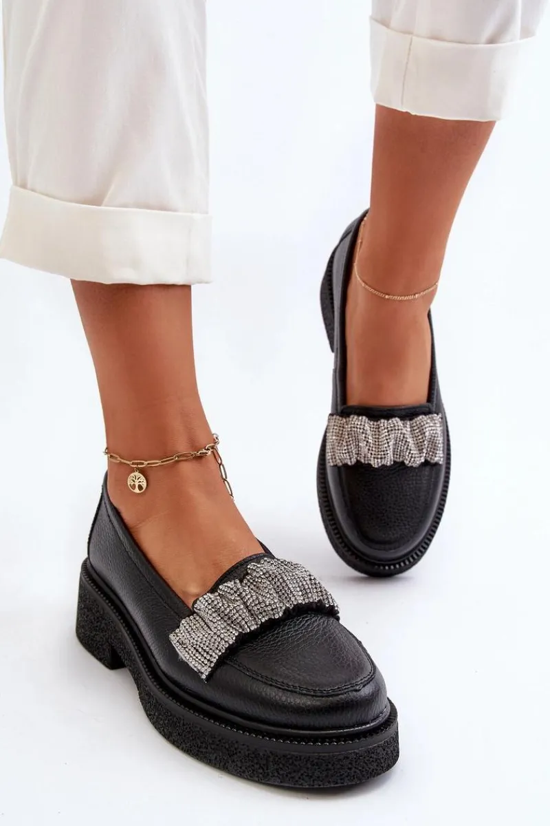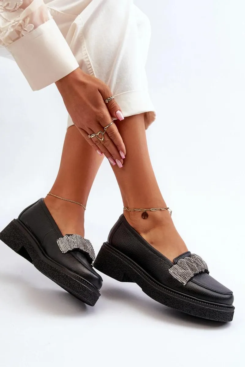 Mokasyny damskie wykonane z naturalnej skóry to połączenie elegancji i wygody. Przód buta ozdobiony jest marszczonym paseczkiem z małymi cyrkoniami. Profilowana wkładka zapewnia wygodę i komfort podczas noszenia, a skóra naturalna nadaje im ekskluzywnego wyglądu. To idealny wybór dla tych, którzy cenią sobie zarówno styl, jak i wygodę. Przy wyborze rozmiaru prosimy sugerować się tabelą rozmiarów.