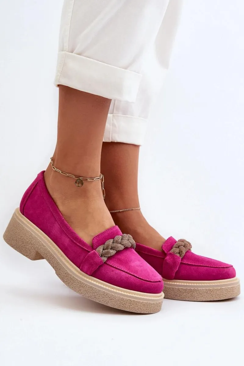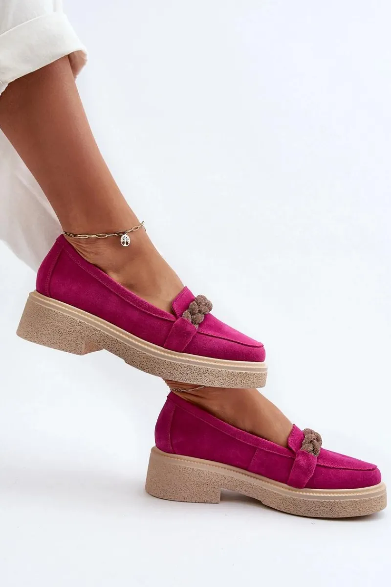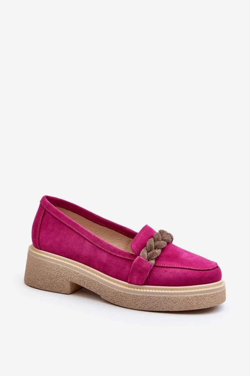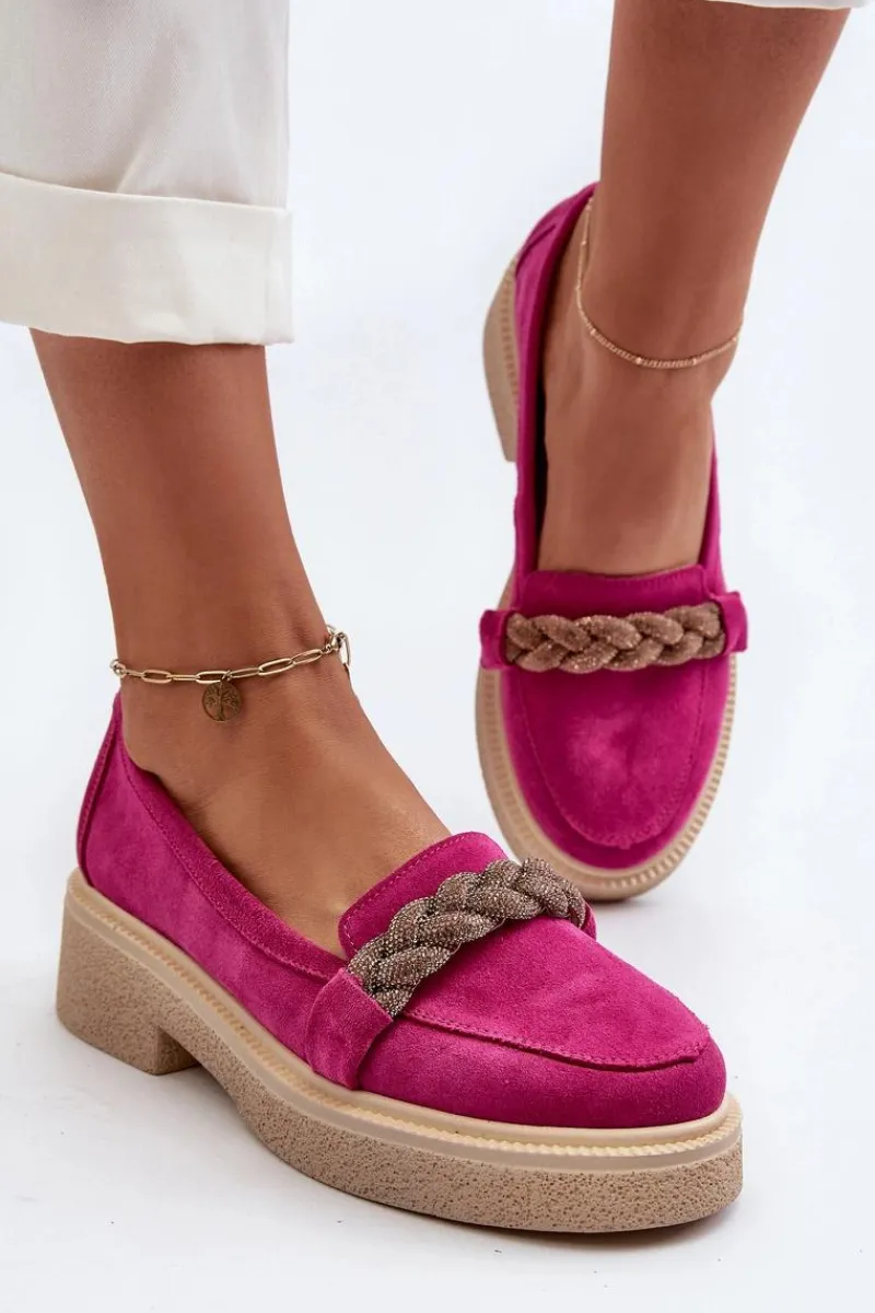 Urocze mokasyny damskie wykonane z naturalnego zamszu. Posiadają płaski obcas z delikatną platformą, co zapewnia stabilność i komfort podczas noszenia. Zaokrąglone noski dodają im subtelnego uroku. Profilowana wkładka gwarantuje wygodę podczas użytkowania. Dodatkowy wdzięk nadają im małe cyrkonie umieszczone na paseczku z przodu. Koniecznie powinnaś je mieć w swojej wiosennej garderobie! Przy wyborze rozmiaru prosimy sugerować się tabelą rozmiarów.