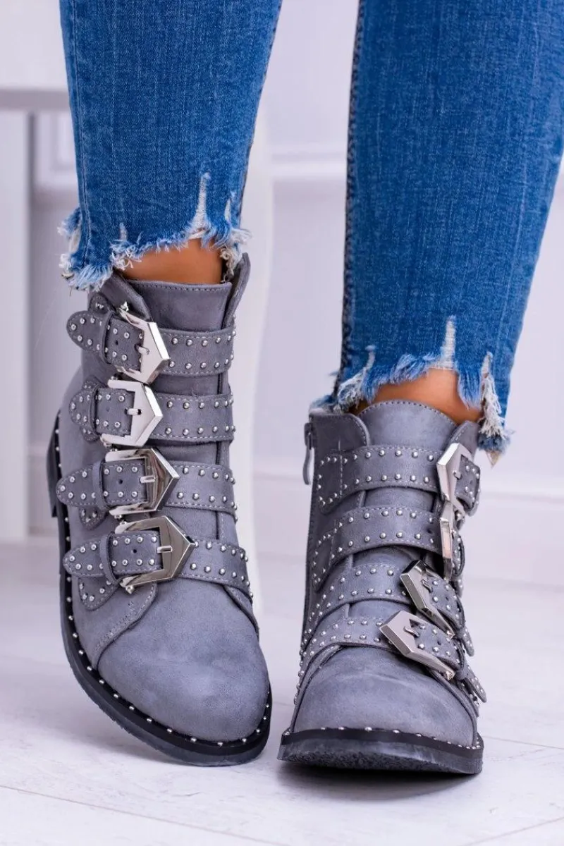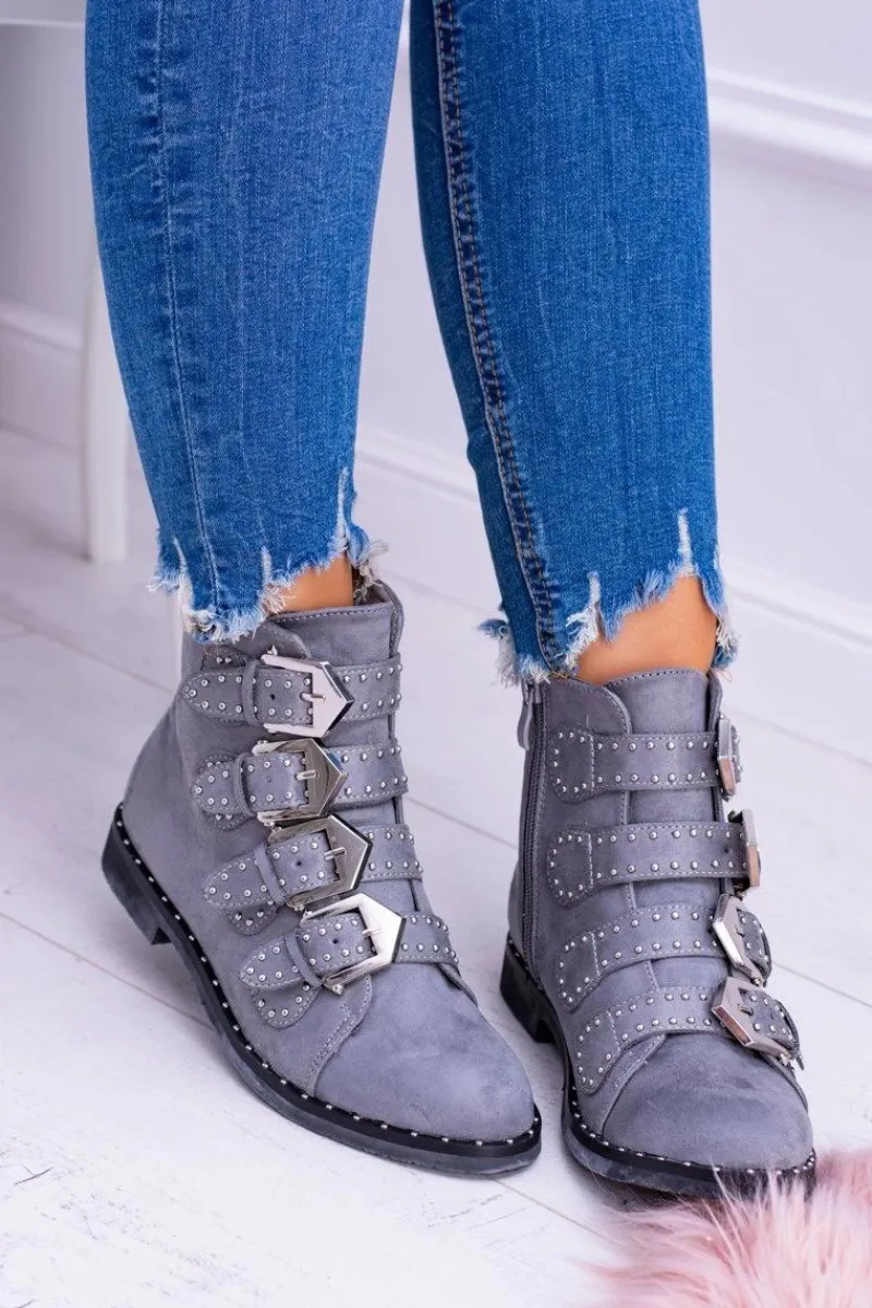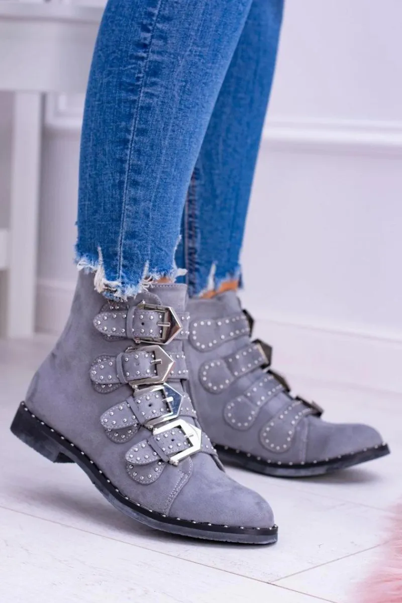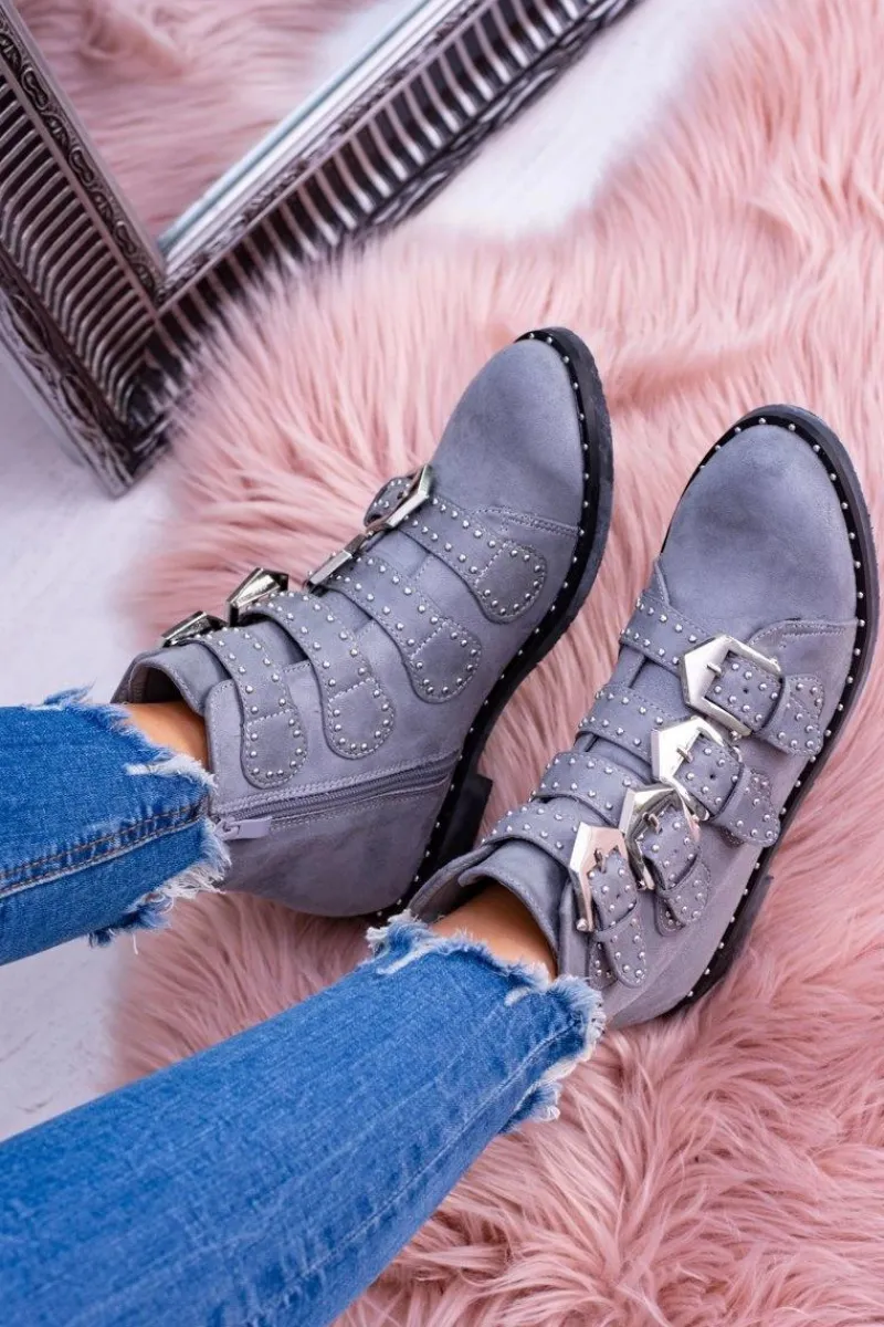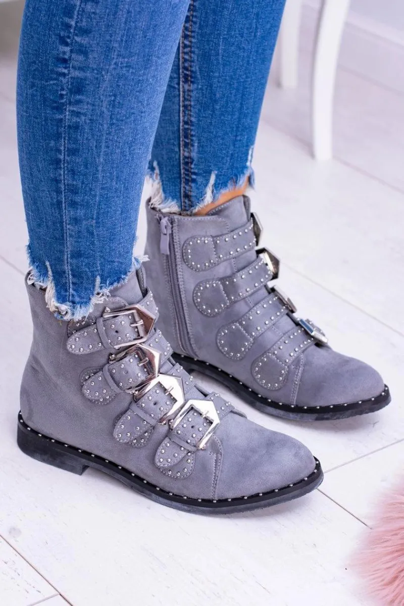 Lu Boo Ciemnoszare Botki Virginia Rock Star Nity Klamry Zamsz Damskie Botki Płaskie|Botki Zamszowe