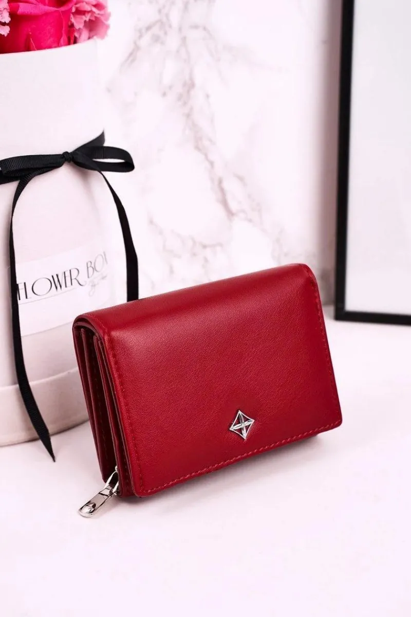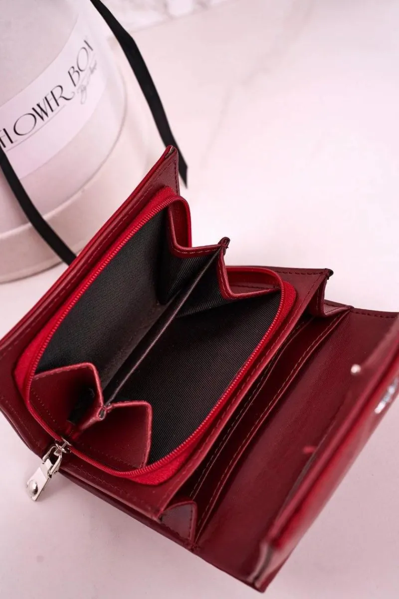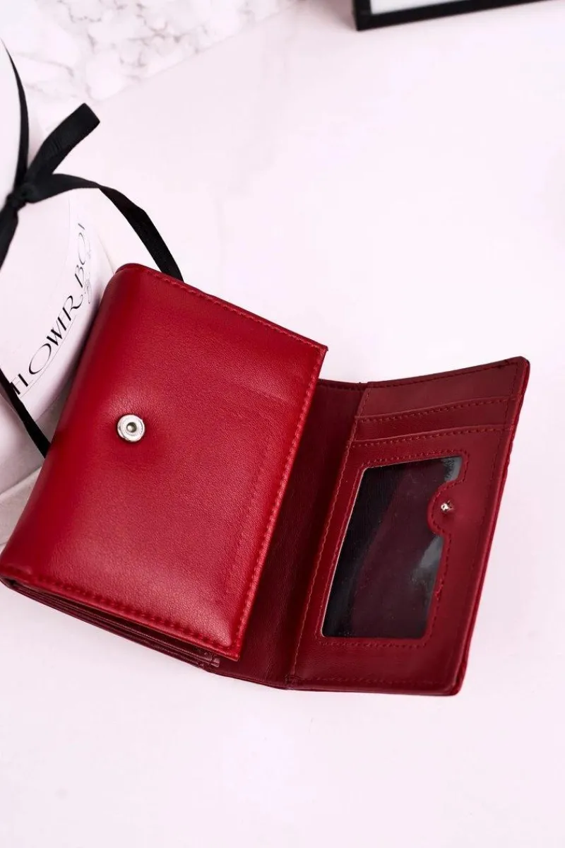 Mały portfel damski zapinany na zamek i zatrzask. Portfel pomieści bilon, banknoty oraz karty płatnicze. Wykonany ze skóry ekologicznej.