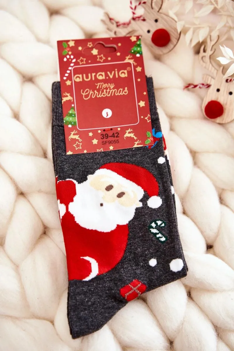 Męskie Świąteczne Bawełniane Skarpetki Z Mikołajem I Reniferem Ciemnoszare Skarpetki|Skarpetki