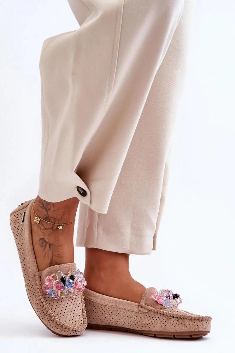 Te damskie mokasyny to HIT! Wykonane z miłego w dotyku eko zamszu z perforacją na całości cholewki. Na przodzie znajdują się ozdoby w postaci kolorowych kamieni. Mokasyny osadzono na antypoślizgowej, gumowej podeszwie. Miękka wkładka z naturalnej skóry i pianki zapewni komfort podczas użytkowania obuwia. Dodatkowo jest delikatnie perforowana. Przy wyborze rozmiaru prosimy sugerować się tabelą rozmiarów.