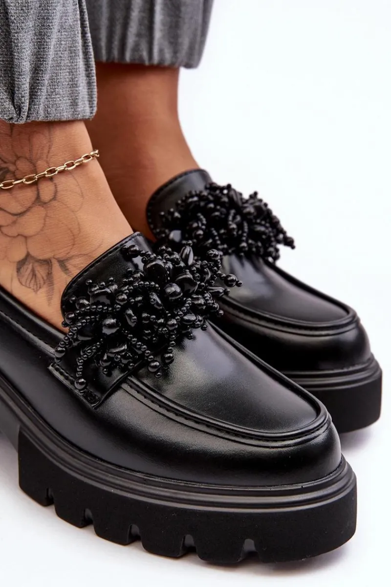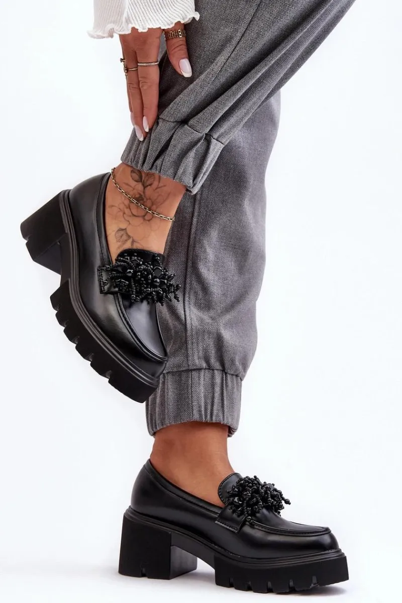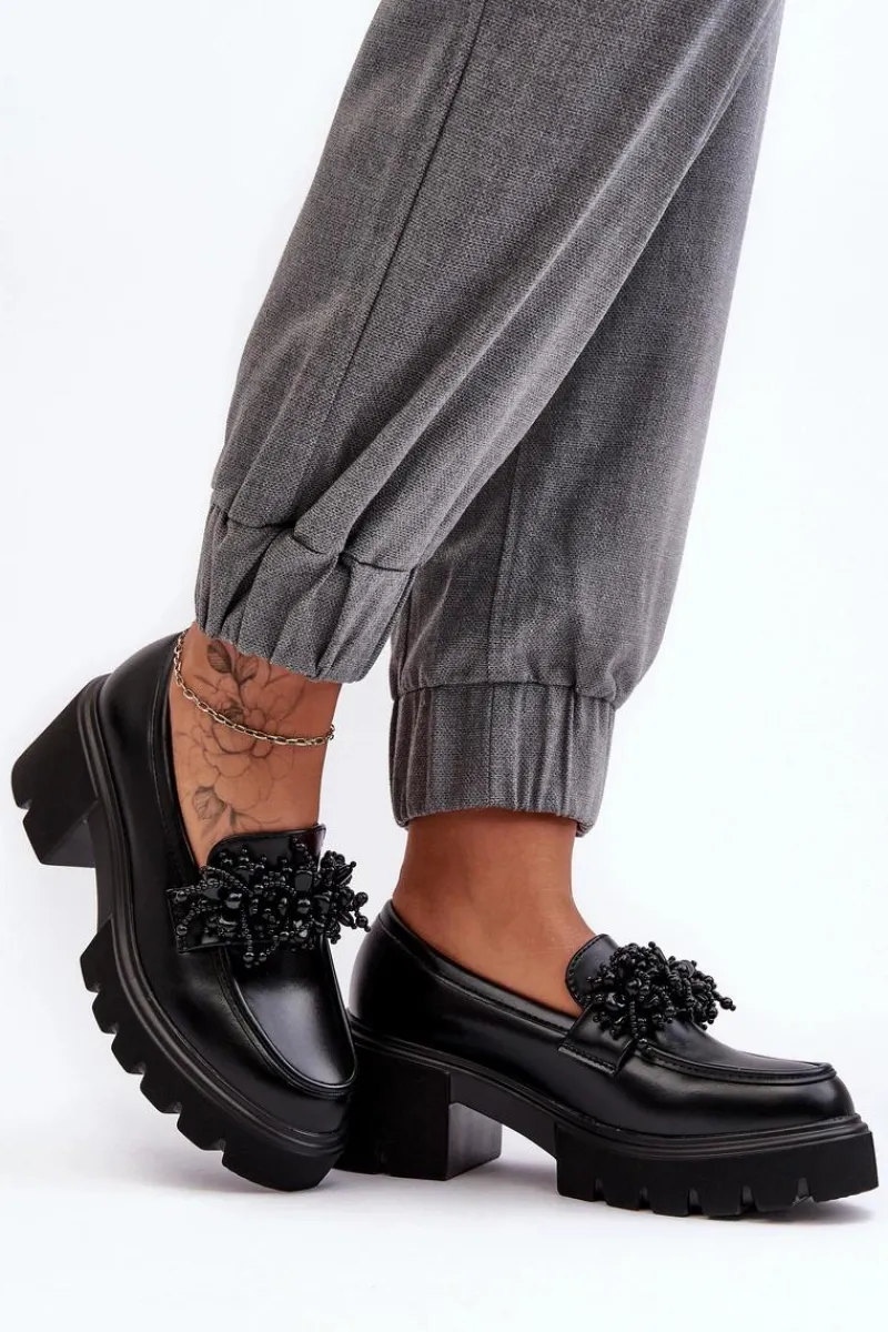 Stylowe półbuty damskie z ozdobą na pasku. Osadzone grubej podeszwie i masywnym, niskim obcasie. Noski zaokrąglone. Usztywniony zapiętek. Eko skórzana wkładka zapewni komfort podczas użytkowania. Model ten będzie idealny do wielu jesiennych stylizacji! Przy wyborze rozmiaru prosimy sugerować się tabelą rozmiarów.