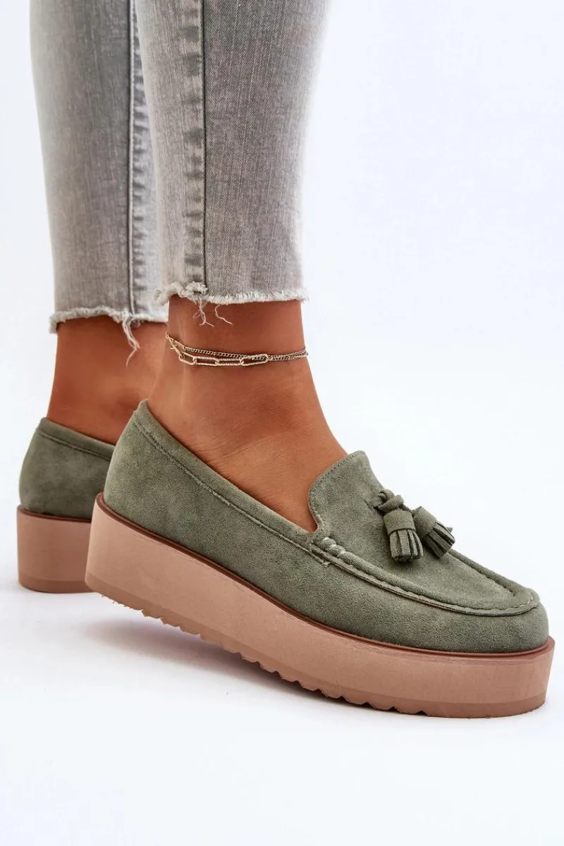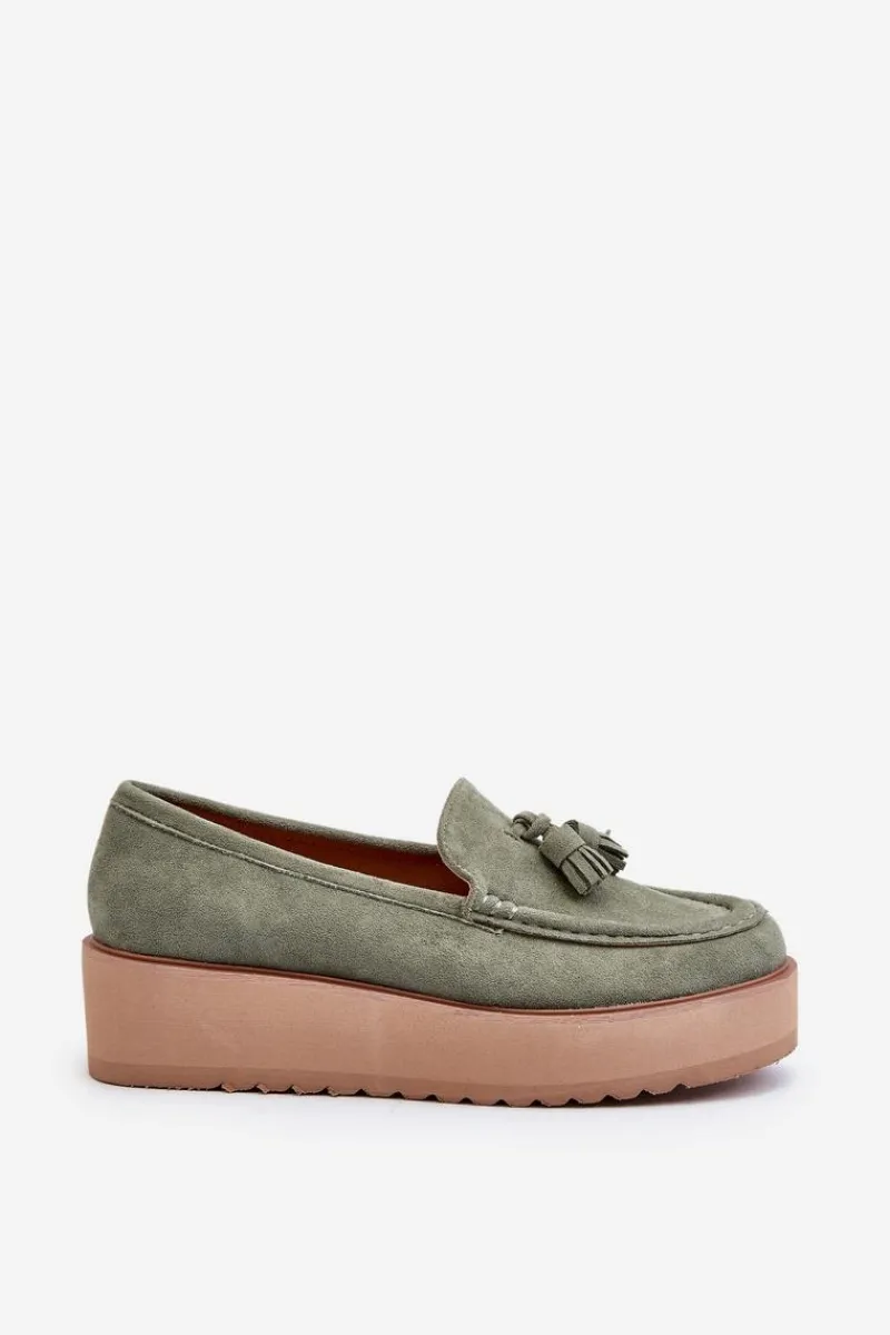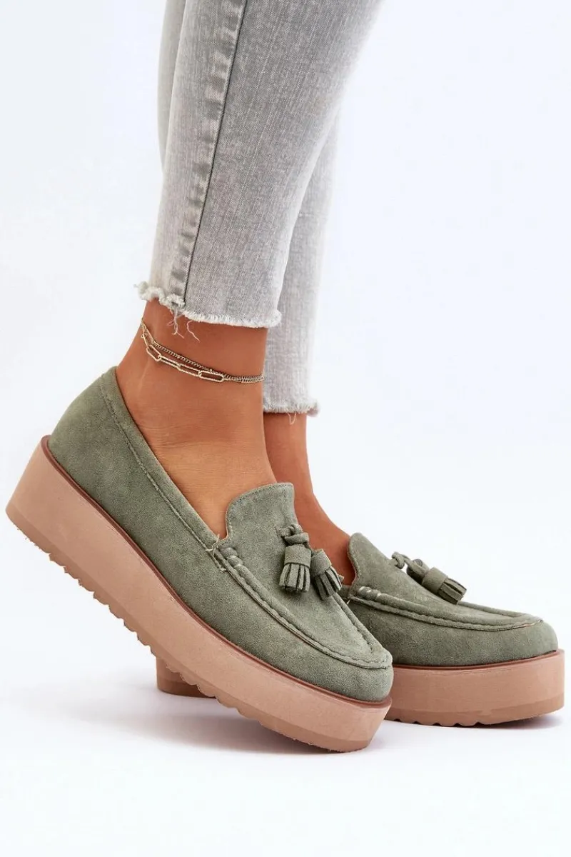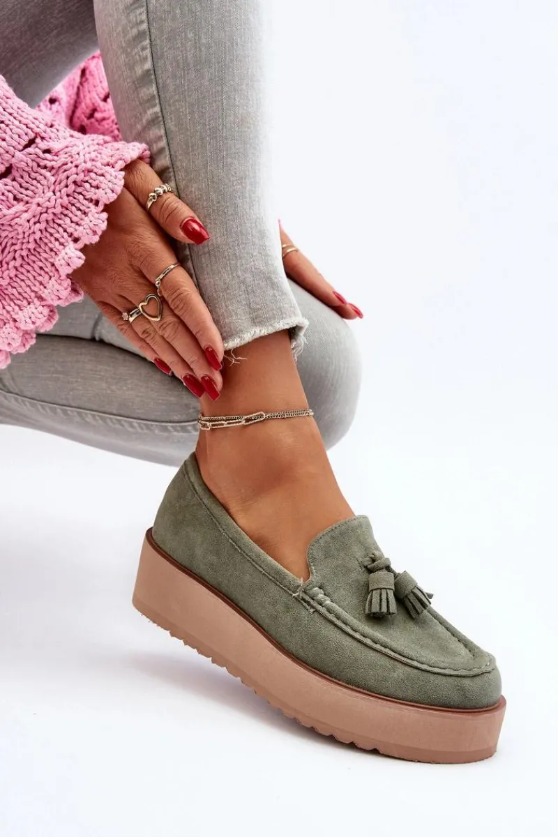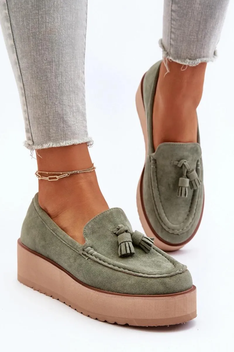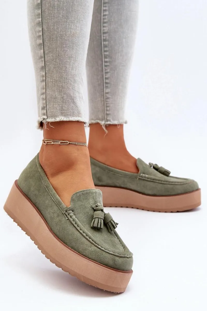 Klasyczne mokasyny damskie osadzone na platformie. Ozdobne frędzle na przodzie nadają im unikalnego stylu. Noski zaokrąglone, lekko usztywniony zapiętek. Idealne zarówno do casualowych, jak i bardziej wyrafinowanych stylizacji, te mokasyny będą doskonałym dodatkiem do Twojej garderoby! Przy wyborze rozmiaru prosimy sugerować się tabelą rozmiarów.