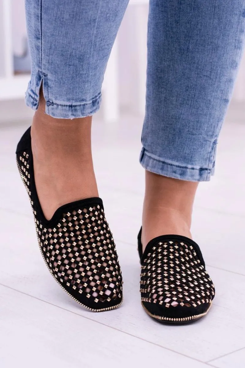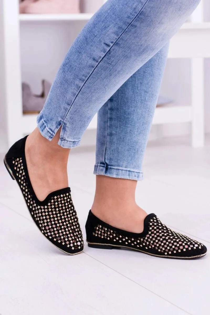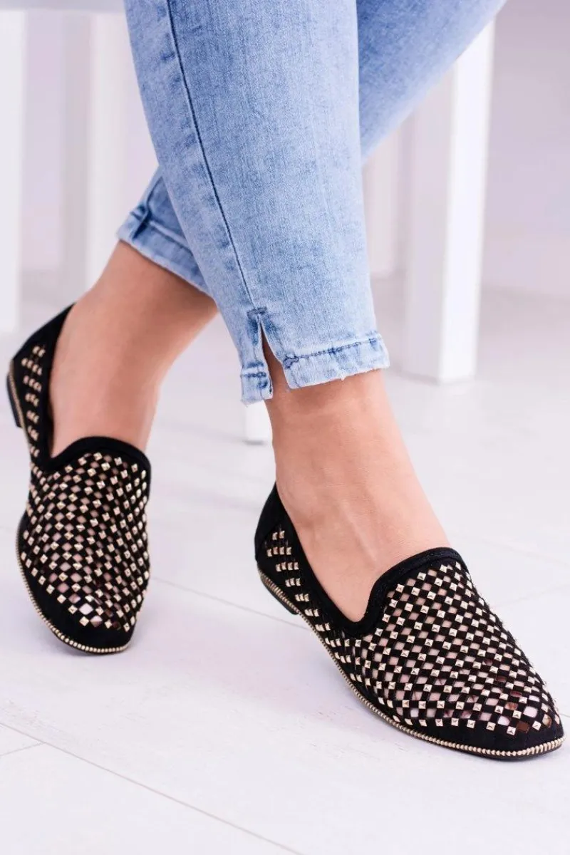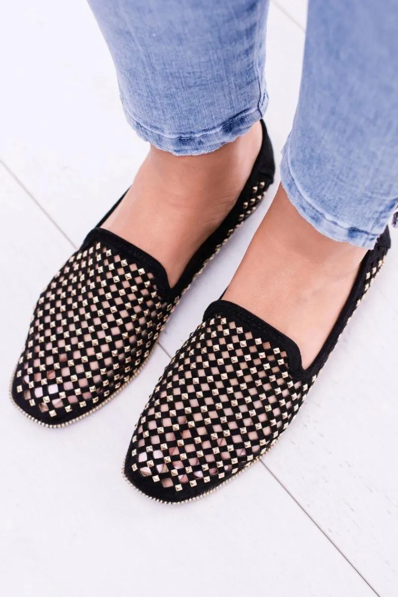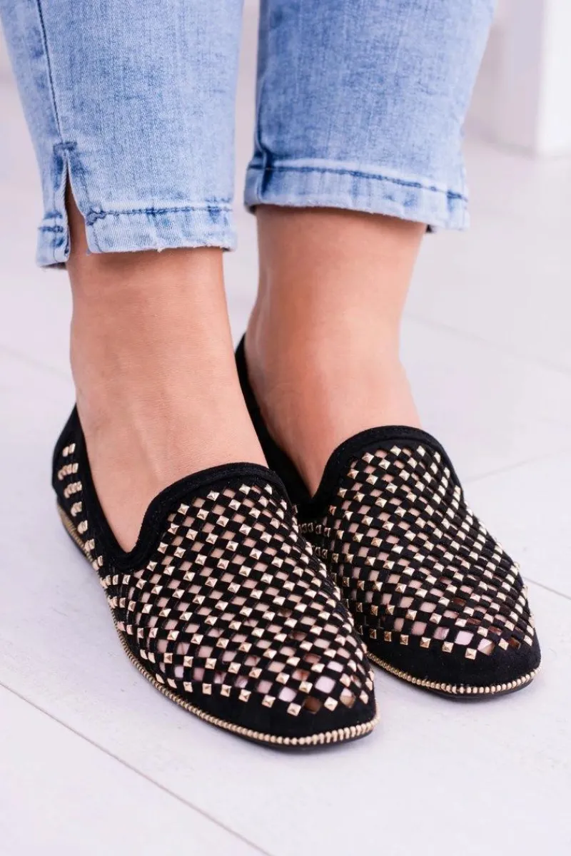 Mokasyny Damskie Zamszowe|Baleriny Klasyczne>Boto Lu Boo Czarne Ażurowe Baleriny Lordsy Ćwieki Carmar