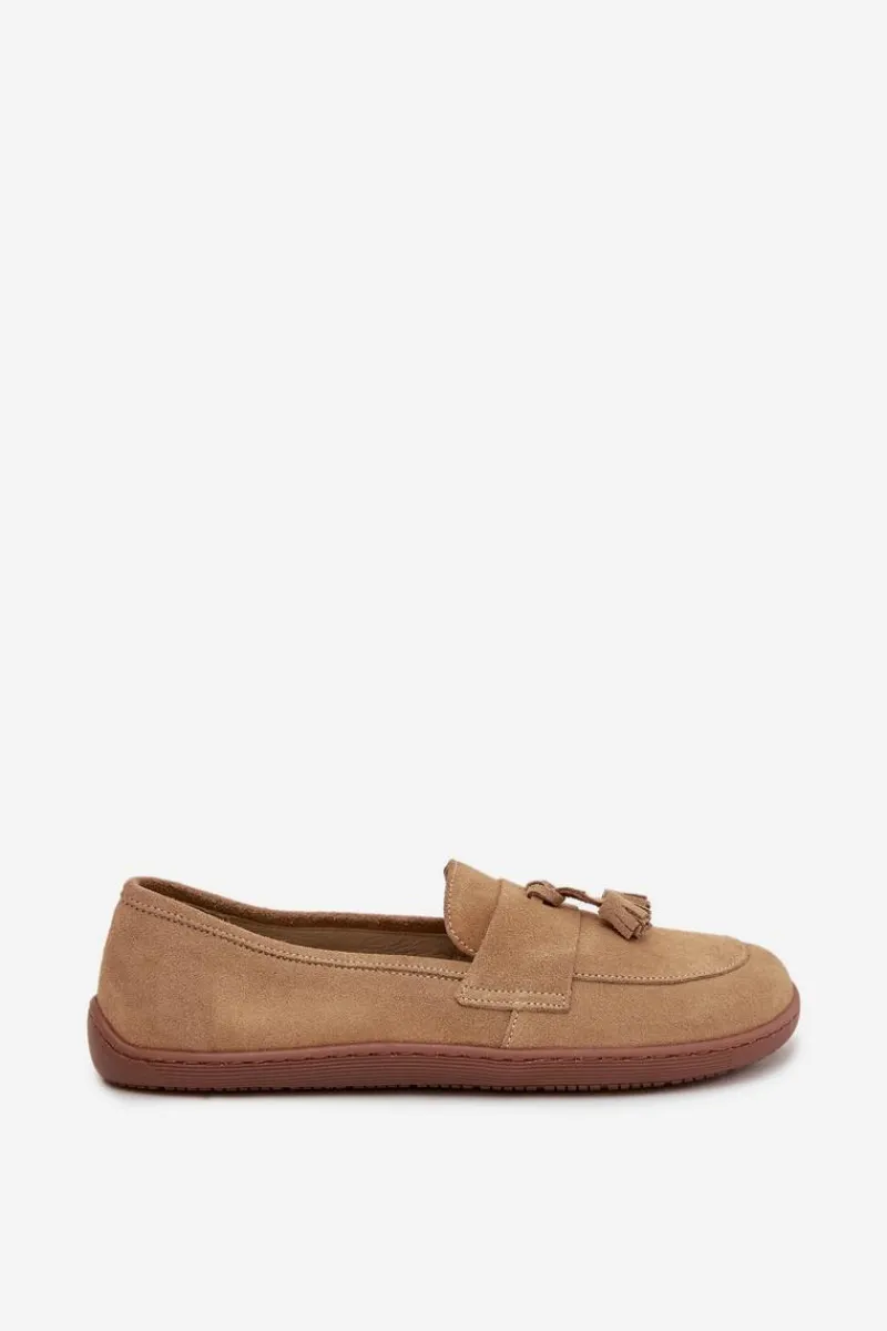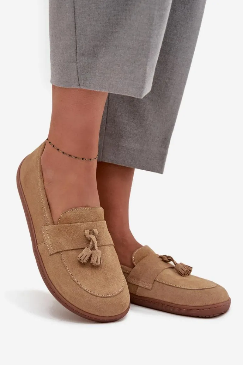 Mokasyny damskie typu barefoot to propozycja dla osób ceniących naturalny komfort i swobodę ruchu. Wykonane z miękkiego, naturalnego zamszu, doskonale dopasowują się do kształtu stopy, zapewniając przyjemne uczucie lekkości i wygody podczas noszenia. Z przodu cholewkę zdobi pasek z dwoma frędzelkami, które dodają całości subtelnego uroku i stylowego charakteru. To idealne buty na co dzień – sprawdzą się zarówno w luźnych, casualowych stylizacjach, jak i w bardziej eleganckich zestawach. Przy wyborze rozmiaru prosimy sugerować się tabelą rozmiarów.