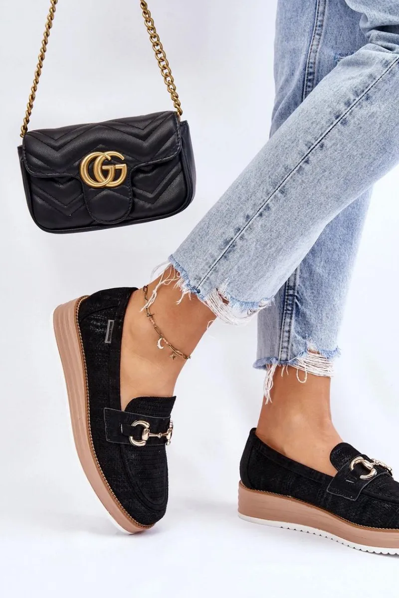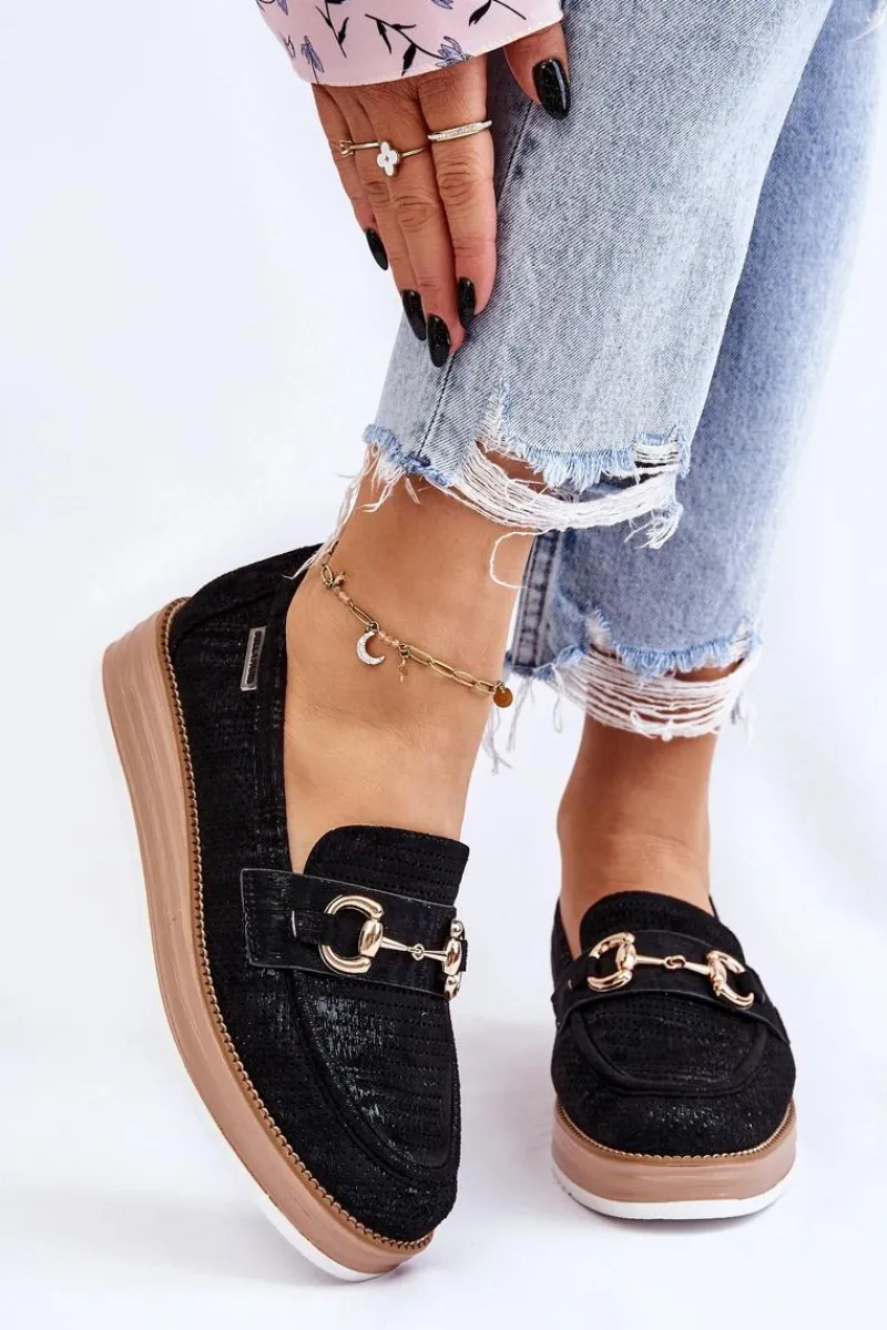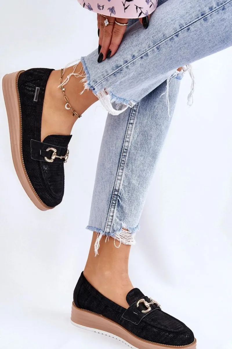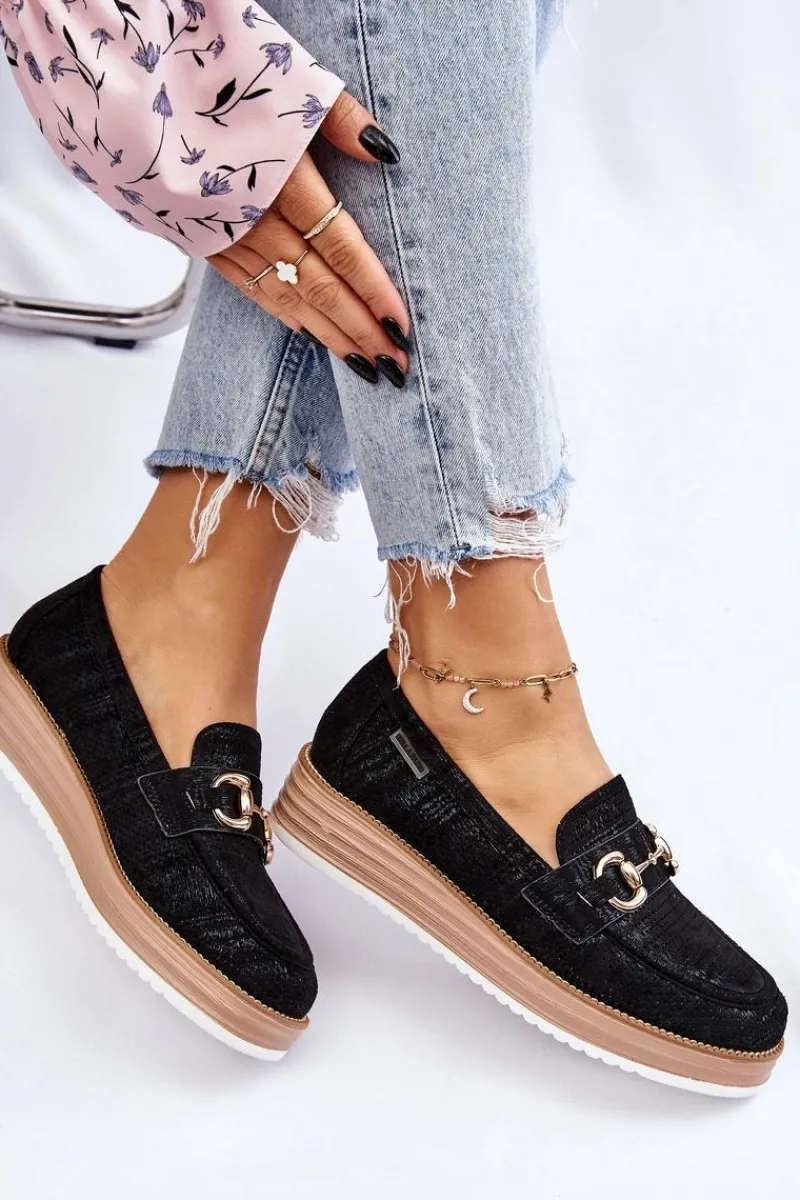 Klasyczne mokasyny damskie zostały osadzone na delikatnym koturnie i platformie. Wykonane z materiału przypominającego eko zamsz. Miękka wkładka z naturalnej skóry zapewni wygodę podczas użytkowania. Dodatkowo mokasyny te posiadają usztywniany zapiętek. Na przodzie znajduje się ozdobny element. Idealne do wielu wiosenno-jesiennych stylizacji. Przy wyborze rozmiaru prosimy sugerować się tabelą rozmiarów.