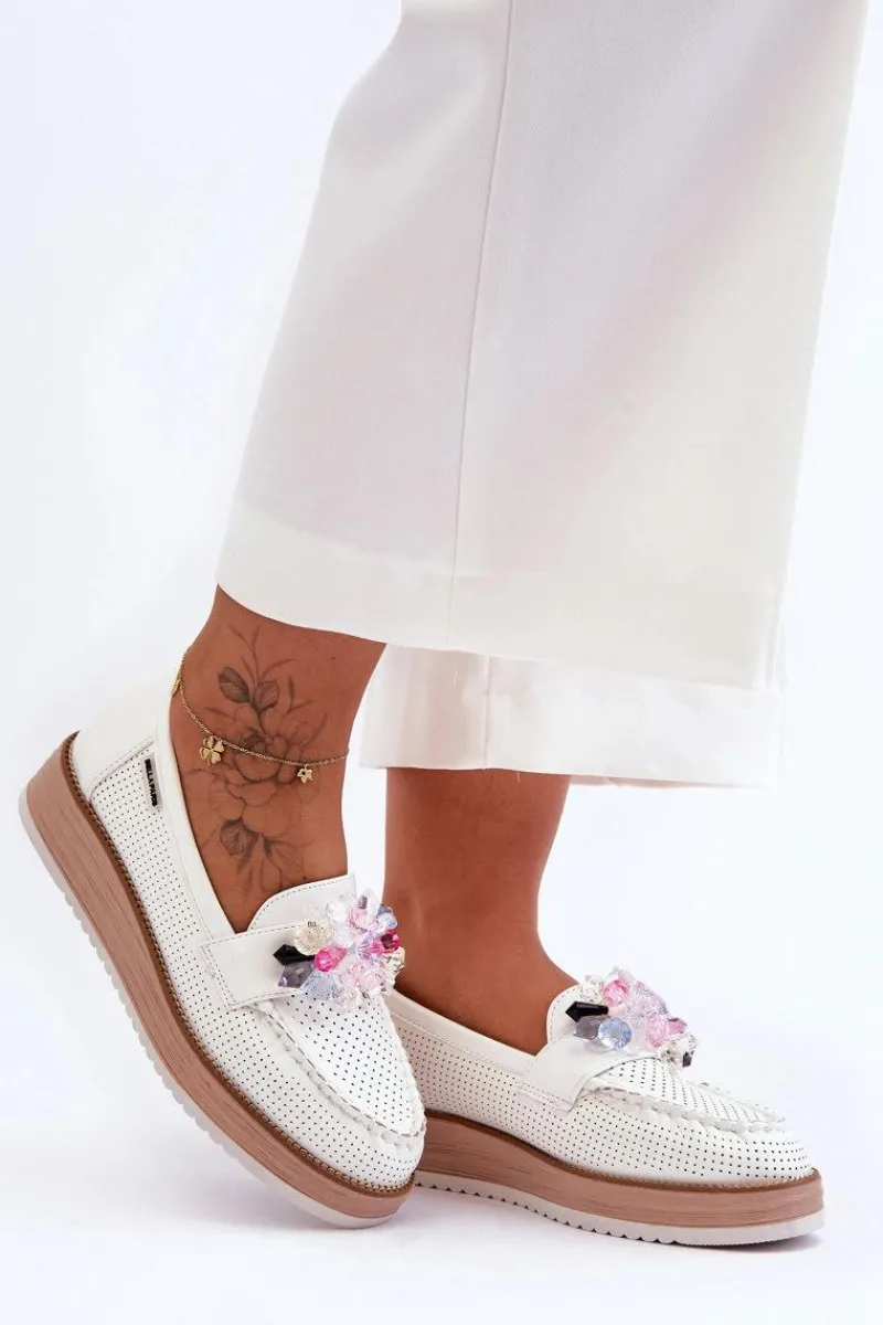 Piękne mokasyny damskie zostały osadzone na delikatnym koturnie i platformie. Wykonane z eko skóry z perforacją. Miękka wkładka z naturalnej skóry zapewni wygodę podczas użytkowania. Na przodzie znajdują się ozdobne kamienie o różnych kolorach. Ten model jest świetny do wiosenno-jesiennych stylizacji! Przy wyborze rozmiaru prosimy sugerować się tabelą rozmiarów.