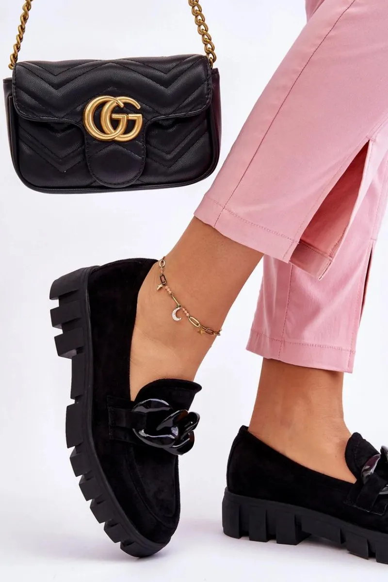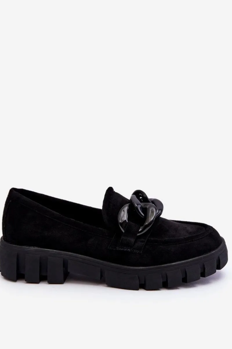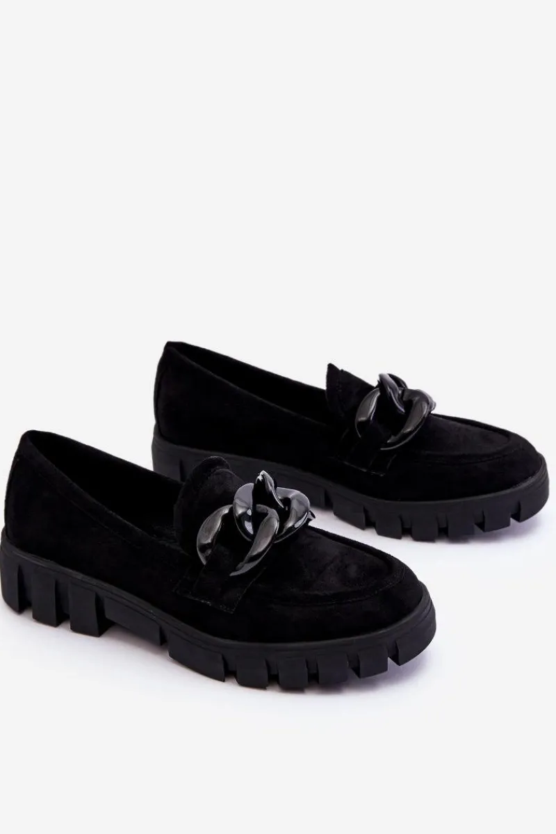 Mokasyny damskie na platformie i płaskim obcasie ze żłobieniami powinny być Twoje! Podeszwa została wykonana z gumowego tworzywa, dzięki któremu jest dodatkowo antypoślizgowa. Miękka wkładka z naturalnej skóry oraz wzmacniany zapiętek zapewni komfortowe użytkowanie. Mokasyny posiadają z przodu ozdobny łańcuch z tworzywa sztucznego. Przy wyborze rozmiaru prosimy sugerować się tabelą rozmiarów.