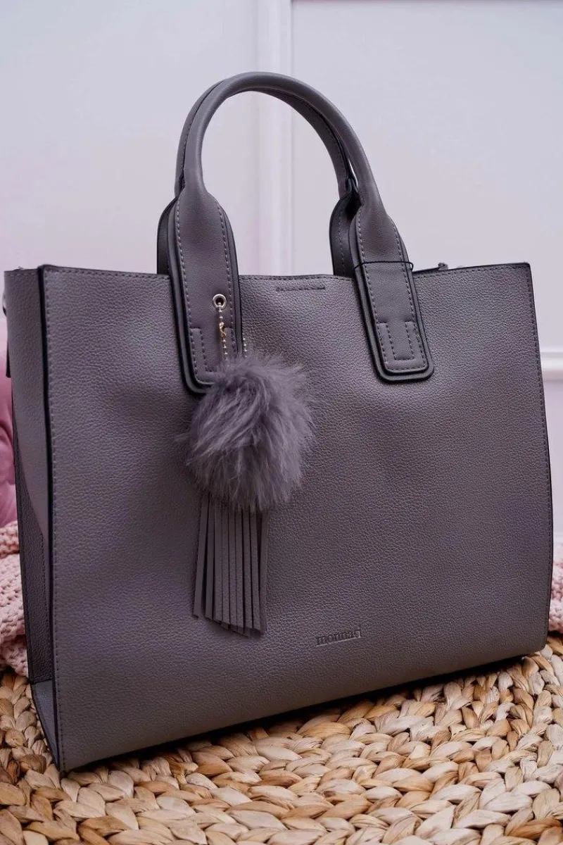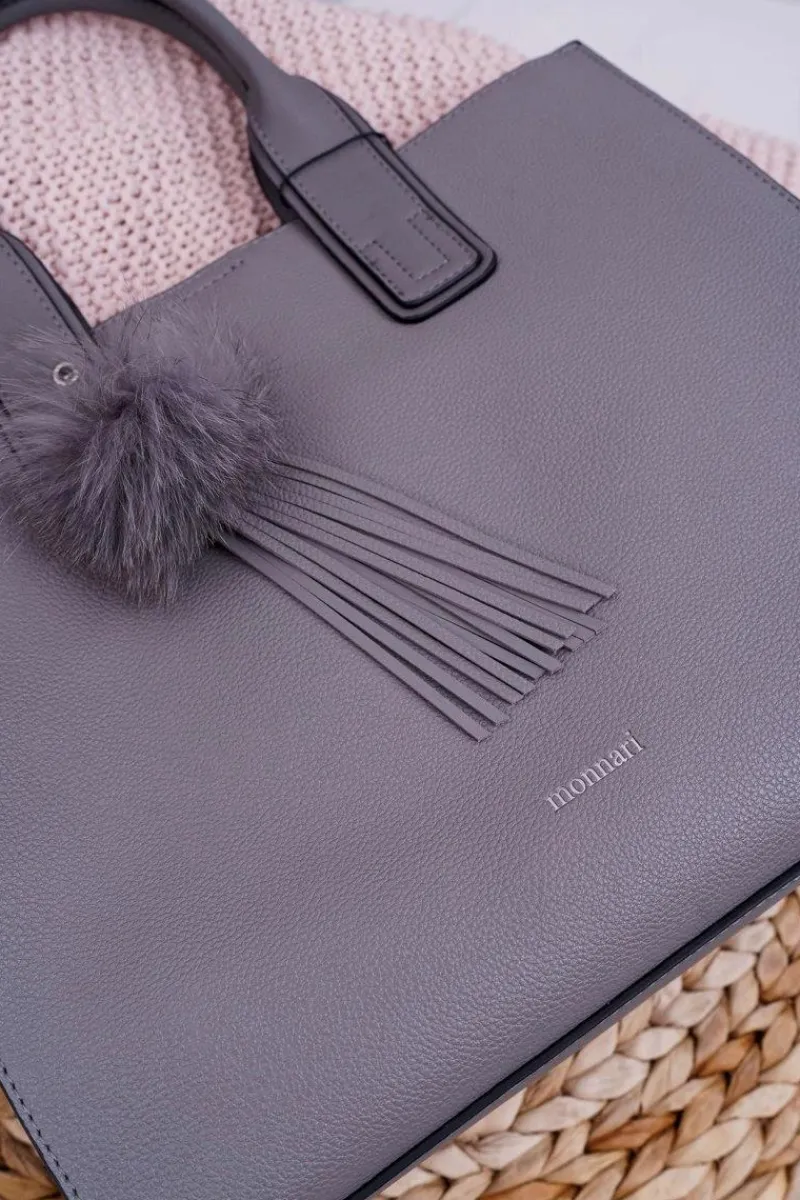 Wizytowa torebka damska o średniej wielkości (35, 29, 12cm) zawieszona na rączkach, z przywieszką w postaci sztucznego futerka i frędzelka. Na przednim panelu torebki tłoczone subtelne logo marki Monnari. Torba zamykana na suwak, w środku jasna podszewka i przegródki na drobiazgi. Polecamy ten model do eleganckiej stylizacji.