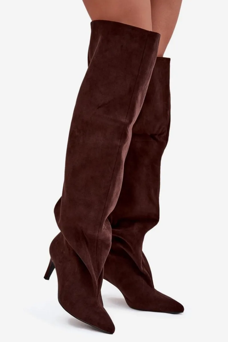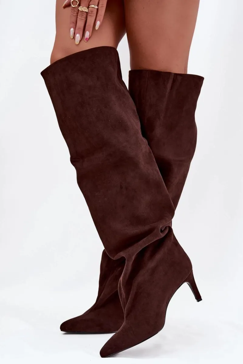 Kozaki Mavilla to propozycja dla kobiet, które cenią sobie elegancję i klasykę w nowoczesnym wydaniu. Wykonane z miękkiego eko zamszu w ciepłym czekoladowym odcieniu, prezentują się niezwykle stylowo i kobieco. Wysoka cholewka sięgająca za kolano pięknie wydłuża nogi, a smukła linia buta subtelnie podkreśla sylwetkę. To model, który doskonale łączy modny wygląd z wygodą użytkowania.