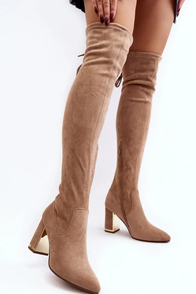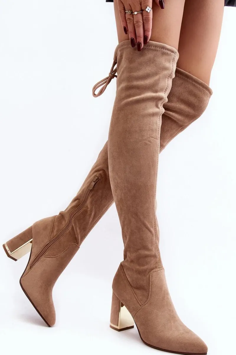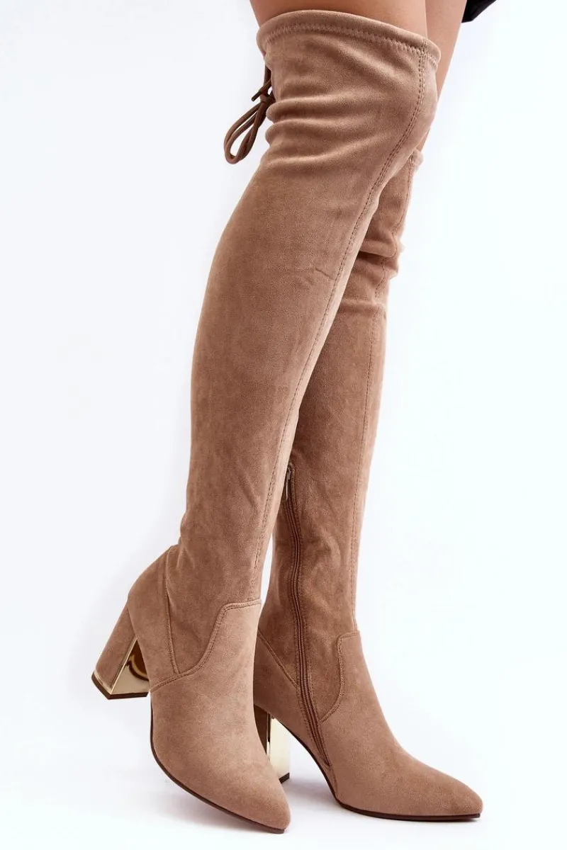 Kozaki damskie z cholewką za kolano. Wykonane z eko zamszu. Osadzone na obcasie w postaci słupka, który wzbogacony został lustrzanym elementem. Na górze cholewki znajduje się wiązanie. Model wsuwany z dodatkowym suwakiem. W środku ocieplone na wysokości stopy. Idealny model do sukienek mini czy spódniczek. Koniecznie powinnaś je mieć! Przy wyborze rozmiaru prosimy sugerować się tabelą rozmiarów.