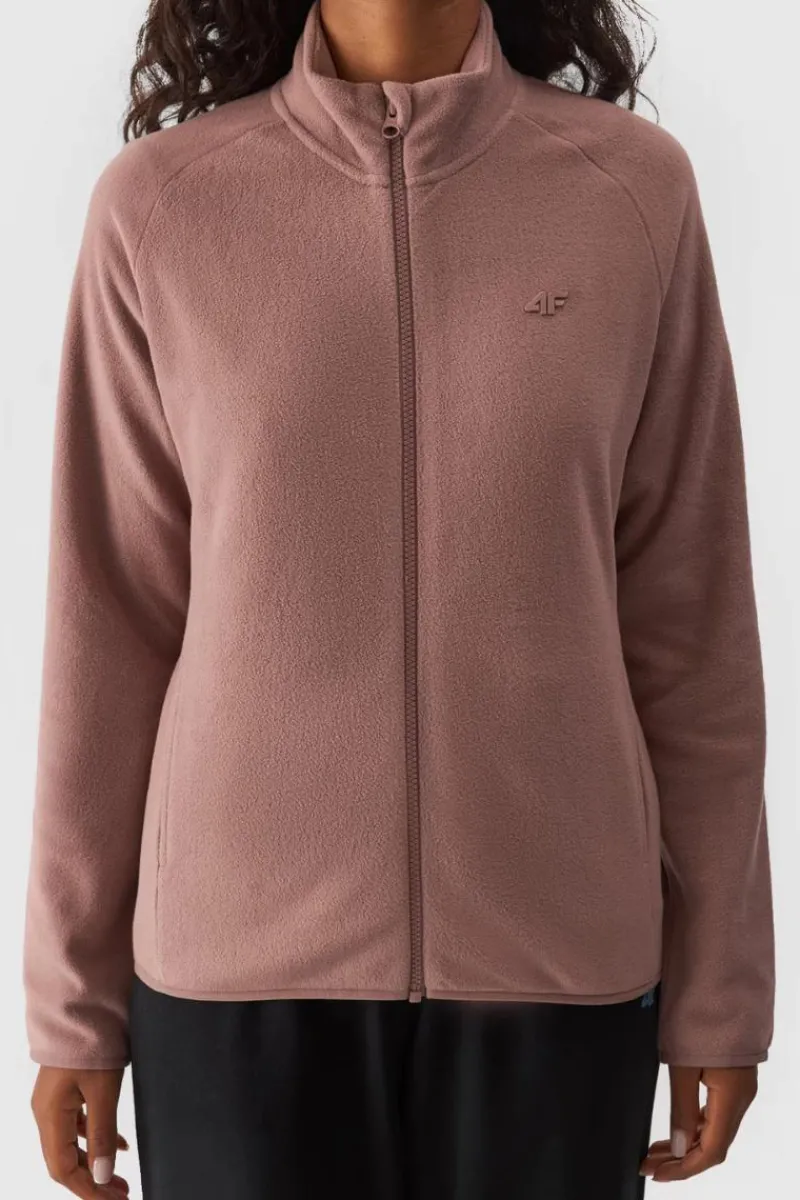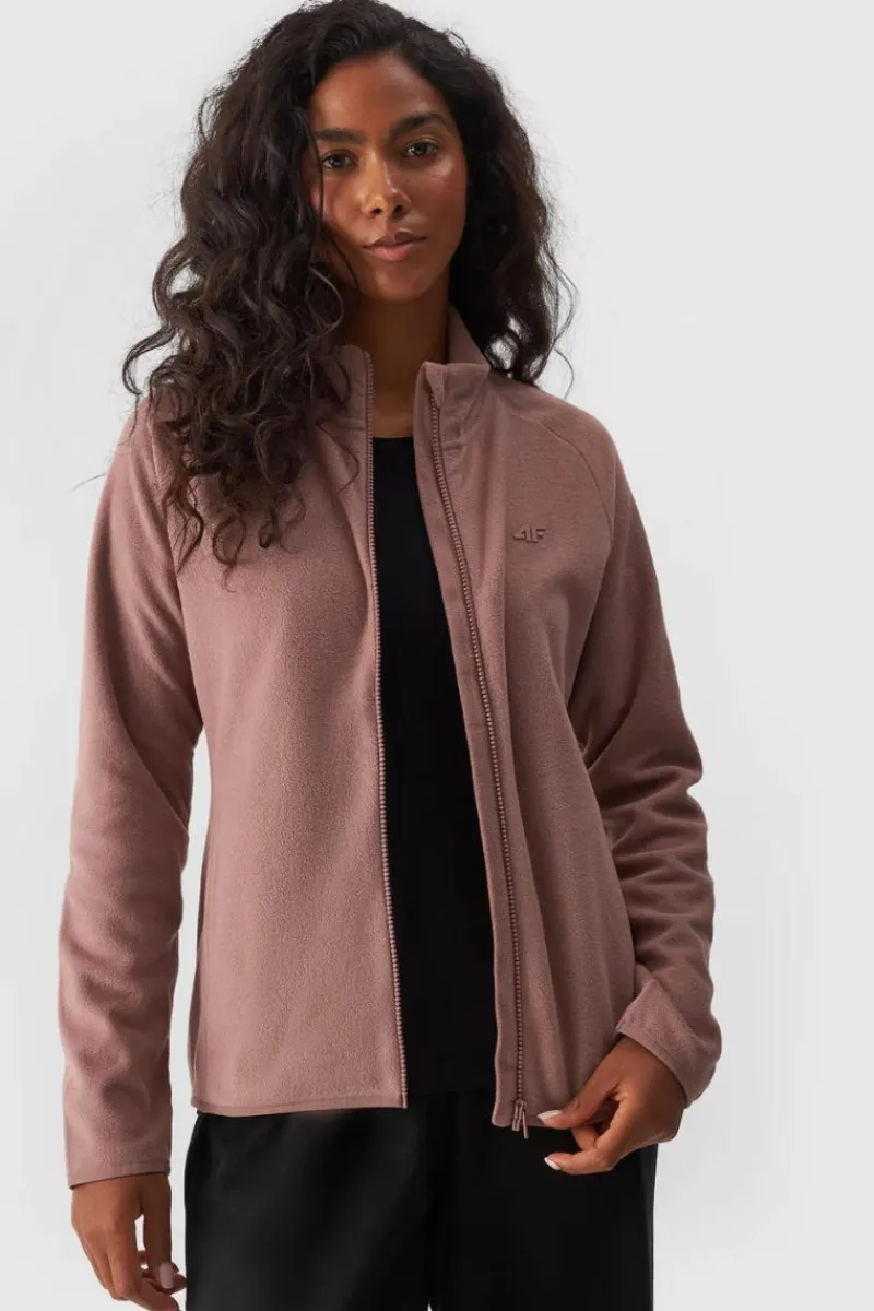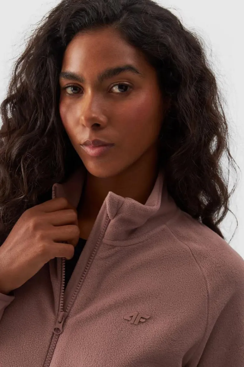 Bluza z polaru dla kobiety jest wykonana z cienkiego mikropolaru, który cechuje się dobrą izolacją termiczną przy wyjątkowo lekkiej wadze. Materiał ten oddycha i szybko schnie. Technologia 4F Warm wspiera komfort cieplny. Posiada krój regular, który wygodnie dopasowuje się do sylwetki oraz standardową długość sięgającą do linii bioder. Bluza z polaru dla kobiety posiada stójkę, która osłania szyję. Klasycznie wykończone mankiety. Po bokach znajdują się 2 kieszenie otwarte. Zapinany na jednokierunkowy zamek główny. Raglanowe rękawy nie ograniczają ruchów. Materiał dodatkowy: Bawełna 60%, Poliester 40% Materiał główny: Poliester 100%