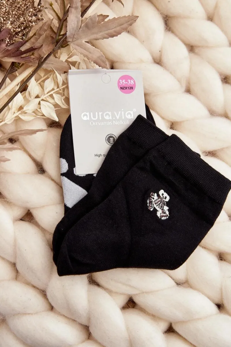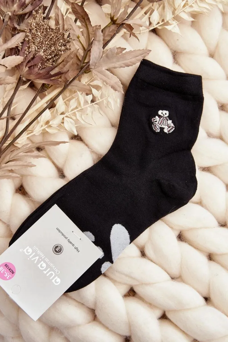 New Aura.via Bawełniane Skarpety Damskie Z Naszywką Miś Czarne