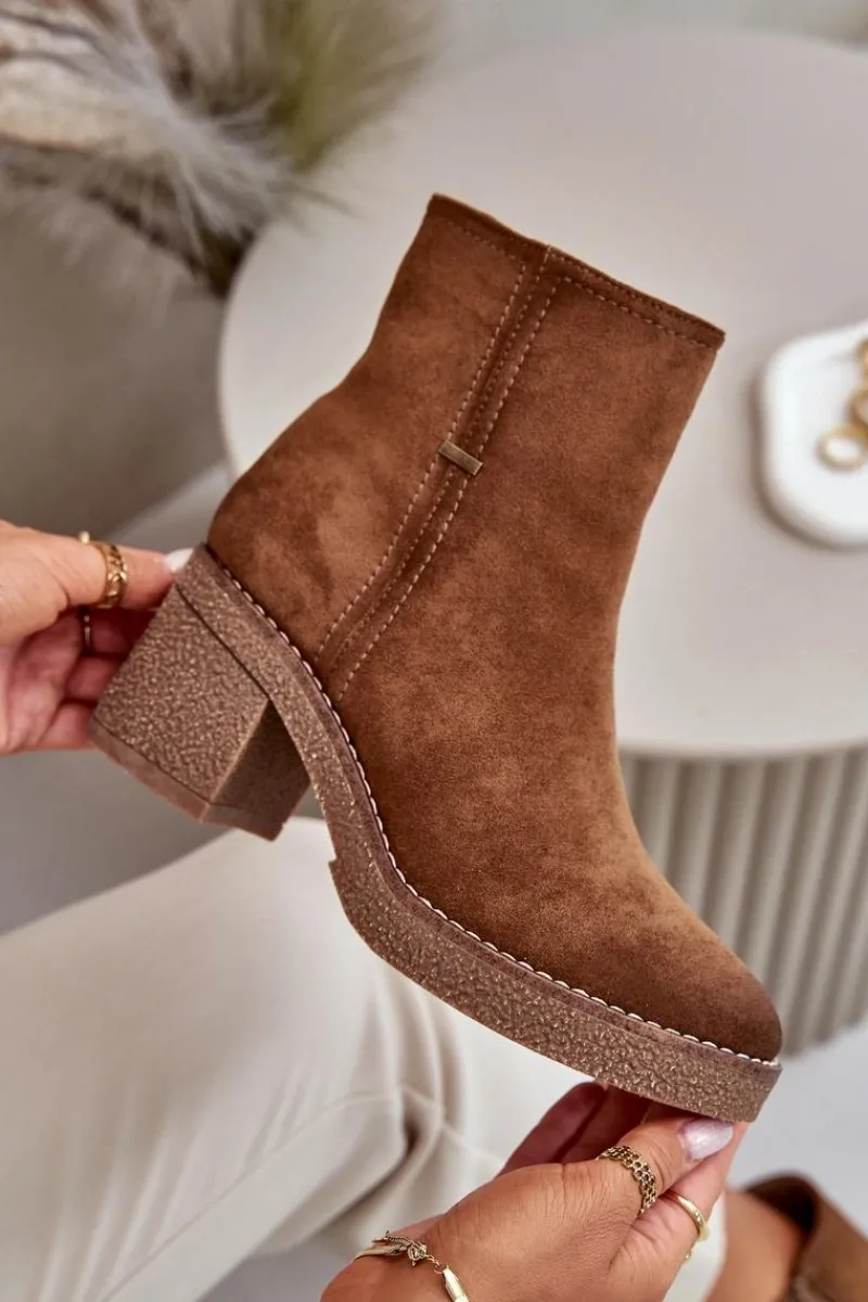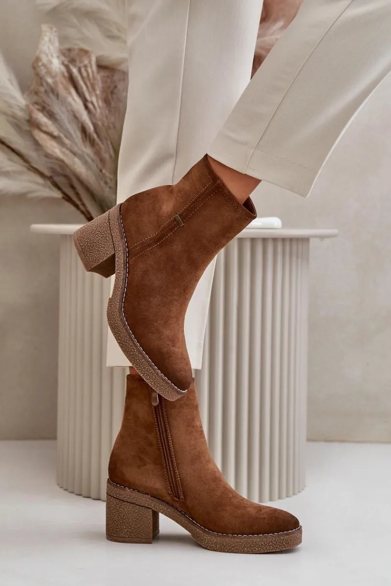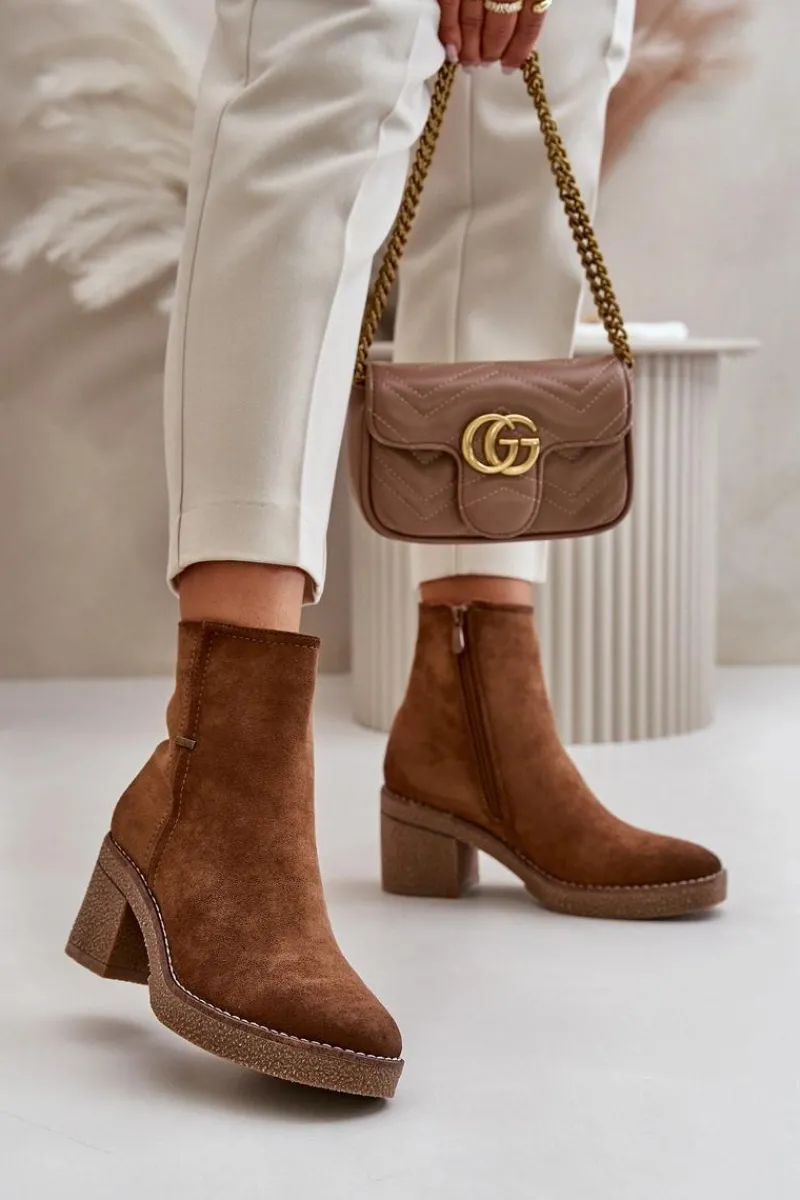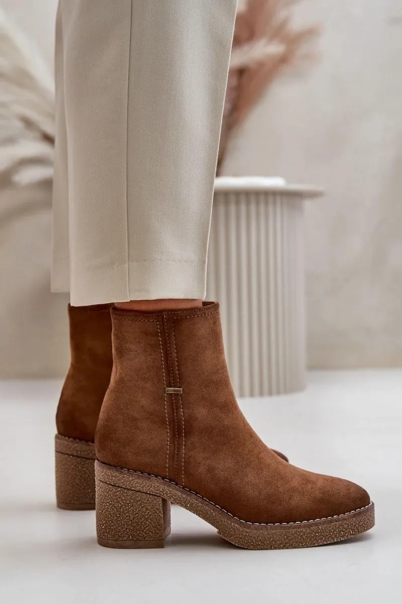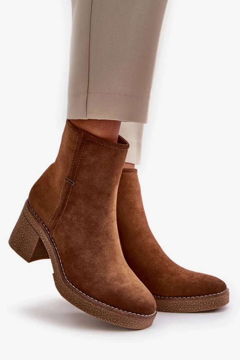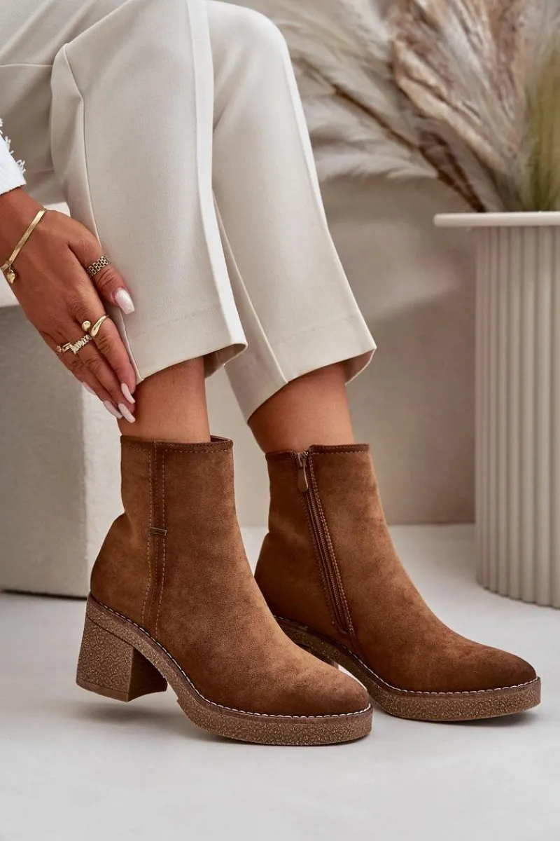 Damskie botki z eko zamszu, który jest miękki i przyjemny w dotyku. Osadzone na stabilnym obcasie w formie słupka, co zapewnia wygodę i pewność chodzenia przez cały dzień, jednocześnie dodając kilka centymetrów wzrostu i podkreślając sylwetkę. Wnętrze ocieplone jest kocem obuwniczym, który zapewnia ciepło i komfort w chłodniejsze dni, chroniąc stopy przed zimnem. Dzięki zapięciu na zamek, ich zakładanie i zdejmowanie jest szybkie i bezproblemowe, co jest dużym atutem w codziennym użytkowaniu. Przy wyborze rozmiaru prosimy sugerować się tabelą rozmiarów.