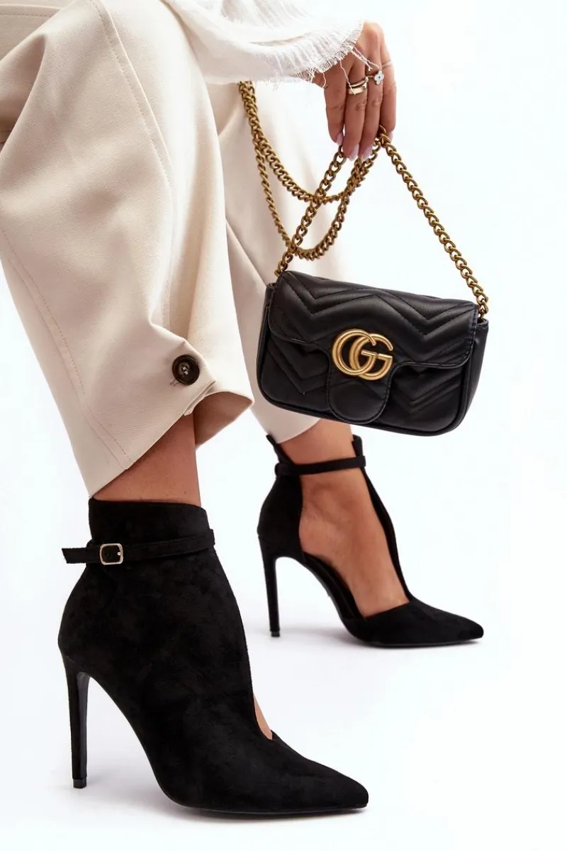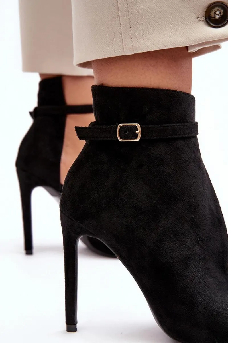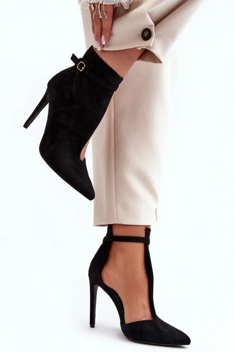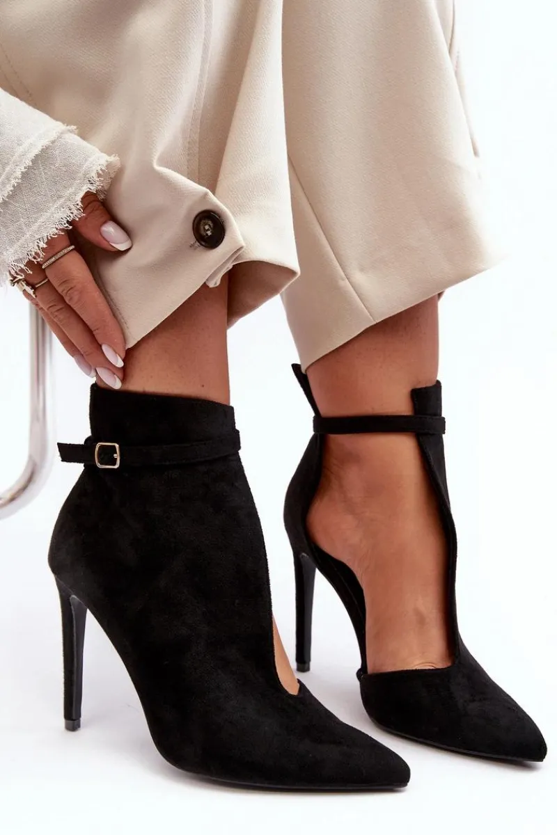 Stylowe botki damskie wykonane z eko zamszu to elegancka propozycja dla kobiet ceniących modny, kobiecy wygląd. Model osadzony na smukłej szpilce pięknie podkreśla sylwetkę i dodaje lekkości każdej stylizacji. Szpiczaste noski optycznie wysmuklają nogi, a subtelne wycięcie na cholewce nadaje całości nowoczesnego charakteru. Górną część zdobi cienki pasek z klamrą, który stanowi delikatny, stylowy akcent. Miękka wkładka z eko skóry gwarantuje wygodę nawet podczas dłuższego noszenia. To wyjątkowe botki, które doskonale sprawdzą się zarówno do eleganckich, jak i wieczorowych stylizacji. Przy wyborze rozmiaru prosimy sugerować się tabelą rozmiarów.