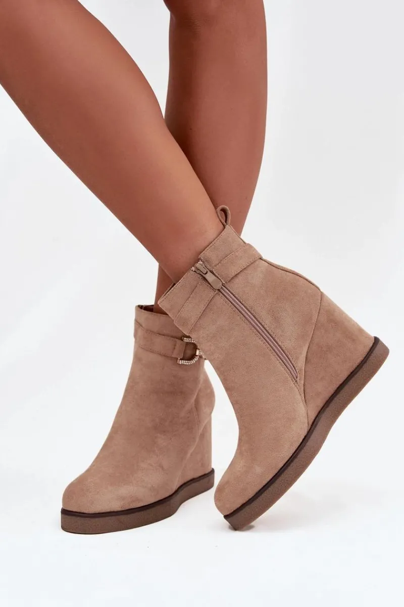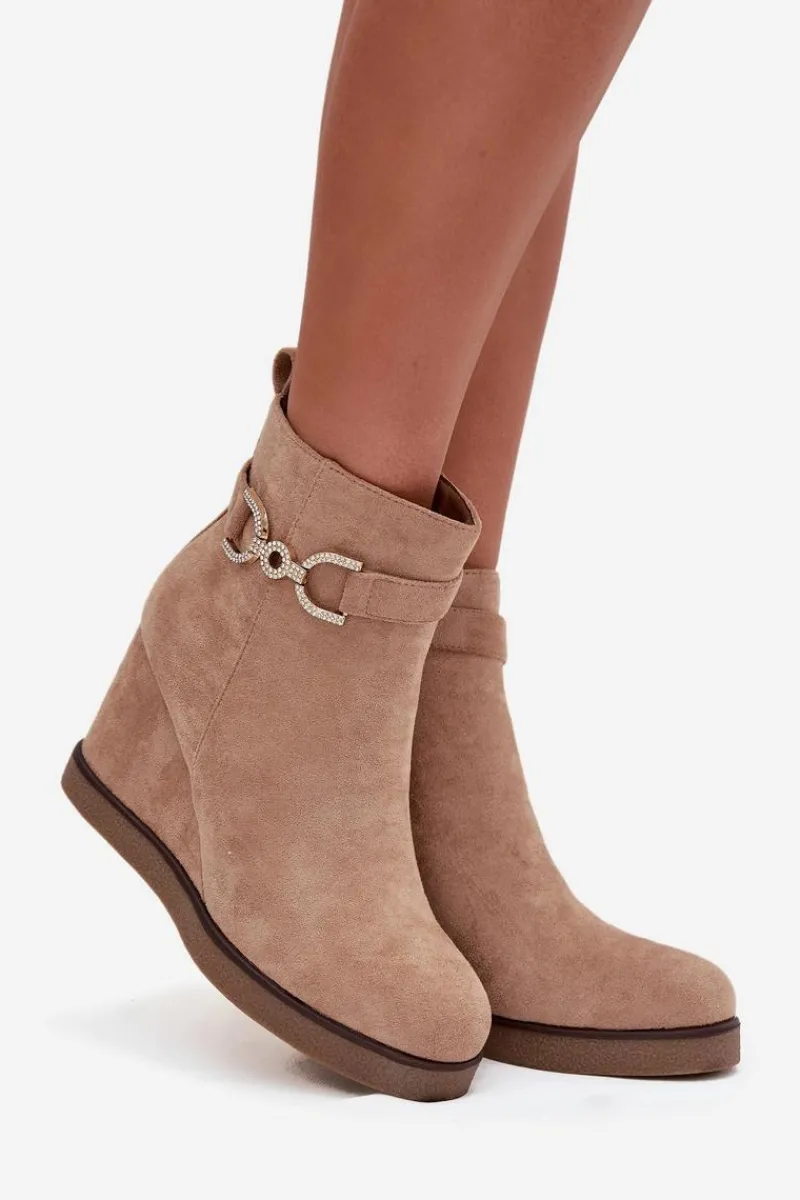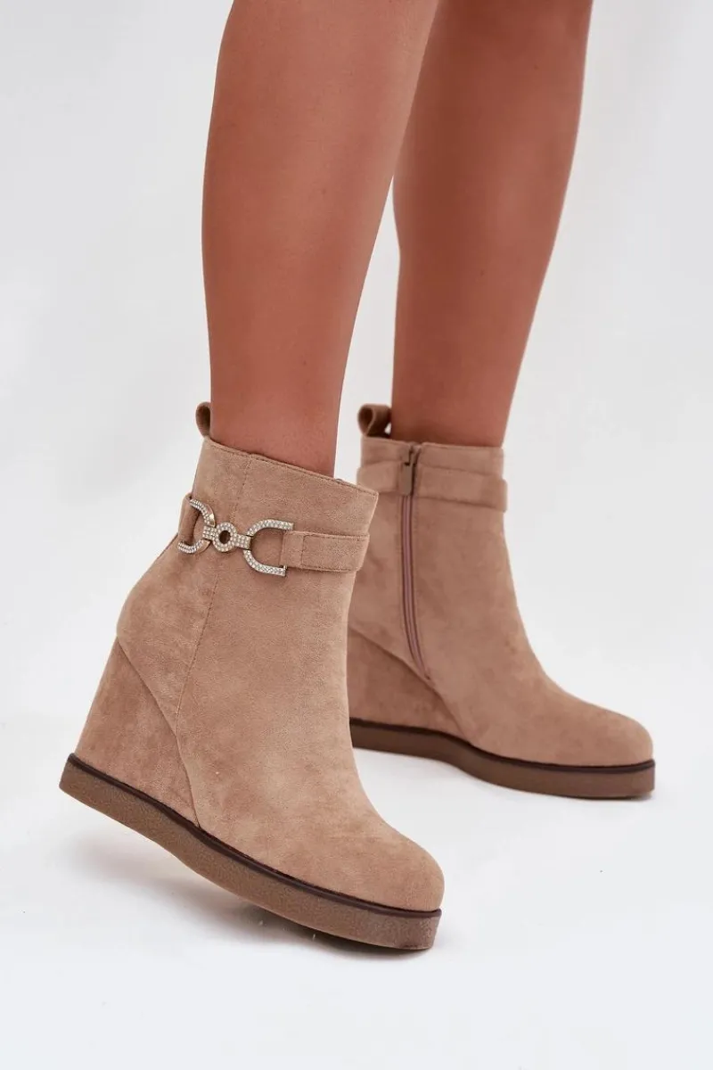 Botki damskie z eko zamszu to stylowa propozycja dla kobiet ceniących wygodę i modny wygląd. Osadzone na koturnie zapewniają komfort noszenia i subtelnie podkreślają sylwetkę, a zaokrąglone noski nadają im klasycznego charakteru. Model wyróżnia się paskiem z ozdobnym detalem umieszczonym na górze cholewki, który dodaje całości eleganckiego akcentu. Zamek po boku ułatwia zakładanie i zdejmowanie, czyniąc buty praktycznym wyborem na co dzień. Przy wyborze rozmiaru prosimy sugerować się tabelą rozmiarów.