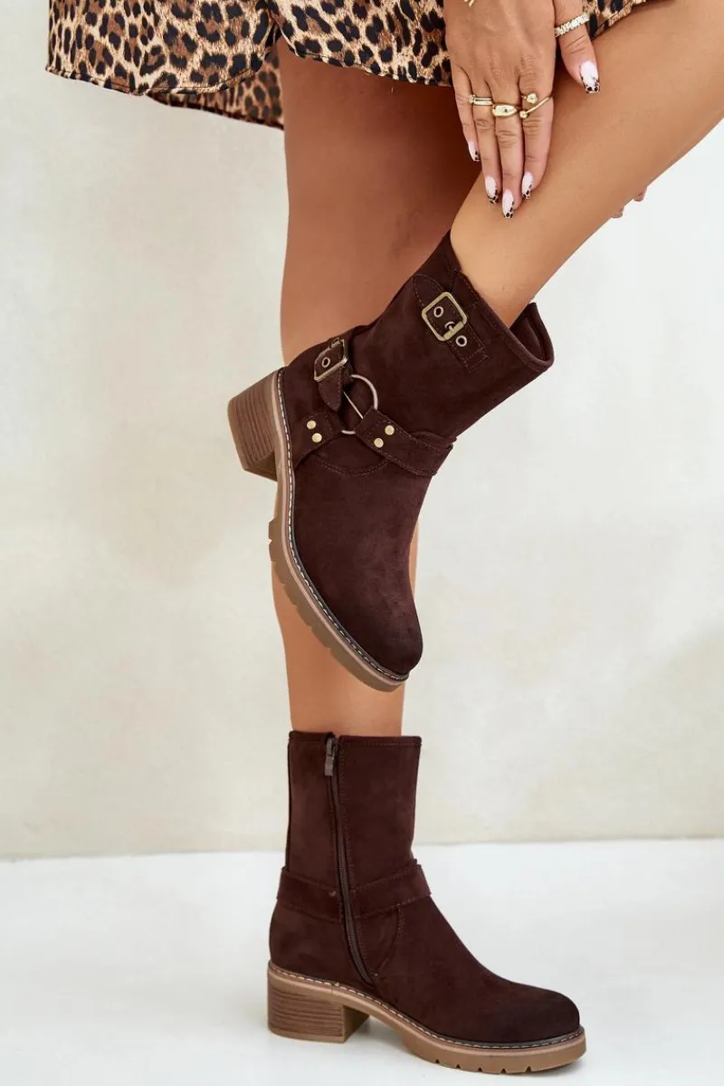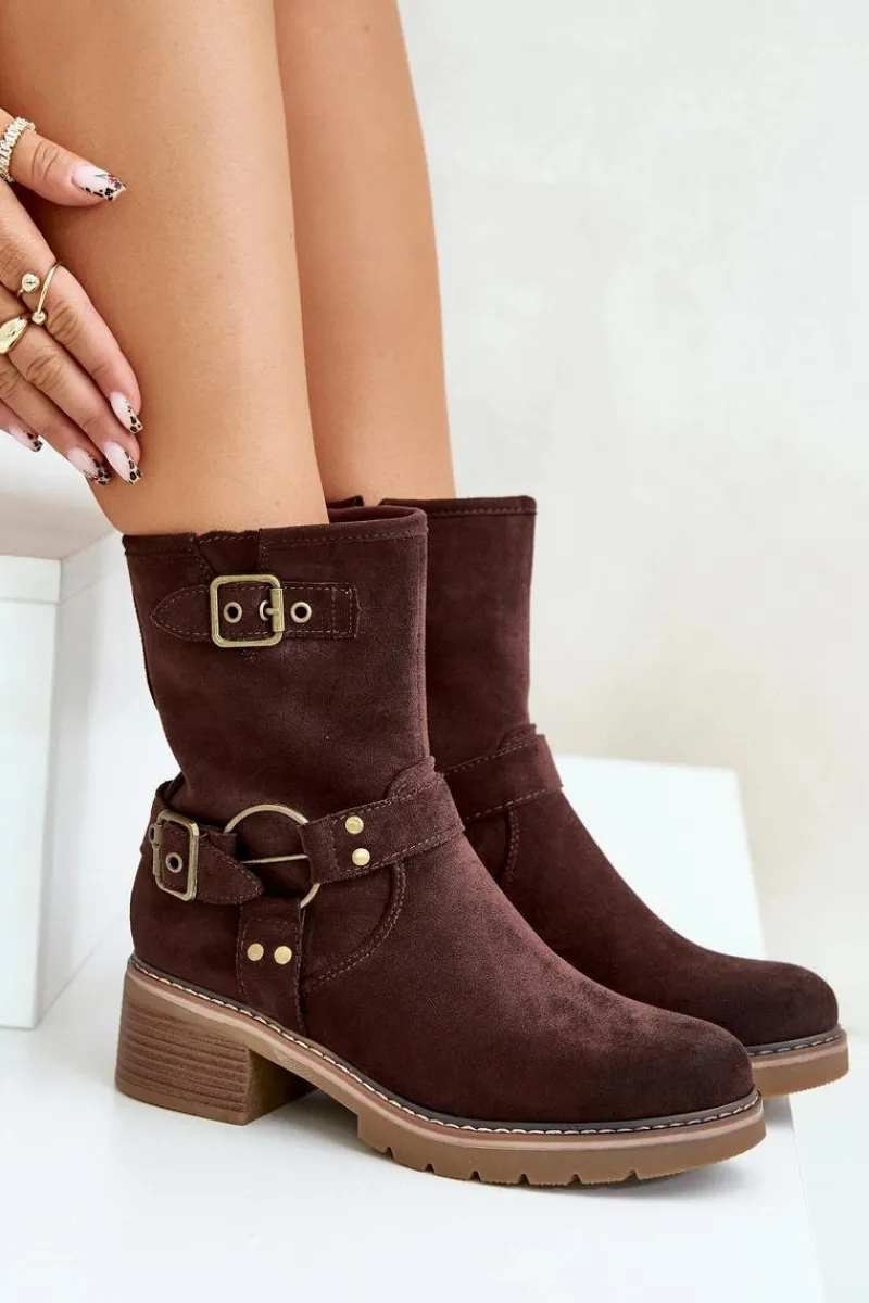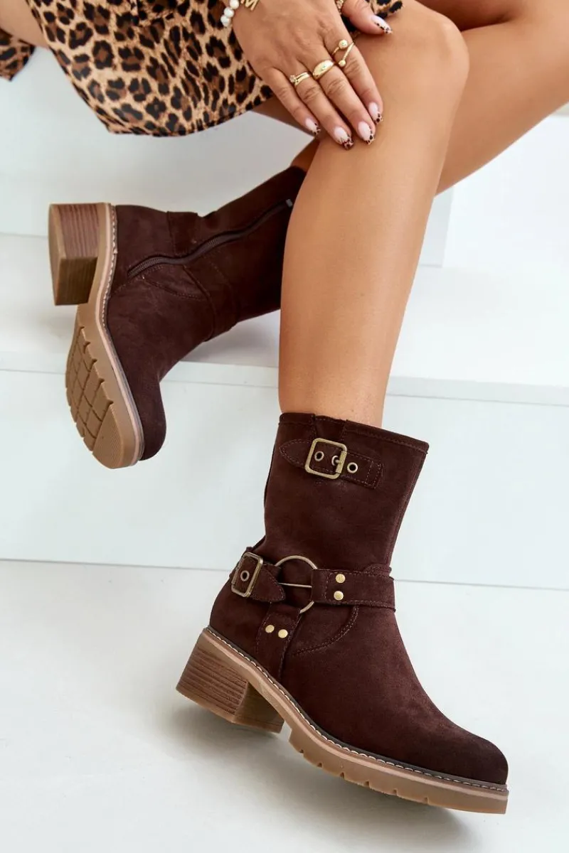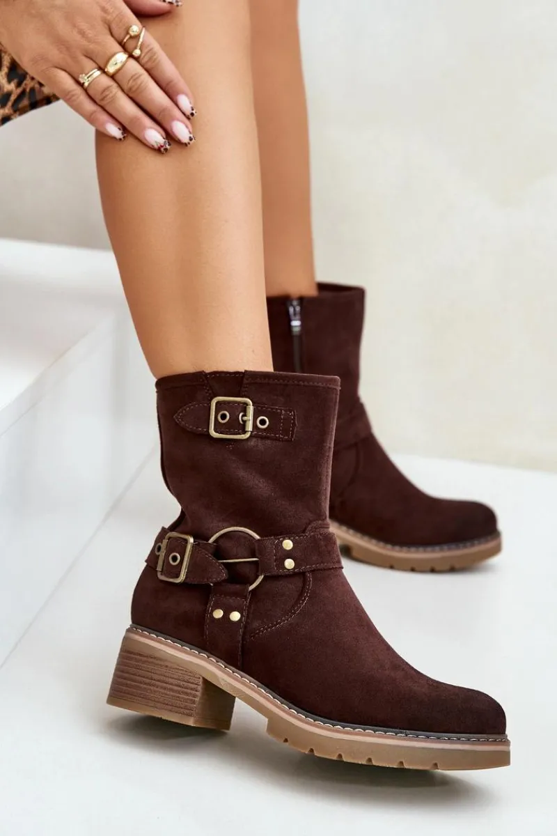 Botki damskie wykonane z eko zamszu. Osadzone na niskim obcasie. Model zapinany na zamek. Noski zaokrąglone. Cholewka ozdobiona paskami z klamrami. Klasyczny fason, który dopasujesz do wielu casualowych stylizacji! Przy wyborze rozmiaru prosimy sugerować się tabelą rozmiarów.