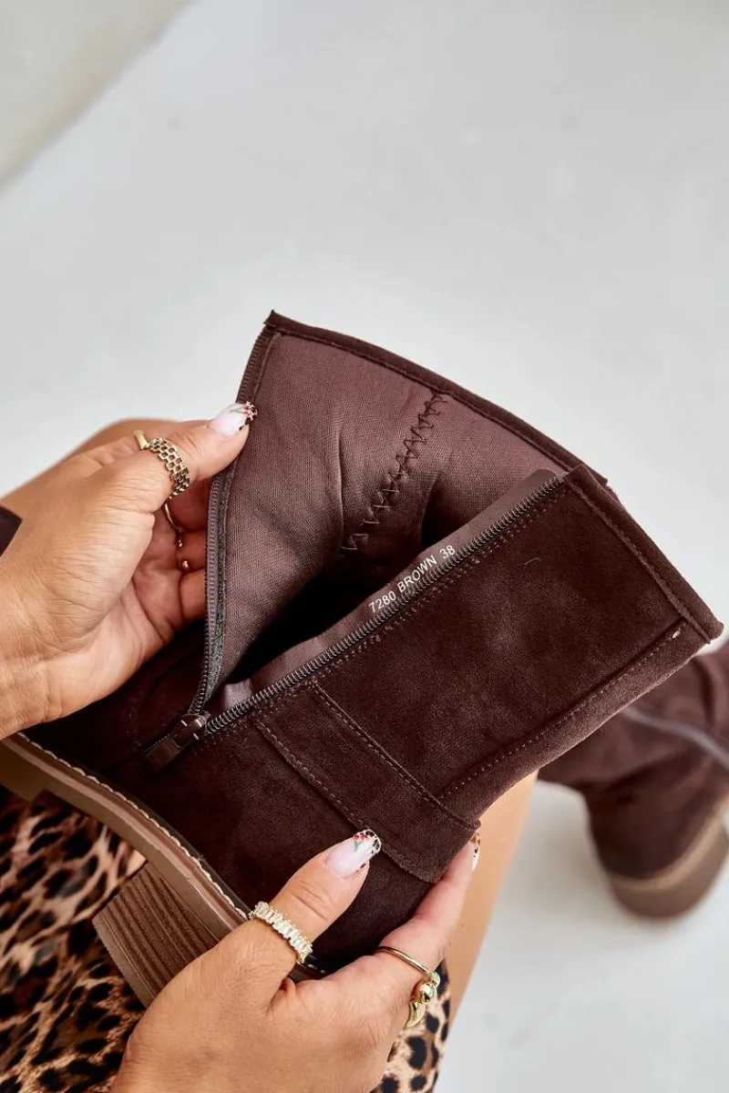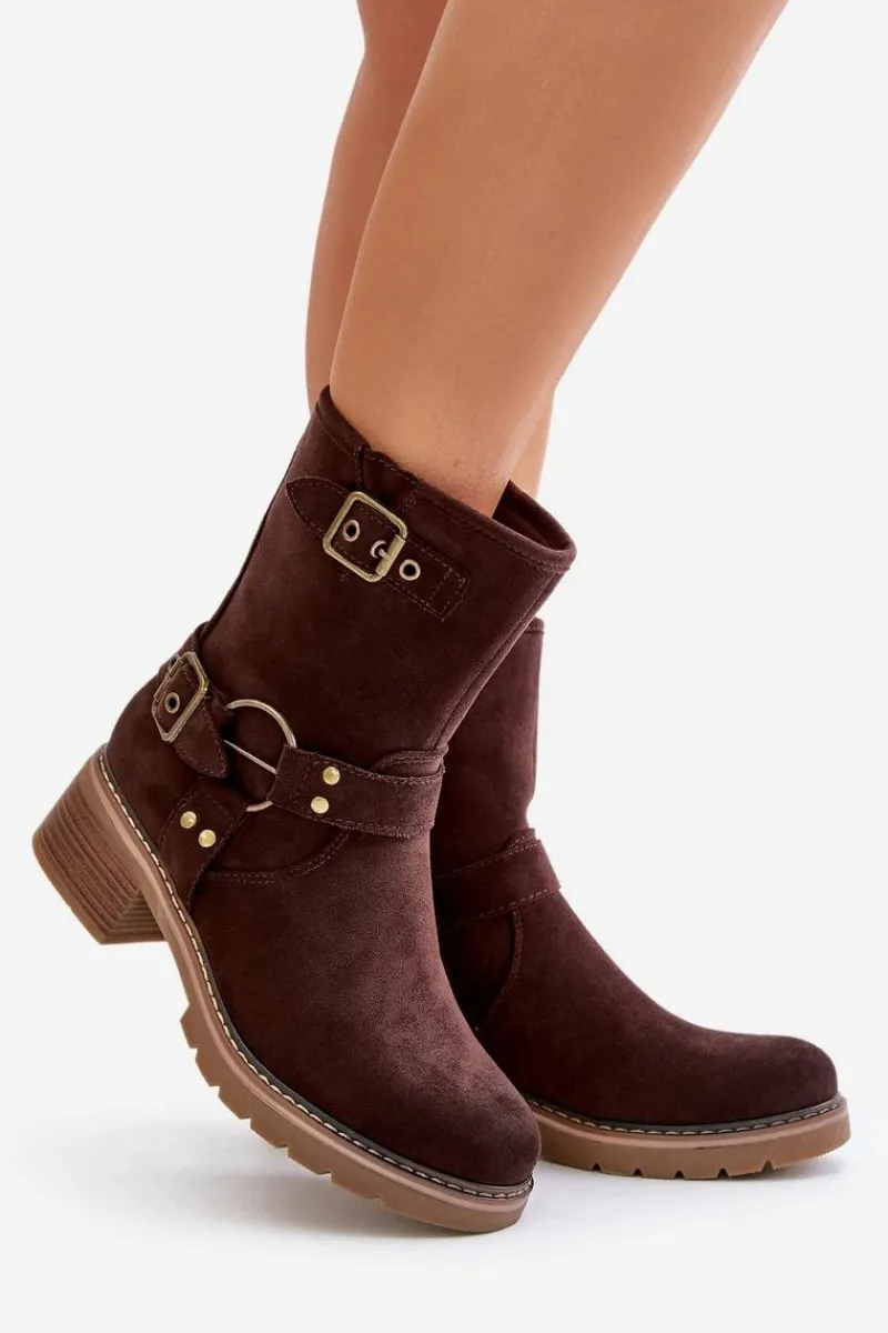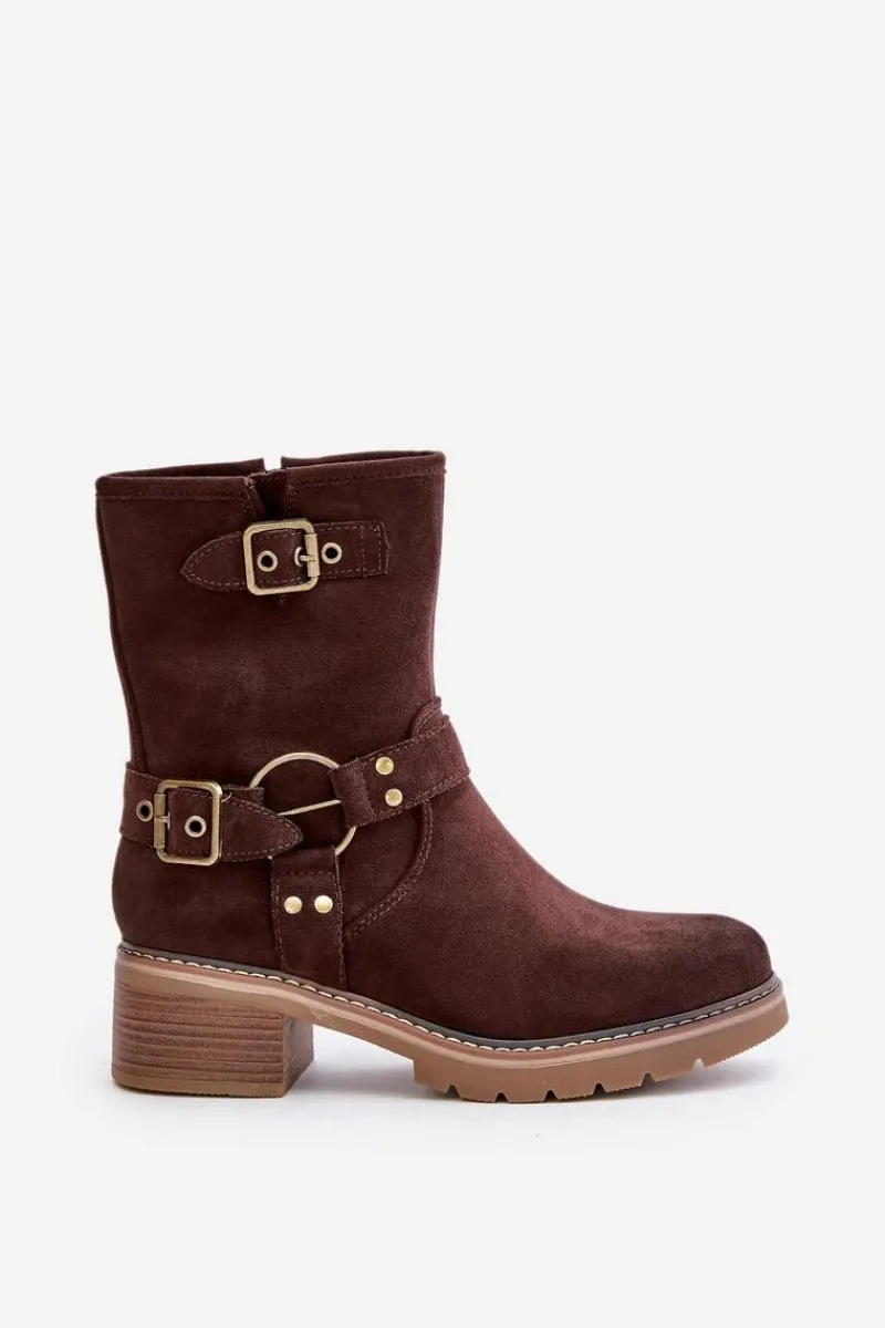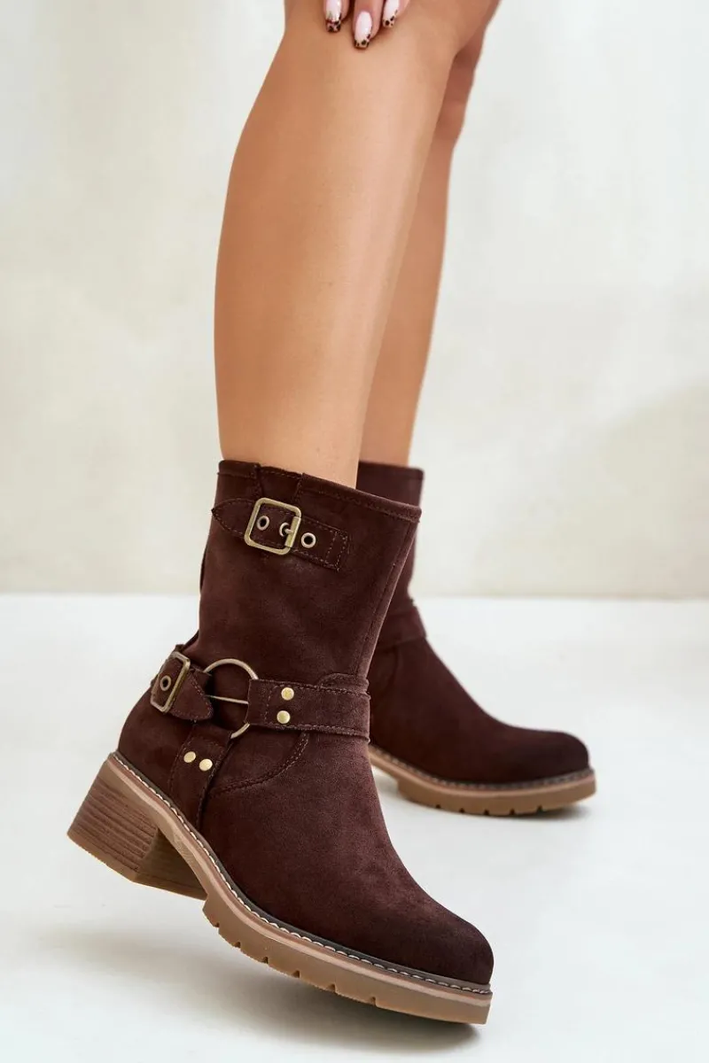 Botki damskie wykonane z eko zamszu. Osadzone na niskim obcasie. Model zapinany na zamek. Noski zaokrąglone. Cholewka ozdobiona paskami z klamrami. Klasyczny fason, który dopasujesz do wielu casualowych stylizacji! Przy wyborze rozmiaru prosimy sugerować się tabelą rozmiarów.