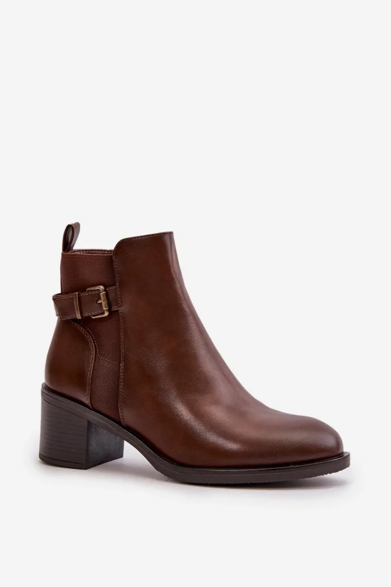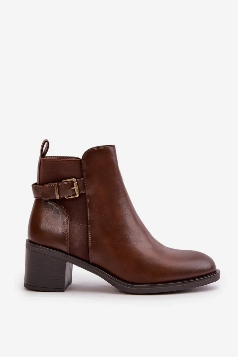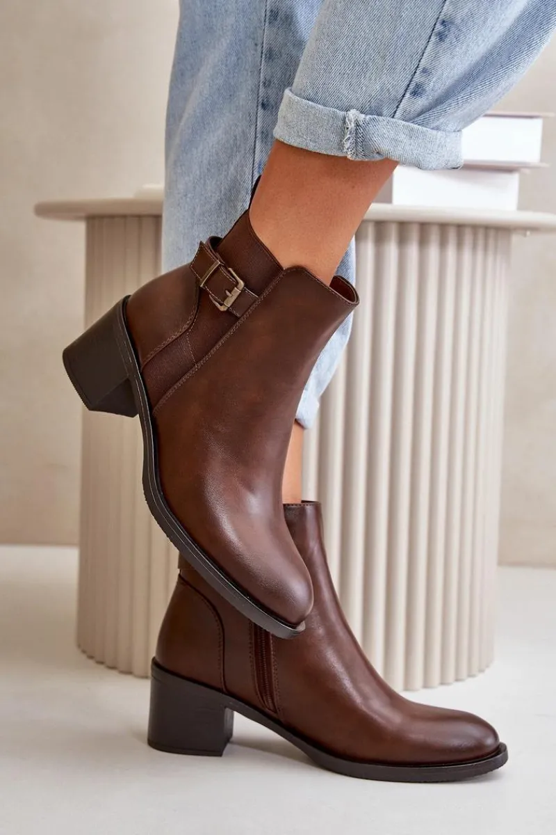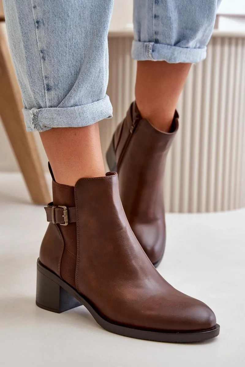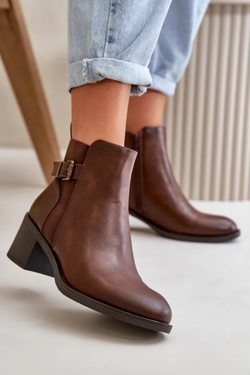 Botki damskie wykonane z eko skóry. Wnętrze ocieplone jest kocem obuwniczym, co zapewnia dodatkowe ciepło i komfort podczas chłodniejszych dni. Model zapinany na zamek, co ułatwia zakładanie i zdejmowanie, a także zapewnia doskonałe dopasowanie do stopy. Ozdobione detalem w postaci paseczka z klamrą. Idealne na jesienne i zimowe dni! Przy wyborze rozmiaru prosimy sugerować się tabelą rozmiarów.