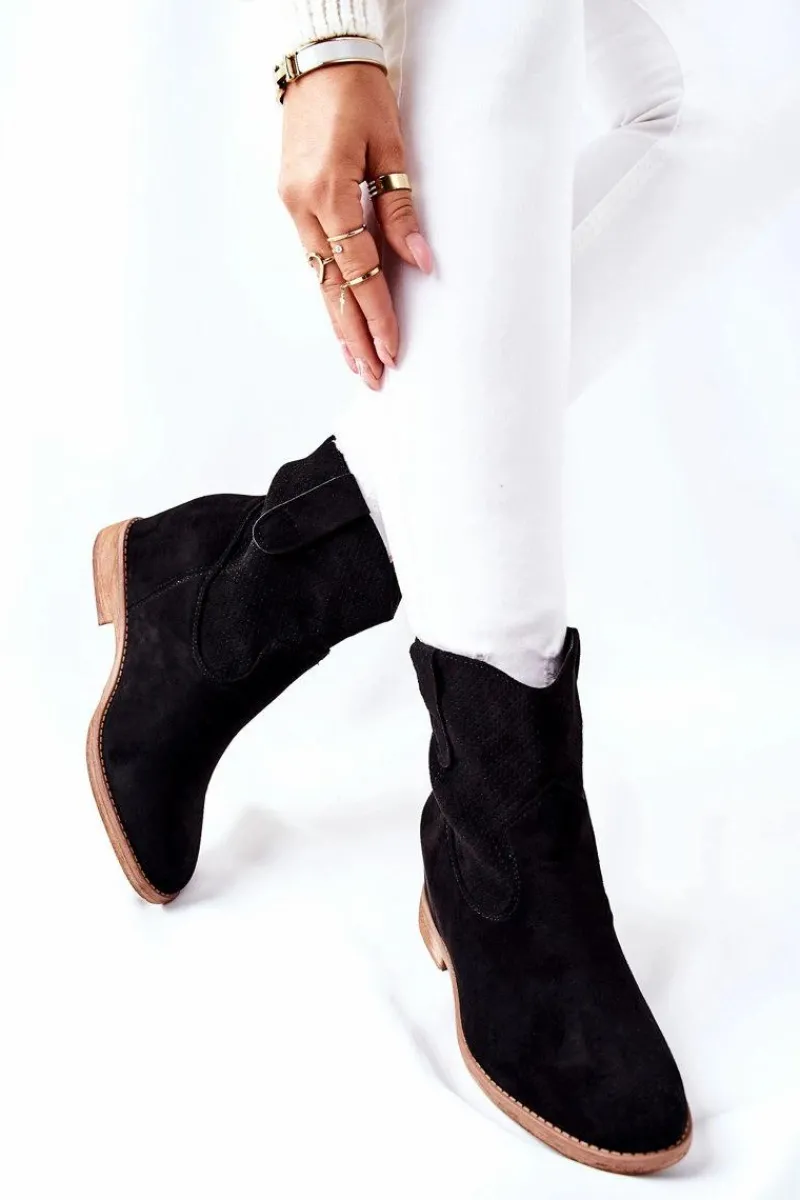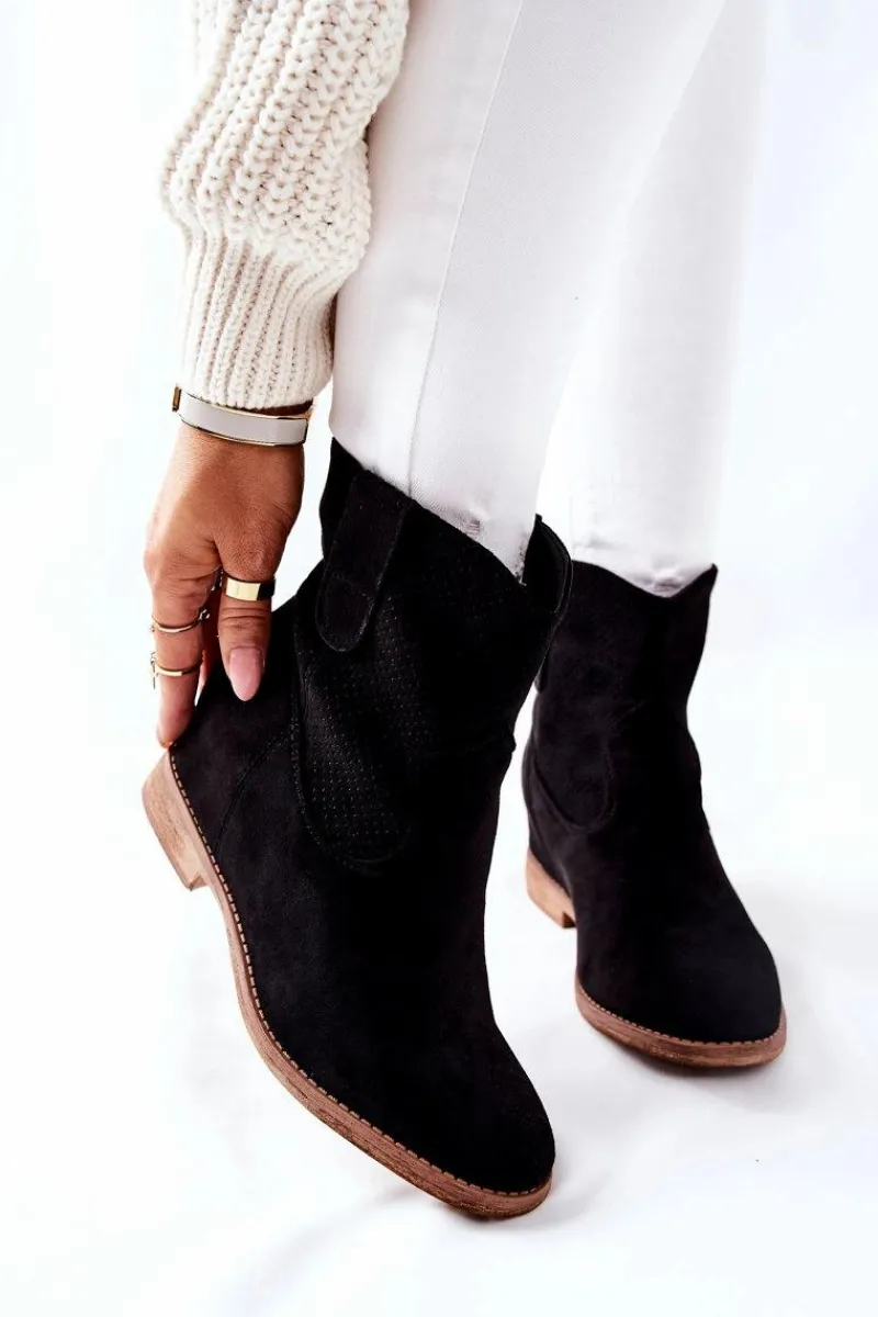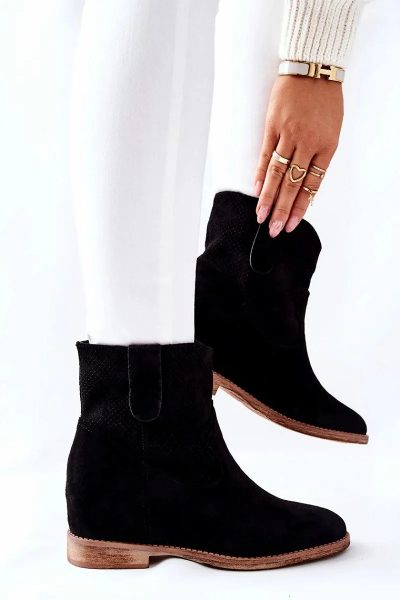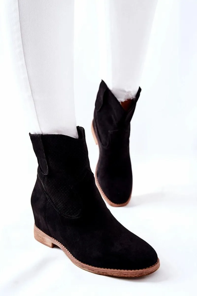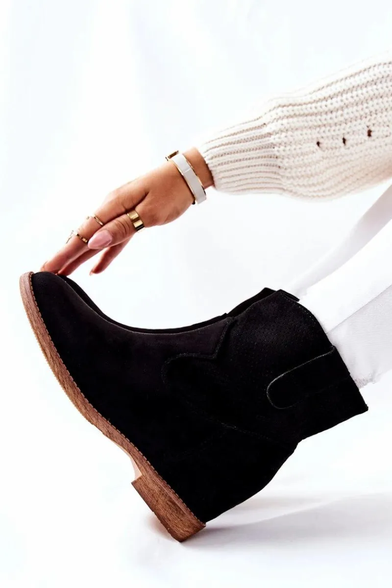 Wsuwane zamszowe botki. Wewnątrz znajduje się ukryty koturn. Idealne na jesień. Przy wyborze rozmiaru prosimy sugerować się tabelą rozmiarów.