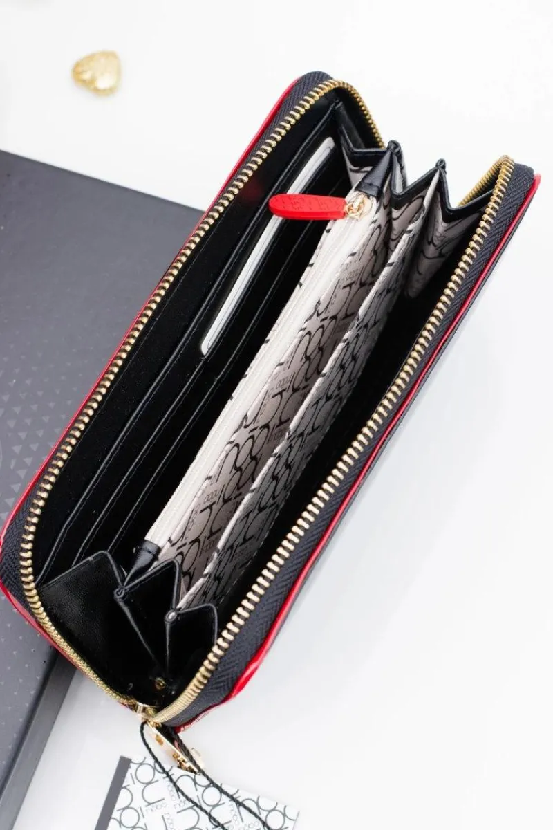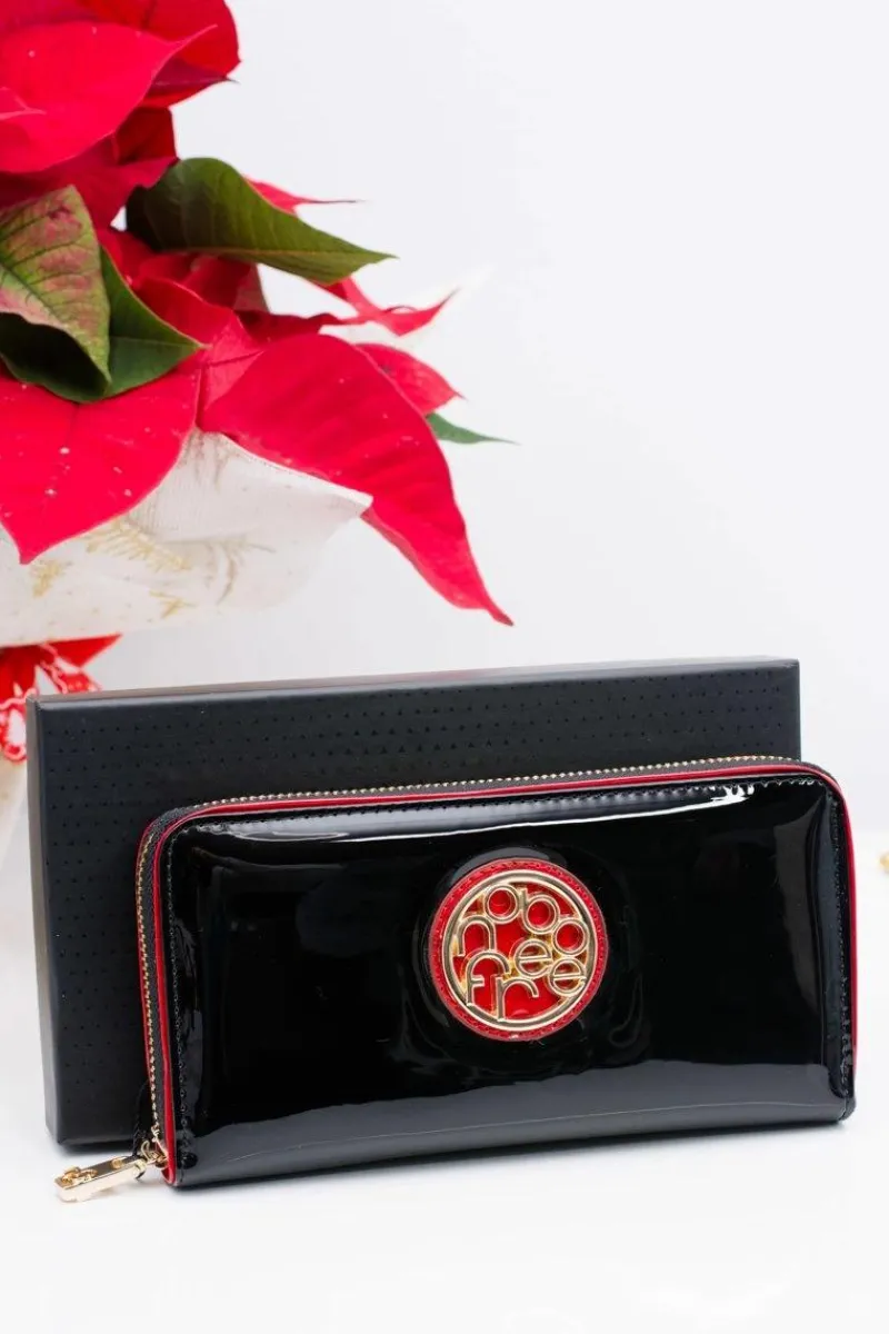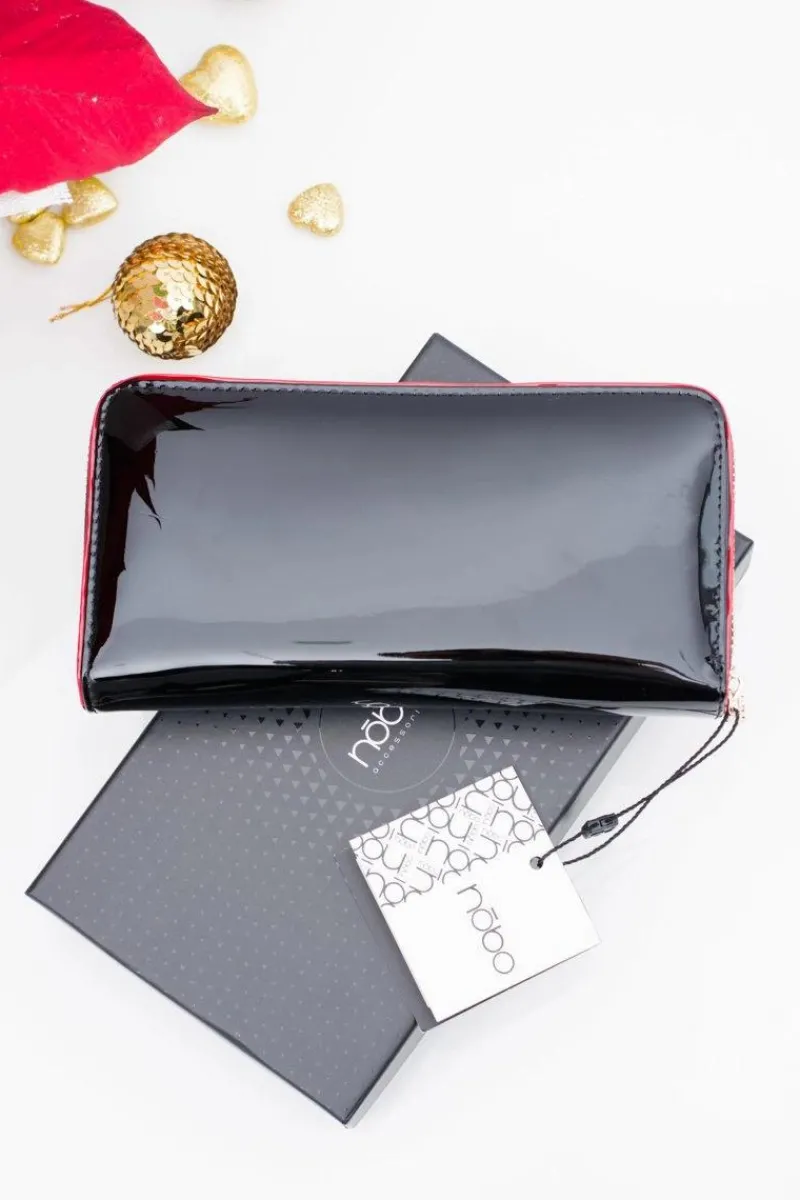 Dopełnieniem każdej kobiecej stylizacji jest nie tylko torebka i buty ale również dobrze dobrany portfel. Portfele renomowanej firmy NOBO są cenione przez wszystkie kobiety. Prezentowany model wykończony jest wysokiej jakości lakierowaną skórą ekologiczną. Portfel zapinany jest złoty suwak. Wewnątrz jednej przegródki znajduje się 8 kieszonek na karty, 1 duża zapinana na suwak komora na bilon oraz 2 dodatkowe przegródki na inne dokumenty.